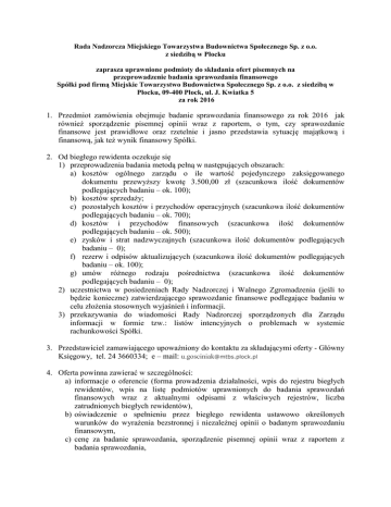 Rada Nadzorcza Miejskiego Towarzystwa Budownictwa Społecznego Sp. z o.o. z siedzibą w Płocku zaprasza uprawnione podmioty do składania ofert pisemnych na przeprowadzenie badania sprawozdania finansowego Spółki pod firmą Miejskie Towarzystwo Budownictwa Społecznego Sp. z o.o. z siedzibą w Płocku, 09-400 Płock, ul. J. Kwiatka 5 za rok 2016 1. Przedmiot zamówienia obejmuje badanie sprawozdania finansowego za rok 2016 jak również sporządzenie pisemnej opinii wraz z raportem, o tym, czy sprawozdanie finansowe jest prawidłowe oraz rzetelnie i jasno przedstawia sytuację majątkową i finansową, jak też wynik finansowy Spółki. 2. Od biegłego rewidenta oczekuje się 1) przeprowadzenia badania metodą pełną w następujących obszarach: a) kosztów ogólnego zarządu o ile wartość pojedynczego zaksięgowanego dokumentu przewyższy kwotę 3.500,00 zł (szacunkowa ilość dokumentów podlegających badaniu – ok. 100); b) kosztów sprzedaży; c) pozostałych kosztów i przychodów operacyjnych (szacunkowa ilość dokumentów podlegających badaniu – ok. 700); d) kosztów i przychodów finansowych (szacunkowa ilość dokumentów podlegających badaniu – ok. 500); e) zysków i strat nadzwyczajnych (szacunkowa ilość dokumentów podlegających badaniu – 0); f) rezerw i odpisów aktualizujących (szacunkowa ilość dokumentów podlegających badaniu – ok. 100); g) umów różnego rodzaju pośrednictwa (szacunkowa ilość dokumentów podlegających badaniu – 0); 2) uczestnictwa w posiedzeniach Rady Nadzorczej i Walnego Zgromadzenia (jeśli to będzie konieczne) zatwierdzającego sprawozdanie finansowe podlegające badaniu w celu złożenia stosownych wyjaśnień i informacji. 3) przekazywania do wiadomości Rady Nadzorczej sporządzonych dla Zarządu informacji w formie tzw.: listów intencyjnych o problemach w systemie rachunkowości Spółki. 3. Przedstawiciel zamawiającego upoważniony do kontaktu za składającymi oferty - Główny Księgowy, tel. 24 3660334; e – mail: [email protected] 4. Oferta powinna zawierać w szczególności: a) informacje o oferencie (forma prowadzenia działalności, wpis do rejestru biegłych rewidentów, wpis na listę podmiotów uprawnionych do badania sprawozdań finansowych wraz z aktualnymi odpisami z właściwych rejestrów, liczba zatrudnionych biegłych rewidentów), b) oświadczenie o spełnieniu przez biegłego rewidenta ustawowo określonych warunków do wyrażenia bezstronnej i niezależnej opinii o badanym sprawozdaniu finansowym, c) cenę za badanie sprawozdania, sporządzenie pisemnej opinii wraz z raportem z badania sprawozdania, d) łączną kwotę sum bilansowych badanych spółek towarzystw budownictwa społecznego za ostatnie pięć lat, e) określenie składu zespołu przeprowadzającego badanie, z wyszczególnieniem osób posiadających uprawnienia biegłego rewidenta, f) wstępny harmonogram wskazujący metody i terminy wstępnego i ostatecznego badania sprawozdania finansowego, g) wykaz badanych podmiotów w okresie ostatnich dwóch lat , h) projekt umowy. 5. Oferty składać należy w zamkniętej kopercie z adnotacją: „Oferta na badanie sprawozdania finansowego spółki” w sekretariacie Spółki pod adresem: Miejskie Towarzystwo Budownictwa Społecznego Sp. z o.o., 09-400 Płock, ul. J. Kwiatka 5 w terminie do 30 września 2016 r. 6. Oferty, które nie będą spełniały wymogów określonych w punktach 4, 5 oraz złożone po upływie terminu określonego do ich przyjmowania nie podlegają rozpatrzeniu. 7. Kryteria oceny i wyboru ofert . Ustala się dwa kryteria oceny ofert: 1) cenę oferty (od 0 do 100 punktów), 2) znajomość przez rewidenta branży w której działa spółka – towarzystwo budownictwa społecznego (od 0 do 100 punktów). Łączną ocenę punktową stanowi suma iloczynów punktów w poszczególnych kryteriach i przypisanych im procentowo znaczeń. Za ofertę najkorzystniejszą uznana zostanie oferta o najwyższej łącznej ocenie punktowej. Ad. 1) cena - znaczenie 70%. - dla ceny minimalnej 100 punktów cena najniższa spośród ofert x 100 - dla innej ceny = cena oferenta Ad.2) znajomość przez rewidenta branży w której działa spółka – towarzystwo budownictwa społecznego (wielkość sum bilansowych badanych spółek towarzystw budownictwa społecznego) – znaczenie 30%. - oferta z największym doświadczeniem (największe sumy bilansowe) otrzyma 100 punktów - dla innej sumy bilansowej = sumy bilansowe z oferty ocenianej x 100 sumy bilansowe z najlepszej oferty Łączna ilość punktów stanowi sumę iloczynów ocen w poszczególnych kryteriach i ich znaczeń. Wygrywa oferta, która otrzyma największą ilość punktów. Zamawiający udzieli zamówienia Wykonawcy, który uzyska najwyższą ilość punktów wyliczoną wg powyższego sposobu i spełni wszystkie warunki wymagane przez zamawiającego; cena zawarta w ofercie jest ceną ostateczną, 8. Termin realizacji zamówienia - 10 marca 2017 rok. 9. Otwarcie ofert nastąpi w siedzibie Spółki w dniu …04.10. 2016 r. 10. Dopuszcza się możliwość wspólnego składania ofert przez biegłych rewidentów prowadzących działalność gospodarczą we własnym imieniu i na własny rachunek, działających jako konsorcjum na podstawie umowy regulującej ich współpracę. 11. Rada Nadzorcza Miejskiego Towarzystwa Budownictwa Społecznego Sp. z o.o. w Płocku. zastrzega sobie prawo do swobodnego wyboru oferty, przedłużenia terminu składania ofert, negocjacji warunków umowy oraz odstąpienia od wyboru oferty bez podania przyczyny. 12. W postępowaniu może brać udział wyłącznie biegły rewident, który nie badał sprawozdania finansowego Spółki przez dwa kolejne lata.
