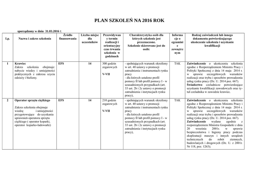 PLAN SZKOLEŃ NA 2016 ROK sporządzony w dniu 31.03.2016 r. Źródło finansowania Lp. Nazwa i zakres szkolenia 1 Krawiec Zakres szkolenia obejmuje: nabycie wiedzy i umiejętności praktycznych z zakresu szycia odzieży i bielizny. EFS Operator sprzętu ciężkiego EFS 2 Zakres szkolenia obejmuje wiedzę i umiejętności przygotowujące do uzyskania uprawnień operatora sprzętu ciężkiego ( operator koparki, operator koparko-ładowarki) Liczba miejsc dla uczestników 14 Przewidywan y termin realizacji i orientacyjny czas trwania szkolenia w godzinach 300 godzin zegarowych V-VII 14 210 godzin zegarowych V-VII Charakterystyka osób dla których szkolenie jest przeznaczone. Szkolenie skierowane jest do osób: Informa cje o egzamini e zewnętrz nym Rodzaj zaświadczeń lub innego dokumentu potwierdzającego ukończenie szkolenia i uzyskanie kwalifikacji - spełniających warunek określony w art. 40 ustawy o promocji zatrudnienia i instrumentach rynku pracy - dla których ustalono profil pomocy II lub profil pomocy I - w uzasadnionych przypadkach (art. 33 ust. 2b i 2c ustawy o promocji zatrudnienia i instytucjach rynku pracy), TAK Zaświadczenie o ukończeniu szkolenia zgodne z Rozporządzeniem Ministra Pracy i Polityki Społecznej z dnia 14 maja 2014 r. w sprawie szczegółowych warunków realizacji oraz trybu i sposobów prowadzenia usług rynku pracy (Dz. U. 2014 poz. 667). Świadectwo czeladnicze potwierdzające uzyskanie kwalifikacji zawodowych oraz tytuł czeladnika w zawodzie krawiec. - spełniających warunek określony w art. 40 ustawy o promocji zatrudnienia i instrumentach rynku pracy - dla których ustalono profil pomocy II lub profil pomocy I - w uzasadnionych przypadkach (art. 33 ust. 2b i 2c ustawy o promocji zatrudnienia i instytucjach rynku pracy), TAK Zaświadczenie o ukończeniu szkolenia zgodne z Rozporządzeniem Ministra Pracy i Polityki Społecznej z dnia 14 maja 2014 r. w sprawie szczegółowych warunków realizacji oraz trybu i sposobów prowadzenia usług rynku pracy (Dz. U. 2014 poz. 667). Zaświadczenie wydane zgodnie z rozporządzeniem Ministra Gospodarki z dnia 20 września 2001r. w sprawie bezpieczeństwa i higieny pracy podczas eksploatacji maszyn i innych urządzeń technicznych do robót ziemnych, budowlanych i drogowych (Dz. U. z 2001r. Nr 118, poz. 1263); 3 Kierowca operator wózka jezdniowego Zakres szkolenia obejmuje: obsługę wózka jezdniowego oraz zasady bezpiecznej wymiany butli gazowych. EFS 14 70 - spełniających warunek określony w art. 40 ustawy o promocji zatrudnienia i instrumentach rynku pracy - dla których ustalono profil pomocy II lub profil pomocy I - w uzasadnionych przypadkach (art. 33 ust. 2b i 2c ustawy o promocji zatrudnienia i instytucjach rynku pracy), TAK Zaświadczenie o ukończeniu szkolenia zgodne z Rozporządzeniem Ministra Pracy i Polityki Społecznej z dnia 14 maja 2014 r. w sprawie szczegółowych warunków realizacji oraz trybu i sposobów prowadzenia usług rynku pracy (Dz. U. 2014 poz. 667). Zaświadczenie kwalifikacyjne do obsługi urządzeń transportu bliskiego, świadectwo kwalifikacyjne uprawniające do zajmowania się eksploatacją urządzeń, instalacji i sieci na stanowisku eksploatacji w zakresie wymiany butli gazowych w wózkach jezdniowych (po zdaniu egzaminu/ów) 4 Kucharz Zakres szkolenia obejmuje: nabycie wiedzy i umiejętności praktycznych z zakresu przyrządzania potraw i sztuki kucharskiej oraz z zakresu organizowania i obsługi różnych form przyjęć okolicznościowych. EFS 14 300 godzin zegarowych - spełniających warunek określony w art. 40 ustawy o promocji zatrudnienia i instrumentach rynku pracy - dla których ustalono profil pomocy II lub profil pomocy I - w uzasadnionych przypadkach (art. 33 ust. 2b i 2c ustawy o promocji zatrudnienia i instytucjach rynku pracy), TAK Zaświadczenie o ukończeniu szkolenia zgodne z Rozporządzeniem Ministra Pracy i Polityki Społecznej z dnia 14 maja 2014 r. w sprawie szczegółowych warunków realizacji oraz trybu i sposobów prowadzenia usług rynku pracy (Dz. U. 2014 poz. 667). Świadectwo czeladnicze potwierdzające uzyskanie kwalifikacji zawodowych oraz tytuł czeladnika w zawodzie kucharz Szkolenie z zakresu umiejętności poszukiwania pracy. FP -nie posiadające umiejętności poszukiwania pracy. - dla których ustalono profil pomocy II lub profil pomocy I - w uzasadnionych przypadkach (art. 33 ust. 2b i 2c ustawy o promocji zatrudnienia i instytucjach rynku pracy), NIE Zaświadczenie o ukończeniu szkolenia zgodne z Rozporządzeniem Ministra Pracy i Polityki Społecznej z dnia 14 maja 2014 r. w sprawie szczegółowych warunków realizacji oraz trybu i sposobów prowadzenia usług rynku pracy (Dz. U. 2014 poz. 667). 5 V-VII 16 80 godzin zegarowych październik Sporządziła: W. Miazek