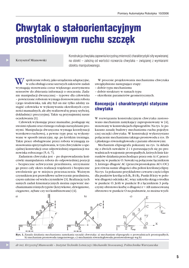 Pomiary Automatyka Robotyka 10/2006 Chwytak o stałoorientacyjnym prostoliniowym ruchu szczęk Krzysztof Mianowski Konstrukcja chwytaka zapewnia korzystną zmienność charakterystyki siły wywieranej na obiekt – zależną od wartości rozwarcia chwytaka – związanej z wymiarami obiektu manipulowanego. spółczesne roboty, jako urządzenia adaptacyjne, w celu obsługi coraz szerszych zakresów zadań wymagają stosowania coraz większego asortymentu sensorów do zbierania informacji o otoczeniu. Zadanie manipulacji dwuręcznej – typowe dla człowieka – powierzone robotom wymaga dostosowania robota i jego środowiska, tak aby był on nie tylko zdolny zastąpić człowieka w wykonywaniu określonych czynności manualnych, ale aby realizował tę pracę szybciej, dokładniej i precyzyjnej. Takie są przynajmniej nasze oczekiwania [1]. Człowiek wykonując prace manualne, posługuje się swoimi rękami oraz różnego rodzaju narzędziami prostymi. Manipulacja dwuręczna wymaga koordynacji wzrokowo-ruchowej, a pewne typy prac są wykonywane w sposób intuicyjny, np. po krótkim treningu. Takie prace obsługiwane przez robota wymagają zastosowania oprzyrządowania, w tym chwytaków o specjalnej konstrukcji oraz odpowiedniej organizacji stanowiska roboczego [5, 6, 7]. Zadaniem chwytaka jest – po doprowadzeniu końcówki manipulatora robota do odpowiedniej pozycji – bezpieczne uchwycenie przedmiotu, utrzymanie go przez cały okres realizacji trajektorii i bezpieczne uwolnienie go w miejscu przeznaczenia. Ważnym czynnikiem jest prawidłowe uchwycenie przedmiotu, często zależne od wielu czynników [3]. Realizację tych samych zadań kinematycznych można zapewnić mechanizmami różnych typów (krzywkowe, dźwigniowe, cięgnowe, zębate czy też kombinowane) [4]. a) b) W procesie projektowania mechanizmu chwytaka uwzględniono następujące etapy: – dobór typu mechanizmu – dobór struktury w ramach typu – określenie parametrów geometrycznych. Koncepcja i charakterystyki statyczne chwytaka W rozwiązaniu konstrukcyjnym chwytaka zastosowano mechanizm zamykający zaproponowany w [4], stosowany w konstrukcjach elipsografów. Na rys. 1c pokazano zasadę budowy mechanizmu ruchu pojedynczej szczęki chwytaka. W konstrukcji wykorzystano połączenie mechanizmu takiego prostowodu z rys. 1b i płaskiego równoległowodu z parami obrotowymi. Mechanizm elipsografu pokazany na rys. 1a składa się z dwóch suwaków 2 i 4 poruszających się po prowadnicach wzajemnie prostopadłych, których linie kierunków działania przechodzące przez osie A i C przecinają się w punkcie O. Suwaki są połączone łącznikiem 3, którego długość AC (przeciwprostokątna AO i OC) jest równa sumie długości obu półosi kreślonej elipsy. Na rys. 1a pokazano przykładowe czwarte części elips dla punktów kreślących B1, B i B2. Punkt B leży w połowie długości odcinka AC, więc zakreśla okrąg o środku w punkcie O. Jeśli w punkcie B z łącznikiem 3 połączymy obrotowo korbę o długości r = AB zamocowaną obrotowo w punkcie O na podstawie, to można wyelic) Rys. 1. Zasada działania mechanizmu zamykania szczęki chwytaka: a) mechanizm elipsografu o prowadnicach prostopadłych, b) mechanizm prostowodu tangensowego, c) mechanizm równoległowodu prostowodowego wg b) dr inż. Krzysztof Mianowski – Instytut Techniki Lotniczej i Mechaniki Stosowanej, Politechnika Warszawska 5 Pomiary Automatyka Robotyka 10/2006 minować suwak na prowadnicy pionowej, przy czym punkt C będzie nadal realizował ruch po linii prostej pionowej, jak pokazano na rys. 1b. Do tak rozwiązanego prostowodu dołączono równoległowód płaski równoległobokowy AD = CE i DE = AC =2r pokazany na rys. 1c. Napęd szczęki przesuwającej się w kierunku pionowym ze stałą orientacją kątową, związanej z odcinkiem CE jest realizowany przez poziomy przesuw suwaka 2. Stosując oznaczenia jak na rysunku, mamy: yC OC = = tg a x A OA Projektowany chwytak ma być przeznaczony do manipulacji kostką Rubika z możliwością oglądu pola operacyjnego, co wymaga wmontowania w chwytak kamery CCD w osi wzdłużnej chwytaka. Dlatego element prowadzący równoległowody płaskie szczęk rozdzielono na dwie części, oddzielne dla każdej szczęki, jak pokazano na rys. 3b; prowadnicę liniową stanowią tu ślizgacze teflonowe przesuwające się po zewnętrznej powierzchni korpusu chwytaka. Zakres kątowy a ruchu łączników każdej ze szczęk ograniczono konstrukcyjnie do przedziału kąta <30°, 65°>. Charakterystyki pokazane na rys. 2 również dotyczą tego przedziału. (1) Charakterystyka statyczna siły zaciskania szczęki Fzac (oddziaływania szczęki na obiekt w kierunku pionowym) w funkcji siły napędowej Fnap suwaka 2 przy braku sił tarcia jest określona zależnością wynikającą z zasady prac przygotowanych: Fzac dyC = Fnap dx A a) b) (2) stąd: Fzac = Fnap dx A y yC = Fnaptga = Fnap C = Fnap 2 dyC xA 4r − yC2 (3) Na podstawie tych zależności z uwzględnieniem właściwości układu napędowego oraz przy założonych granicznych wymiarach obiektów manipulowanych opracowano charakterystyki kinematyczne i statyczne chwytaka (rys. 2). Jak widać z zależności (3) i wykresu na rys. 2c siła zacisku szczęki wzrasta ze wzrostem rozwarcia chwytaka, co ma duże znaczenie praktyczne, gdyż jak wiadomo przy regularnych kształtach obiektów masa rośnie z trzecią potęgą wymiarów liniowych. Do napędu chwytaka zastosowano przekładnię śrubową oraz miniaturowe silniki z przekładniami zębatymi firmy MAXON. Przedstawione na rys. 2 charakterystyki graniczne uwzględniają właściwości całego układu napędowego [2]. Na rys. 3a pokazano podstawową koncepcję wyjściową opracowanego chwytaka. Prowadnicę liniową poziomą stanowi tutaj tuleja z popychaczem wewnętrznym przekazującym napęd do mechanizmu chwytaka. a) b) Rys. 2. Charakterystyki chwytaka: a), b) kinematyczne; c) statyczna 6 Rys. 3. Chwytak o p