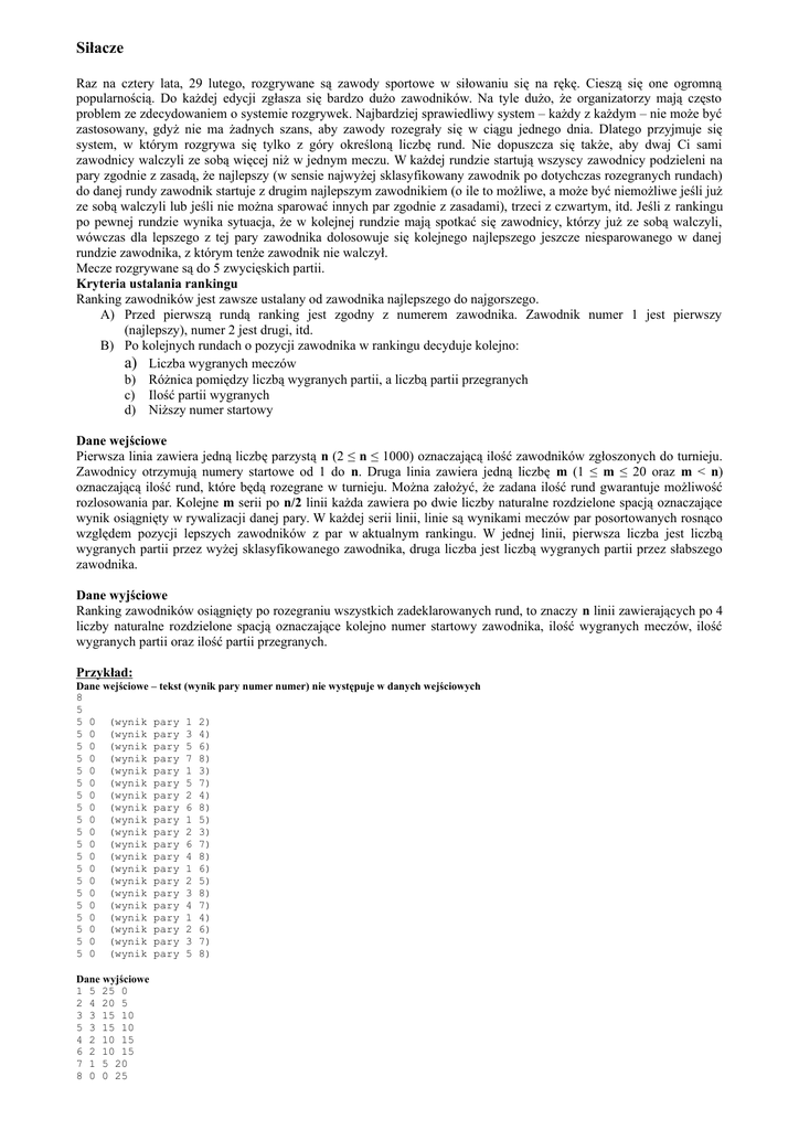 Siłacze Raz na cztery lata, 29 lutego, rozgrywane są zawody sportowe w siłowaniu się na rękę. Cieszą się one ogromną popularnością. Do każdej edycji zgłasza się bardzo dużo zawodników. Na tyle dużo, że organizatorzy mają często problem ze zdecydowaniem o systemie rozgrywek. Najbardziej sprawiedliwy system – każdy z każdym – nie może być zastosowany, gdyż nie ma żadnych szans, aby zawody rozegrały się w ciągu jednego dnia. Dlatego przyjmuje się system, w którym rozgrywa się tylko z góry określoną liczbę rund. Nie dopuszcza się także, aby dwaj Ci sami zawodnicy walczyli ze sobą więcej niż w jednym meczu. W każdej rundzie startują wszyscy zawodnicy podzieleni na pary zgodnie z zasadą, że najlepszy (w sensie najwyżej sklasyfikowany zawodnik po dotychczas rozegranych rundach) do danej rundy zawodnik startuje z drugim najlepszym zawodnikiem (o ile to możliwe, a może być niemożliwe jeśli już ze sobą walczyli lub jeśli nie można sparować innych par zgodnie z zasadami), trzeci z czwartym, itd. Jeśli z rankingu po pewnej rundzie wynika sytuacja, że w kolejnej rundzie mają spotkać się zawodnicy, którzy już ze sobą walczyli, wówczas dla lepszego z tej pary zawodnika dolosowuje się kolejnego najlepszego jeszcze niesparowanego w danej rundzie zawodnika, z którym tenże zawodnik nie walczył. Mecze rozgrywane są do 5 zwycięskich partii. Kryteria ustalania rankingu Ranking zawodników jest zawsze ustalany od zawodnika najlepszego do najgorszego. A) Przed pierwszą rundą ranking jest zgodny z numerem zawodnika. Zawodnik numer 1 jest pierwszy (najlepszy), numer 2 jest drugi, itd. B) Po kolejnych rundach o pozycji zawodnika w rankingu decyduje kolejno: a) Liczba wygranych meczów b) Różnica pomiędzy liczbą wygranych partii, a liczbą partii przegranych c) Ilość partii wygranych d) Niższy numer startowy Dane wejściowe Pierwsza linia zawiera jedną liczbę parzystą n (2 ≤ n ≤ 1000) oznaczającą ilość zawodników zgłoszonych do turnieju. Zawodnicy otrzymują numery startowe od 1 do n. Druga linia zawiera jedną liczbę m (1 ≤ m ≤ 20 oraz m < n) oznaczającą ilość rund, które będą rozegrane w turnieju. Można założyć, że zadana ilość rund gwarantuje możliwość rozlosowania par. Kolejne m serii po n/2 linii każda zawiera po dwie liczby naturalne rozdzielone spacją oznaczające wynik osiągnięty w rywalizacji danej pary. W każdej serii linii, linie są wynikami meczów par posortowanych rosnąco względem pozycji lepszych zawodników z par w aktualnym rankingu. W jednej linii, pierwsza liczba jest liczbą wygranych partii przez wyżej sklasyfikowanego zawodnika, druga liczba jest liczbą wygranych partii przez słabszego zawodnika. Dane wyjściowe Ranking zawodników osiągnięty po rozegraniu wszystkich zadeklarowanych rund, to znaczy n linii zawierających po 4 liczby naturalne rozdzielone spacją oznaczające kolejno numer startowy zawodnika, ilość wygranych meczów, ilość wygranych partii oraz ilość partii przegranych. Przykład: Dane wejściowe – tekst (wynik pary numer numer) nie występuje w danych wejściowych 8 5 5 0 (wynik pary 1 2) 5 0 (wynik pary 3 4) 5 0 (wynik pary 5 6) 5 0 (wynik pary 7 8) 5 0 (wynik pary 1 3) 5 0 (wynik pary 5 7) 5 0 (wynik pary 2 4) 5 0 (wynik pary 6 8) 5 0 (wynik pary 1 5) 5 0 (wynik pary 2 3) 5 0 (wynik pary 6 7) 5 0 (wynik pary 4 8) 5 0 (wynik pary 1 6) 5 0 (wynik pary 2 5) 5 0 (wynik pary 3 8) 5 0 (wynik pary 4 7) 5 0 (wynik pary 1 4) 5 0 (wynik pary 2 6) 5 0 (wynik pary 3 7) 5 0 (wynik pary 5 8) Dane wyjściowe 1 5 25 0 2 4 20 5 3 3 15 10 5 3 15 10 4 2 10 15 6 2 10 15 7 1 5 20 8 0 0 25 Agent B Sojusz Strategicznych Sił Reakcyjnych (SSSR) ciągle nie pozwala spać spokojnie agentom Sił Pokojowych. Nowy Plan przejęcia Władzy nad Światem, ukryty w najtajniejszym sejfie, w najtajniejszym schronie najtajniejszejszego budynku, w nieznanym miejscu stolicy Sojuszu nie jest jednak bezpieczny, dopóki agent Dżejms Błąd błąka się po ulicach. Pokonał on wszystkie zabezpieczenia i jest o krok od zdobycia Planu. Niestety, komputer był i jest wrogiem Dżejmsa – a Plan ukryty jest wśród zer i jedynek na twardym dysku Najtajniejszego Komputera SSSR. Ale jak się do niego dostać, jeżeli dostępna jest jedynie klawiatura i ekran? Dżejms już wie co zrobić. Wyciąga telefon satelitarny i wybiera numer... Właśnie dzwoni Twoja komórka. Odbierasz i słyszysz: "My name is Błąd, Dżejms Błąd. Help me, please!" UWAGA: Maszyna wirtualna do zadania do pobrania ze strony RKI Zadania do wykonania UWAGA: - proszę używać poleceń systemowych - system ma prymitywne zabezpieczenia (a nawet błędną konfigurację), więc aby wykonać wszystkie zadania trzeba je odnaleźć i się ich pozbyć - polecenia wykonywać z uprawnieniami użytkownika root 1. Dostać się do systemu (do dyspozycji jest tylko klawiatura, nie ma dostępu do CD-ROMu, USB i innych urządzeń) 2. Znaleźć pliki xxx.cpp i yy.cpp, połączyć ze sobą tworząc plik xxxyy.cpp, gdzie xxx – pierwsze trzy litery miesiąca Twojego urodzenia (małe i bez polskich znaków), yy – końcowe cyfry roku Twojego urodzenia i skopiować do katalogu domowego użytkownika root 3. Pobrać ze strony http://ii.uwb.edu.pl/rkinfor/e2015/dane/ plik o nazwie xxx.test (znaczenie xxx jw.) do katalogu domowego użytkownika root (linki do plików nie są umieszczone na stronie) 4. Porównać ze sobą zawartość plików – różniące się linie przesłać do pliku out.txt w katalogu domowym użytkownika root (jeśli plik nie istnieje, należy go utworzyć) 5. Skompilować plik xxxyy.cpp i uruchomić podając jako parametry xxx i yy – wynik działania dodać do pliku out.txt 6. Zrestartować komputer 7. Uruchomić skrypt o nazwie end z poziomu katalogu domowego użytkownika root 8. Wynikowy plik out.txt jest rozwiązaniem zadania Tajne przez poufne Dzięki Tobie Najtajniejszy Komputer SSSR już działa należyc