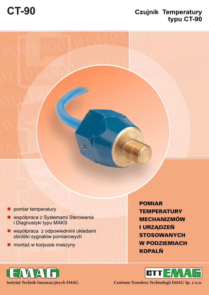 CT-90 n pomiar temperatury Czujnik Temperatury typu CT-90 POMIAR TEMPERATURY n współpraca z Systemami Sterowania i Diagnostyki typu MAKS MECHANIZMÓW n współpraca z odpowiednimi układami obróbki sygnałów pomiarowych STOSOWANYCH n montaż w korpusie maszyny Instytut Technik Innowacyjnych EMAG I URZĄDZEŃ W PODZIEMIACH KOPALŃ Centrum Transferu Technologii EMAG Sp. z o.o. CT-90 informacje techniczne Czujnik CT-90 do pomiaru temperatury mechanizmów urządzeń stosowanych w podziemiach kopalń. Może współpracować z odpowiednimi układami obróbki sygnałów pomiarowych zapewniającym iskrobezpieczeństwo czujnika przez zasilanie z obwodu iskrobezpiecznego metrologiczne - zakres pomiarowy - maksymalna temperatura pracy +5 ÷ +100°C elektryczne - sygnał pomiarowy - dopuszczalne parametry wejściowe mechaniczne - gabaryty - mocowanie - masa U20 = 580 mV ±5% dla temp. 20°C przy In=0,5 mA U100 = 370 mV ±5% dla temp. 100°C przy In=0,5 mA Ui = 6,3 V DC, Pi = 25 mW 41 × 30 mm M12 × 1,5 mm głębokość otworu 14 mm 250 G warunki pracy - temperatura otoczenia - wilgotność względna - wibracje sinusoidalne - położenie w czasie pracy +5 ÷ +40°C do 100% (0-55 Hz) / amplituda Ł 0,35 mm dowolne Stopień ochrony obudowy IP 54 Rodzaj budowy przeciwwybuchowej Certyfikat badania typu WE I M1 EEx ia I ATEX Znak zgodności ZAMÓWIENIA: Centrum Transferu Technologii EMAG Sp. z o.o. 40-189 Katowice, ul. Leopolda 31 tel. 32 2007 873, 32 2007 884 fax. 32 2007 883, www.cttemag.pl, e-mail: [email protected]