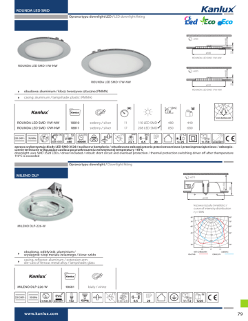 ROUNDA LED SMD Oprawa typu downlight LED / LED downlight fitting 19 min 60 ø165 ø180 ROUNDA LED SMD 11W-NW ROUNDA LED SMD 11W-NW ROUNDA LED SMD 17W-NW 19 min 60 ø225 ø240 ROUNDA LED SMD 17W-NW obudowa: aluminium / klosz: tworzywo sztuczne (PMMA) casing: aluminum / lampshade: plastic (PMMA) www.kanlux.com ROUNDA LED SMD 11W-NW 18810 srebrny / silver 11 110 LED SMD 480 440 ROUNDA LED SMD 17W-NW 18811 srebrny / silver 17 208 LED SMD 850 680 220-240V~ 50/60Hz 4000-4500 ≥80 40000 2x1 0,5 20 1/-/50 5÷25 oprawa wykorzystuje diody LED SMD 3528 / zasilacz w komplecie / wbudowane zabezpieczenie przeciwzwarciowe i przeciwprzeciążeniowe / zabezpieczenie termiczne wyłączające zasilacz po przekroczeniu wewnętrznej temperatury 110°C downlight uses SMD 3528 LEDs / driver included / inbuilt short circuit and overload protection / thermal protection switching driver off after themperature 110°C is exceeded Oprawa typu downlight / Downlight fitting MILENO DLP min 150 100 ø215 ø230 krzywa rozsyłu światłości / curve of intensity distribution η = 58% MILENO DLP-226-W obudowa, odbłyśnik: aluminium / wysięgnik: stop metalu żelaznego / klosz: szkło casing, reflector: aluminum / extension arm: die-cast of ferrous metal alloy / lampshade: glass MILENO DLP-226-W 220-240V~ 18681 biały / white EVG 50/60Hz 2 x max 26 www.kanlux.com 3 x (1-2,5) 0,5 20 1/-/12 1220 79