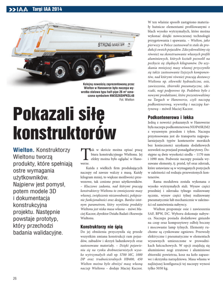 Targi IAA 2014 Kolejną nowością zaprezentowaną przez Wielton w Hanowerze była naczepa wywrotka stalowa typu half-pipe 26 m3 oznaczona symbolem NW3S26SHPKSL48 Fot. Wielton Pokazali siłę konstruktorów Wielton. Konstruktorzy Wieltonu tworzą produkty, które spełniają ostre wymagania użytkowników. Najpierw jest pomysł, potem modele 3D i dokumentacja konstrukcyjna projektu. Następnie powstaje prototyp, który przechodzi badania walidacyjne. 26 T ak w skrócie można opisać pracę biura konstrukcyjnego Wieltonu. Jej efekty można było oglądać w Hano- werze. Każda z wielkich firm produkujących naczepy od zawsze walczy z masą. Każdy kilogram mniej, to większe możliwości przewozowe, tak cenione przez użytkowników. – Kluczowe zadania, nad którymi pracują konstruktorzy Wieltonu to zmniejszenie masy własnej, zwiększenie niezawodności, polepszenie funkcjonalności oraz design. Bardzo istotnym parametrem, który wyróżnia produkty Wieltonu jest niska masa własna – mówi Maciej Kaczor, dyrektor Działu Badań i Rozwoju Wieltonu. Konstruktorzy nie śpią Do jej obniżenia przyczyniła się przede wszystkim zmiana konstrukcji ram pojazdów, zabudów i skrzyń ładunkowych oraz zastosowane materiały. – Dzięki pojawieniu się na rynku drobnoziarnistych wysoko wytrzymałych stali np. S700 MC, 1000 DP oraz trudnościeralnych HB400, 450 Wielton można było obniżyć masę własną naczep Wieltonu – dodaje Maciej Kaczor. W ten właśnie sposób zastąpiono materiały hutnicze elementami profilowanymi z blach wysoko wytrzymałych, które można wykonać dzięki nowoczesnej technologii przygotowania i spawania. – Wielton, jako pierwszy w Polsce zastosował te stale do produkcji swoich pojazdów. Zdecydowaliśmy się również na skonstruowanie własnych profili aluminiowych, których kształt pozwolił na pozbycie się zbędnych kilogramów. Do uzyskania mniejszej masy własnej przyczyniło się także zastosowanie lżejszych komponentów, nad którymi również pracują dostawcy Wieltonu np. siłowniki hydrauliczne, osie, zawieszenia, zbiorniki pneumatyczne, zderzaki, nogi podporowe itp. Podobnie było z nowymi produktami, które prezentowaliśmy na Targach w Hanowerze, czyli naczepą podkontenerową, wywrotką i naczepą kurtynową – mówił Maciej Kaczor. Podkontenerowa i lekka Jedną z nowości pokazanych w Hanowerze była naczepa podkontenerowa NS3P45R2M2 z wysuwnym przodem i tyłem. Naczepa przystosowana jest do transportu najpopularniejszych typów kontenerów morskich bez konieczności uzyskania dodatkowych zezwoleń na przejazd ponadgabarytowy. Dostępne są dwie wysokości siodła – 1170 mm i 1090 mm. Podwozie naczepy posiada wysuwane elementy, tj. przód, tył oraz zderzak, które ustawiane są w wymaganych pozycjach w zależności od rodzaju przewożonych kontenerów. Rama modułowa została wykonana z wysoko wytrzymałych stali. Wysuw części przedniej i zderzaka tylnego realizowany ręcznie, wysuw części tylnej realizowany pneumatycznie lub mechanicznie w zależności od zamówienia nabywcy. Wielton proponuje osie i zawieszenia SAF, BPW, DC. Wyboru dokonuje nabywca. Naczepa posiada dodatkowe gniazdo na czop oraz kompozytowy odbój boczny i mocowanie lamp tylnych. Elementy ruchome są cynkowane ogniowo. Przewody elektryczne i pneumatyczne w elementach wysuwnych umieszczone w prowadnikach łańcuchowych. W opcji znajdują się aluminiowe nogi zrzutowe i aluminiowe zbiorniki powietrza, kosz na koło zapasowe i skrzynka narzędziowa. Masa własna w najlżejszej konfiguracji tej naczepy wynosi tylko 5050 kg. Naczepa kurtynowa typu MEGA RYNNA do przewozu intermodalnego Mega Rynna na wagon Kolejnym pojazdem prezentowanym przez Wielton była naczepa kurtynowa typu MEGA RYNNA do przewozu intermodalnego. Jej głównym zastosowaniem jest przewóz m. in. stali w kręgach. Wysokość siodła w wagonie wynosi 88 cm. Pojazd posiada certyfikat zgodności z wymaganiami UE – CoC (Certificate of Conformity), certyfikat XL wg EN-12642, a także certyfikaty na przewóz napojów, opon, stali w arkuszach i kręgach. Konstrukcja podwozia została przystosowana do transportu na wagonach typu: e, f, g, i. Ramę wykonano ze stali o wysokiej wytrzymałości S700, natomiast podłogę ze sklejki wodoodpornej o podwyższonej wytrzymałości (30 mm). Zainstalowano 4 punkty chwytania „grab handles” (po 2 na stronę) umożliwiające pionowy załadunek naczepy na wagon oraz prom, oznaczone żółtym kolorem na bokach naczepy (zgodnie z normą UIC 596-5). Na każdej stronie jest po 4 uchwyty promowe umożliwiające zabezpieczenie naczepy na promie. Zastosowano także zawieszenie rozłączne dedykowane do załadunku pionowego. Podnoszony tylny zderzak ze wspomaganiem składa się po kontakcie z przeszkodą i zabezpiecza przed uszkodzeniem podczas osadzania naczepy w wagonie, czy podczas manewrowania na terminalach załadunkowych lub w trakcie wjazdu na prom. Plandeka boczna posiada 24 klamry z podwójnym zabezpieczeniem i oznaczona jest numerem identyfikacyjnym ILU. Naczepa jest wyposażona w 5-tonowe uchwyty mocowania ładunku, po 7 sztuk na stronę oraz 14 par 2-tonowych uchwytów wewnątrz naczepy w zależności od zamówienia. Dodatkowo obrzeże boczne wyposażone w system „safety lock” do zabezpieczenia ładunku. Są także 4 dodatkowe miejsca do montażu kłonic. Wytrzymałość konstrukcji potwierdzona została przez zewnętrzną jednostkę certyfikującą TUV Nord, a dopuszczenie naczepy do transportu koleją zrealizowano z firmą DB Schenker. Naczepę można wyposażyć w osie i zawieszenie SAF lub BPW, o obciążeniu technicznym 9000 kg, felgi stalowe lub aluminiowe z ogumieniem 445/45 19,5’’ w zależności od zamówienia. Pojazd posiada dwuzakresowe nogi podporowe JOST. Wzmocniona tablica przyłączeniowa zamontowana jest na ścianie przedniej i chroniona gumowymi odbojami (wymagania Ro-Ro). 4 gniazda i 4 słupy pionowe znajdują się w przedniej części 