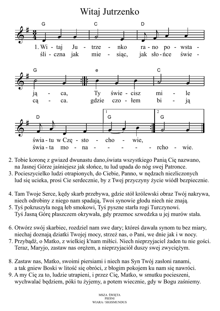 Witaj Jutrzenko # 3 G & 4 œ œ œ ˙ œ Ju - trze 1. Wi - taj śli - czna jak mie & # G & # œ - .. .. œ ca, ca. j œj œ œ Ty gdzie C œ œ ˙ świe - cisz czo - łem świa - tu w Czę - sto świa - ta mo - na - - le ją 2 G œ œ mi bi 1 D œ ra - no po - wsta jak sło - ńce świe - - nko - siąc, e ˙ ją cą j œj œ œ D C œ œ cho - - œ .. G ˙ œ wie, - rcho - wie. 2. Tobie koronę z gwiazd dwunastu dano,świata wszystkiego Panią Cię nazwano, na Jasnej Górze jaśniejesz jak słońce, tu lud upada do nóg swej Patronce. 3. Pocieszycielko ludzi otrapionych, do Ciebie, Panno, w nędzach niezliczonych lud się ucieka, prosi Cie serdecznie, by z Twej przyczyny życie wiódł bezpiecznie. 4. Tam Twoje Serce, kędy skarb przebywa, gdzie stół królewski obraz Twój nakrywa, niech odrobiny z niego nam spadają, Twoi synowie głodu niech nie znają. 5. Tyś pokruszyła nogą łeb smokowi, Tyś pyszne starła rogi Turczynowi. Tyś Jasną Górę płaszczem okrywała, gdy przemoc szwedzka u jej murów stała. 6. Otwórz swój skarbiec, rozdziel nam swe dary; któreś dawała synom tu bez miary, niechaj doznają dziatki Twojej mocy, strzeż nas, o Pani, we dnie jak i w nocy. 7. Przybądź, o Matko, z wielkiej k'nam miłści. Niech nieprzyjaciel żaden tu nie gości. Teraz, Maryjo, zastaw nas orężem, a nieprzyjaciół duszy swej zwyciężym. 8. Zastaw nas, Matko, swoimi piersiami i niech nas Syn Twój zasłoni ranami, a tak gniew Boski w litość się obróci, z błogim pokojem ku nam się nawróci. 9. A my Cię za to, ludzie utrapieni, i przez Cię, Matko, w smutku pocieszeni, wychwalać będziem, póki tu żyjemy, a potem wiecznie, gdy w Bogu zaśniemy. MSZA ŚWIĘTA PIEŚNI WIARA / SIGISMUNDUS