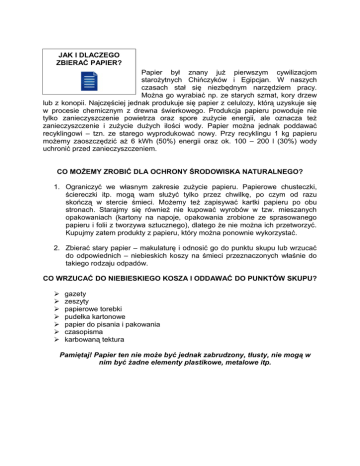 JAK I DLACZEGO ZBIERAĆ PAPIER? Papier był znany już pierwszym cywilizacjom starożytnych Chińczyków i Egipcjan. W naszych czasach stał się niezbędnym narzędziem pracy. Można go wyrabiać np. ze starych szmat, kory drzew lub z konopii. Najczęściej jednak produkuje się papier z celulozy, którą uzyskuje się w procesie chemicznym z drewna świerkowego. Produkcja papieru powoduje nie tylko zanieczyszczenie powietrza oraz spore zużycie energii, ale oznacza też zanieczyszczenie i zużycie dużych ilości wody. Papier można jednak poddawać recyklingowi – tzn. ze starego wyprodukować nowy. Przy recyklingu 1 kg papieru możemy zaoszczędzić aż 6 kWh (50%) energii oraz ok. 100 – 200 l (30%) wody uchronić przed zanieczyszczeniem. CO MOŻEMY ZROBIĆ DLA OCHRONY ŚRODOWISKA NATURALNEGO? 1. Ograniczyć we własnym zakresie zużycie papieru. Papierowe chusteczki, ściereczki itp. mogą wam służyć tylko przez chwilkę, po czym od razu skończą w stercie śmieci. Możemy też zapisywać kartki papieru po obu stronach. Starajmy się również nie kupować wyrobów w tzw. mieszanych opakowaniach (kartony na napoje, opakowania zrobione ze sprasowanego papieru i folii z tworzywa sztucznego), dlatego że nie można ich przetworzyć. Kupujmy zatem produkty z papieru, który można ponownie wykorzystać. 2. Zbierać stary papier – makulaturę i odnosić go do punktu skupu lub wrzucać do odpowiednich – niebieskich koszy na śmieci przeznaczonych właśnie do takiego rodzaju odpadów. CO WRZUCAĆ DO NIEBIESKIEGO KOSZA I ODDAWAĆ DO PUNKTÓW SKUPU? gazety zeszyty papierowe torebki pudełka kartonowe papier do pisania i pakowania czasopisma karbowaną tektura Pamiętaj! Papier ten nie może być jednak zabrudzony, tłusty, nie mogą w nim być żadne elementy plastikowe, metalowe itp. CZEGO NIE MOŻEMY WRZUCAĆ DO NIEBIESKIEGO KOSZA ANI ODDAWAĆ DO PUNKTU SKUPU? tłustego papieru opakowań po lodach kartoników po napojach (Tetrapack, Variopack) celofanu plastikowych kubeczków i innych naczyń papieru z folią plastikową (opakowania po kawie, kaszkach dla dzieci) tapet kalki taśm klejących CO SIĘ PRODUKUJE ZE STAREGO PAPIERU? Stary papier – makulatura, w fabrykach papieru używany jest do produkcji wielu wyrobów. Często w sklepach możecie spotkać się z zeszytami, książkami zrobionymi w całości z papieru pochodzącego z recyklingu. Papier taki nie jest zupełnie biały, gdyż zawiera on kolory i czerń np. ze starych gazet lub czasopism. Jednak większość produktów zawiera znikome ilości starego papieru. Z makulatury wyrabia się również izolację cieplną.