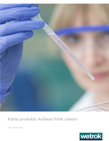 Karta produktu Antiwax forte classic V 02 / 06.07.2016 Karta produktu Wetrok Antiwax forte classic Środek do mycia zasadniczego / przemysłowy środek czyszczący Korzyści: Wydajny środek do mycia zasadniczego i przemysłowy środek czyszczący. Idealny do usuwania oleju, tłuszczu i zanieczyszczeń przemysłowych. Nadaje się do czyszczenia nielakierowanych podłóg drewnianych. Nadaje się do usuwania powłok polimerowych i woskowych. Zastosowanie: Do czyszczenia zmywalnych, odpornych na działanie rozpuszczalników powierzchni i wykładzin podłogowych (PCW, kamień naturalny i sztuczny, klinkier itd.). Warto wiedzieć: Do czyszczenia powierzchni lakierowanych lub elastomerów (guma, kauczuk) stosować roztwór o maks. stężeniu 5%. Właściwości: słabo pieniący lekko alkaliczny zawiera rozpuszczalnik pH koncentratu: Główne składniki: środki-powierzchniowo czynne, rozpuszczalnik, mydło Dozowanie: Czyszczenie regularne 0,05 l – 0,1 l w 10 l Czyszczenie okresowe 0,1 l – 0,2 l w 10 l Przechowywanie / trwałość: Przechowywać w oryginalnym opakowaniu, w chłodnym, dobrze wentylowanym miejscu. Chronić przed mrozem. Nieużywany pojemnik przechowywać zamknięty. Trwałość (nieotwarte opakowanie): 24 miesiące. Zalecane metody użycia: Czyszczenie zasadnicze Wycieranie na mokro (ręczne) Umyć podłogę w celu związania kurzu lub odkurzyć na sucho. Zanurzyć mop w 3 l – 5 l w 10 l roztworze czyszczącym, dobrze wycisnąć, wytrzeć wykładzinę podłogową na mokro. Usuwanie wosku 1 l – 3 l w 10 l Szorowanie z odsysaniem Napełnić zbiornik na świeżą wodę roztworem czyszczącym. Usunąć luźne zanieczyszczenia i umyć wykładzinę podłogową w celu związania kurzu / odkurzyć na sucho. Dokładnie wyszorować wykładzinę podłogową szorowarką z odpowiednim padem / szczotką. Czyszczenie zasadnicze Usunąć luźne zanieczyszczenia i umyć wykładzinę podłogową w celu związania kurzu / odkurzyć na sucho. Roztwór środka czyszczącego nanieść na wykładzinę podłogową, pozostawić na ok. 15 minut, nie pozostawiać do wyschnięcia! Wyszorować na mokro szorowarką jednotarczową / automatyczną z odpowiednim padem / szczotką. Pozostawić ponownie na 10 minut. Nie pozostawiać do wyschnięcia! Odessać rozpuszczoną powłokę / zabrudzenie. Następnie dobrze spłukać wykładzinę podłogową czystą wodą (do ok. pH 7). Wetrok AG, CH-8302 Kloten, Tel. +41 43 255 51 51 Wetrok Austria GmbH, A-1230 Wien, Tel. 0800 20 48 68 Wetrok GmbH, D-51381 Leverkusen, Tel. +49 2171 398-0 Wetrok Polska S.A., PL-02-820 Warszawa, Tel. +48 22 331 20 50 Wetrok AB, SE-192 79 Sollentuna, Tel. +46 8 444 34 00