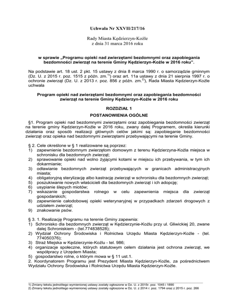 Uchwała Nr XXVII/217/16 Rady Miasta Kędzierzyn-Koźle z dnia 31 marca 2016 roku w sprawie „Programu opieki nad zwierzętami bezdomnymi oraz zapobiegania bezdomności zwierząt na terenie Gminy Kędzierzyn-Koźle w 2016 roku”. Na podstawie art. 18 ust. 2 pkt. 15 ustawy z dnia 8 marca 1990 r. o samorządzie gminnym (Dz. U. z 2015 r. poz. 1515 z późn. zm.1)) oraz art. 11a ustawy z dnia 21 sierpnia 1997 r. o ochronie zwierząt (Dz. U. z 2013 r. poz. 856 z późn. zm.2)), Rada Miasta Kędzierzyn-Koźle uchwala Program opieki nad zwierzętami bezdomnymi oraz zapobiegania bezdomności zwierząt na terenie Gminy Kędzierzyn-Koźle w 2016 roku ROZDZIAŁ 1 POSTANOWIENIA OGÓLNE §1. Program opieki nad bezdomnymi zwierzętami oraz zapobiegania bezdomności zwierząt na terenie gminy Kędzierzyn-Koźle w 2016 roku, zwany dalej Programem, określa kierunki działania oraz sposób realizacji głównych celów jakimi są: zapobieganie bezdomności zwierząt oraz opieka nad bezdomnymi zwierzętami przebywającymi na terenie Gminy. § 2. Cele określone w § 1 realizowane są poprzez: 1) zapewnienie bezdomnym zwierzętom domowym z terenu Kędzierzyna-Koźla miejsca w schronisku dla bezdomnych zwierząt; 2) sprawowanie opieki nad wolno żyjącymi kotami w miejscu ich przebywania, w tym ich dokarmianie; 3) odławianie bezdomnych zwierząt przebywających w granicach administracyjnych miasta; 4) obligatoryjną sterylizację albo kastrację zwierząt w schronisku dla bezdomnych zwierząt; 5) poszukiwanie nowych właścicieli dla bezdomnych zwierząt i ich adopcję; 6) usypianie ślepych miotów; 7) wskazanie gospodarstwa rolnego w celu zapewnienia miejsca dla zwierząt gospodarskich; 8) zapewnienie całodobowej opieki weterynaryjnej w przypadkach zdarzeń drogowych z udziałem zwierząt; 9) znakowanie psów. § 3. 1. Realizację Programu na terenie Gminy zapewnia: 1) Schronisko dla bezdomnych zwierząt w Kędzierzynie-Koźlu przy ul. Gliwickiej 20, zwane dalej Schroniskiem - (tel.774838528); 2) Wydział Ochrony Środowiska i Rolnictwa Urzędu Miasta Kędzierzyn-Koźle - (tel. 774050376); 3) Straż Miejska w Kędzierzynie-Koźlu - tel. 986; 4) organizacje społeczne, których statutowym celem działania jest ochrona zwierząt, we współpracy z Urzędem Miasta; 5) gospodarstwo rolne, o którym mowa w § 11 ust.1. 2. Koordynatorem Programu jest Prezydent Miasta Kędzierzyn-Koźle, za pośrednictwem Wydziału Ochrony Środowiska i Rolnictwa Urzędu Miasta Kędzierzyn-Koźle. _________________________________________________________________________________________________ 1) Zmiany tekstu jednolitego wymienionej ustawy zostały ogłoszone w Dz. U. z 2015r. poz. 1045 i 1890 2) Zmiany tekstu jednolitego wymienionej ustawy zostały ogłoszone w Dz. U. z 2014 r. poz. 1794 oraz z 2015 r. poz. 266 ROZDZIAŁ 2 SPOSÓB REALIZACJI ZADAŃ § 4. Zadania, o których mowa w § 2. pkt. 1 i pkt. 3-6 oraz § 12 ust. 1 w zakresie zwierząt bezdomnych realizowane są przez Schronisko. § 5. Zapewnienie bezdomnym zwierzętom schronienia jest realizowane poprzez: 1) umieszczenie w schronisku bezdomnych zwierząt domowych, odłowionych na terenie miasta; 2) umieszczenie w gospodarstwie rolnym, o którym mowa w § 11 bezdomnych zwierząt gospodarskich. § 6.1 Opieka nad wolno żyjącymi kotami realizowana jest we współpracy z organizacjami społecznymi, których statutowym celem działania jest ochrona zwierząt i polega w szczególności na: 1) ustalaniu miejsc, w których przebywają koty wolno żyjące; 2) dokarmianiu kotów wolno żyjących w miejscu ich przebywania; 3) zapewnianiu opieki rannym lub chorym kotom wolno żyjącym; 4) podejmowaniu interwencji, w związku z faktem złego traktowania tych zwierząt. 2. Zasady współpracy z organizacjami społecznymi, których statutowym celem działania jest ochrona zwierząt oraz finansowania zadań wymienionych w ust. 1 pkt. 1 i 2 określa każdorazowo umowa zawarta w myśl ustawy z dnia 24 kwietnia 2003 r. o działalności pożytku publicznego i o wolontariacie ( Dz. U. z 2016 r. poz. 239). 3. Rannym lub chorym kotom wolno żyjącym udzielana jest w Schronisku pomoc weterynaryjna. Zwierzęta, które uległy wypadkom, zachorowały lub wymagają opieki z innych uzasadnionych przyczyn są przyjmowane do Schroniska wyłącznie na czas leczenia. Przedstawicielom organizacji społecznych, których statutowym celem działania jest ochrona zwierząt oraz opiekunom kotów wolno żyjących udzielana jest w Schronisku niezbędna, doraźna i konieczna pomoc w leczeniu i dostarczeniu do Schroniska chorych kotów wolno żyjących. § 7. 1. Odławianie bezdomnych zwierząt na terenie Gminy jest prowadzone w sposób stały na podstawie zgłoszeń o zaobserwowanym błąkającym się zwierzęciu. Zgłoszenia przyjmuje Straż Miejska, która następnie powiadamia Schronisko o konieczności odłowienia bezdomnego zwierzęcia domowego. Jeśli zgłoszenie dotyczy zwierzęcia gospodarskiego, Straż Miejska zabezpiecza miejsce przebywania zwierzęcia. Dalsze postępowanie ze zwierzęciem polega na jego odłowieniu przez firmę świadczącą usługi w tym zakresie i umieszczeniu w gospodarstwie rolnym, o którym mowa w § 11 ust.1. 2. Czynności odłowienia zwierzęcia są prowadzone z zachowaniem obowiązujących w tym zakresie przepisów szczególnych dotyczących zasad i warunków wyłapywania bezdomnych zwierząt oraz transportu zwierząt. 3. Wszystkim odłowionym na terenie miasta bezdomnym zwierzętom zapewnia się schronienie, w sposób określony w § 5. § 8. 1.W celu ograniczenia populacji zwierząt bezdomnych realizowana jest obligatoryjna sterylizacja albo kastracja zwierząt, poprzez wykonywanie tych zabiegów przez lekarza weterynarii w Schronisku. 2. Zabiegom, o których mowa w ust. 1 są poddawane zwierzęta trafiające do Schroniska, po upływie okresu kwarantanny, tj. 14 dni od dnia ich przyjęcia, z uwagi na możliwość zgłoszenia się właściciela lub opiekuna oraz zakwali