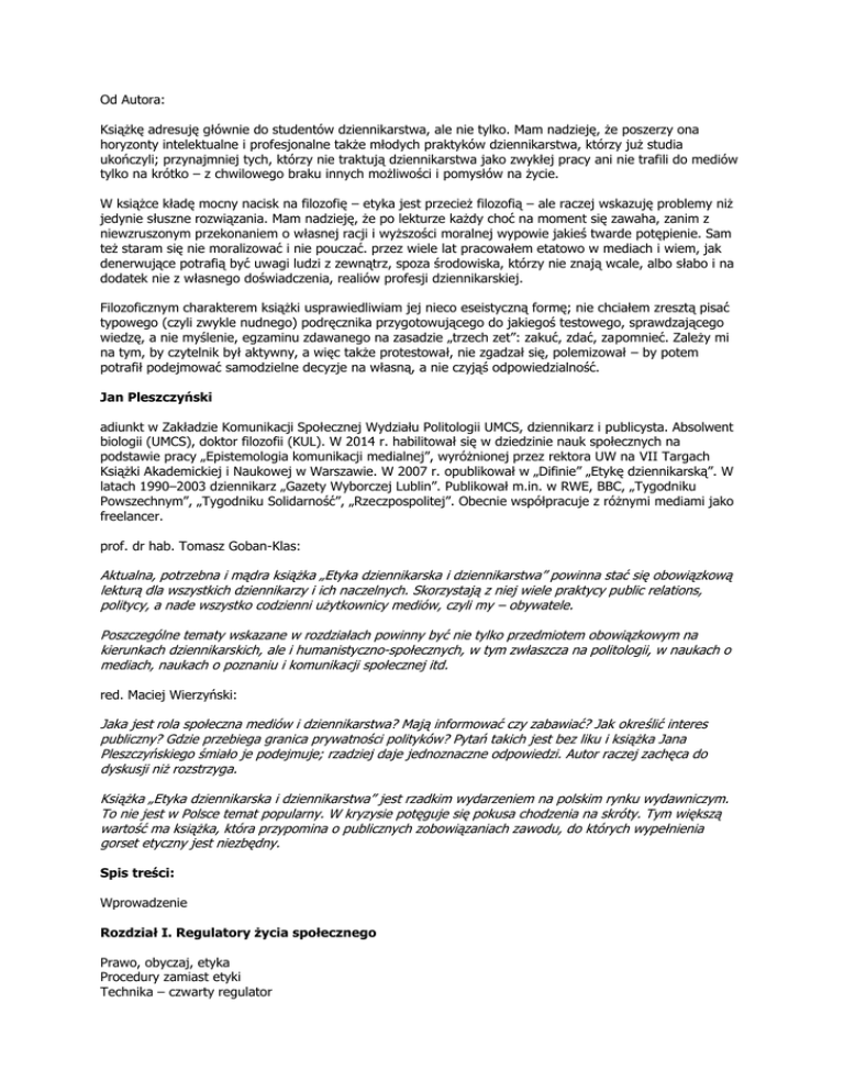 Od Autora: Książkę adresuję głównie do studentów dziennikarstwa, ale nie tylko. Mam nadzieję, że poszerzy ona horyzonty intelektualne i profesjonalne także młodych praktyków dziennikarstwa, którzy już studia ukończyli; przynajmniej tych, którzy nie traktują dziennikarstwa jako zwykłej pracy ani nie trafili do mediów tylko na krótko – z chwilowego braku innych możliwości i pomysłów na życie. W książce kładę mocny nacisk na filozofię – etyka jest przecież filozofią – ale raczej wskazuję problemy niż jedynie słuszne rozwiązania. Mam nadzieję, że po lekturze każdy choć na moment się zawaha, zanim z niewzruszonym przekonaniem o własnej racji i wyższości moralnej wypowie jakieś twarde potępienie. Sam też staram się nie moralizować i nie pouczać. przez wiele lat pracowałem etatowo w mediach i wiem, jak denerwujące potrafią być uwagi ludzi z zewnątrz, spoza środowiska, którzy nie znają wcale, albo słabo i na dodatek nie z własnego doświadczenia, realiów profesji dziennikarskiej. Filozoficznym charakterem książki usprawiedliwiam jej nieco eseistyczną formę; nie chciałem zresztą pisać typowego (czyli zwykle nudnego) podręcznika przygotowującego do jakiegoś testowego, sprawdzającego wiedzę, a nie myślenie, egzaminu zdawanego na zasadzie „trzech zet”: zakuć, zdać, zapomnieć. Zależy mi na tym, by czytelnik był aktywny, a więc także protestował, nie zgadzał się, polemizował – by potem potrafił podejmować samodzielne decyzje na własną, a nie czyjąś odpowiedzialność. Jan Pleszczyński adiunkt w Zakładzie Komunikacji Społecznej Wydziału Politologii UMCS, dziennikarz i publicysta. Absolwent biologii (UMCS), doktor filozofii (KUL). W 2014 r. habilitował się w dziedzinie nauk społecznych na podstawie pracy „Epistemologia komunikacji medialnej”, wyróżnionej przez rektora UW na VII Targach Książki Akademickiej i Naukowej w Warszawie. W 2007 r. opublikował w „Difinie” „Etykę dziennikarską”. W latach 1990–2003 dziennikarz „Gazety Wyborczej Lublin”. Publikował m.in. w RWE, BBC, „Tygodniku Powszechnym”, „Tygodniku Solidarność”, „Rzeczpospolitej”. Obecnie współpracuje z różnymi mediami jako freelancer. prof. dr hab. Tomasz Goban-Klas: Aktualna, potrzebna i mądra książka „Etyka dziennikarska i dziennikarstwa” powinna stać się obowiązkową lekturą dla wszystkich dziennikarzy i ich naczelnych. Skorzystają z niej wiele praktycy public relations, politycy, a nade wszystko codzienni użytkownicy mediów, czyli my – obywatele. Poszczególne tematy wskazane w rozdziałach powinny być nie tylko przedmiotem obowiązkowym na kierunkach dziennikarskich, ale i humanistyczno-społecznych, w tym zwłaszcza na politologii, w naukach o mediach, naukach o poznaniu i komunikacji społecznej itd. red. Maciej Wierzyński: Jaka jest rola społeczna mediów i dziennikarstwa? Mają informować czy zabawiać? Jak określić interes publiczny? Gdzie przebiega granica prywatności polityków? Pytań takich jest bez liku i książka Jana Pleszczyńskiego śmiało je podejmuje; rzadziej daje jednoznaczne odpowiedzi. Autor raczej zachęca do dyskusji niż rozstrzyga. Książka „Etyka dziennikarska i dziennikarstwa” jest rzadkim wydarzeniem na polskim rynku wydawniczym. To nie jest w Polsce temat popularny. W kryzysie potęguje się pokusa chodzenia na skróty. Tym większą wartość ma książka, która przypomina o publicznych zobowiązaniach zawodu, do których wypełnienia gorset etyczny jest niezbędny. Spis treści: Wprowadzenie Rozdział I. Regulatory życia społecznego Prawo, obyczaj, etyka Procedury zamiast etyki Technika – czwarty regulator Etyka – moralność – epistemologia Podsumowanie Rozdział II. Etyka profesjonalna i stosowana Zawody, profesje, dziedziny Etyka dziennikarska – definicje cząstkowe Kodeksy versus dylematy Etyka mediów Etyka i postmodernizm Postawy wobec etyk i dziennikarskiej Warsztat. Warunek sine qua non etyki w dziennikarstwie Epistemologia – wrażliwe miejsce etyki Podsumowanie Rozdział III. Etos i etyka. Przywileje, wartości i powinności Od etosu do etyki zawodowej Erozja etosu i zanik profesji Metoda Sokratesa i mądrość Sofistów Etos: kultura, natura i geny Kultura newsroomu Aksjologia i wartości Deontologia i sądy powinnościowe Przestrzeń aksjologiczna i moralna ślepota Podsumowanie Rozdział IV. Media, dziennikarstwo i dziennikarze Galimatias znaczeń Niewspółmierność medialna Media i dziennikarstwo deontologiczne i teleologiczne Media jako środowisko wiedzy i druga ścieżka edukacji Media jako władza – czwarta i pierwsza Media jako biznes i instytucja zaufania publicznego Problem licencji dziennikarskich i dumbing down A-etyczność. Tabloidy i tabloidyzacja Dziennikarskie elity, fachowcy, meteory i lumpendziennikarze Podsumowanie Rozdział V. Media i społeczeństwo Niezależność i obowiązki dziennikarzy Pułapki zdrowego rozsądku Sztuka bycia wśród ludzi Wspólnota i społeczeństwo. Współpraca, dialog i walka Kłopoty z dobrem wspólnym Dziennikarstwo a opinia publiczna Ombudsmani – rzecznicy dialogu Podsumowanie Rozdział VI. Dziennikarstwo i normatywność Etyka hetero- i autonomiczna – niewspółmierne perspektywy Opis i ocena Normy etyki dziennikarskiej Rada Etyki Mediów i Karta etyczna mediów Kłopot y z normami Krytyka kodeksów dziennikarskich Normy idealne i okazjonalne Etyka a prawo Normy – etyczne minimum Kwadrat Pottera – wymagająca procedura Podsumowanie Rozdział VII. Charakter i odpowiedzialność Kryzys epistemologiczny w etyce dziennikarskiej Etyka cnót – stawanie się człowiekiem Cnoty w sieci Kłopoty z cnotami Dylematy etyczne i konflikt wartości Konflikt interesów Cnoty deontologicznego dziennikarstwa Media i dziennikarstwo „tożsamościowe” Autorytety – wzorce osobowe Paradygmat drugiej osoby Działanie i jego konsekwencje Moc a odpowiedzialnoś