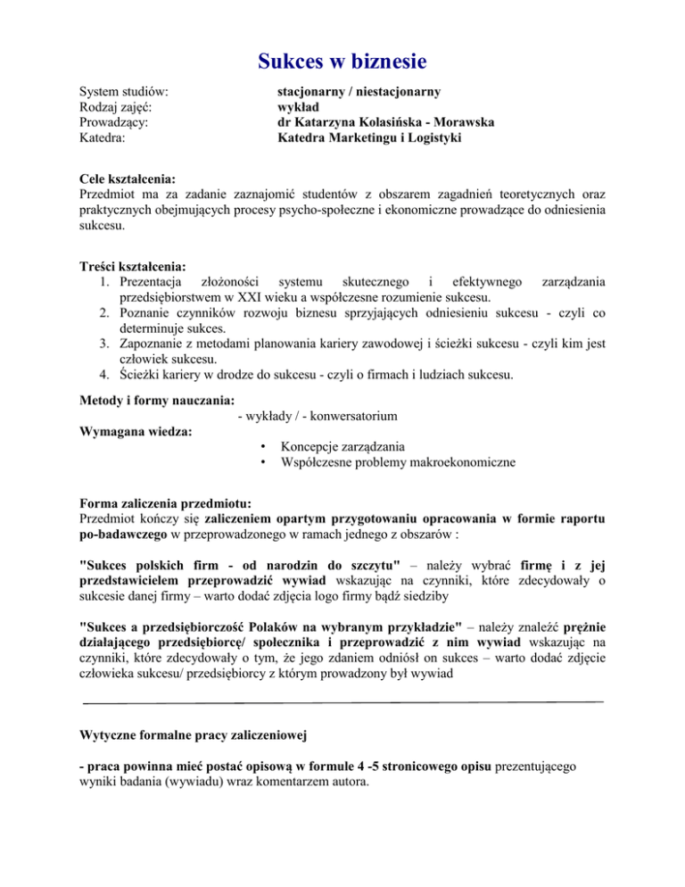 Sukces w biznesie System studiów: Rodzaj zajęć: Prowadzący: Katedra: stacjonarny / niestacjonarny wykład dr Katarzyna Kolasińska - Morawska Katedra Marketingu i Logistyki Cele kształcenia: Przedmiot ma za zadanie zaznajomić studentów z obszarem zagadnień teoretycznych oraz praktycznych obejmujących procesy psycho-społeczne i ekonomiczne prowadzące do odniesienia sukcesu. Treści kształcenia: 1. Prezentacja złożoności systemu skutecznego i efektywnego zarządzania przedsiębiorstwem w XXI wieku a współczesne rozumienie sukcesu. 2. Poznanie czynników rozwoju biznesu sprzyjających odniesieniu sukcesu - czyli co determinuje sukces. 3. Zapoznanie z metodami planowania kariery zawodowej i ścieżki sukcesu - czyli kim jest człowiek sukcesu. 4. Ścieżki kariery w drodze do sukcesu - czyli o firmach i ludziach sukcesu. Metody i formy nauczania: - wykłady / - konwersatorium Wymagana wiedza: • • Koncepcje zarządzania Współczesne problemy makroekonomiczne Forma zaliczenia przedmiotu: Przedmiot kończy się zaliczeniem opartym przygotowaniu opracowania w formie raportu po-badawczego w przeprowadzonego w ramach jednego z obszarów : "Sukces polskich firm - od narodzin do szczytu" – należy wybrać firmę i z jej przedstawicielem przeprowadzić wywiad wskazując na czynniki, które zdecydowały o sukcesie danej firmy – warto dodać zdjęcia logo firmy bądź siedziby "Sukces a przedsiębiorczość Polaków na wybranym przykładzie" – należy znaleźć prężnie działającego przedsiębiorcę/ społecznika i przeprowadzić z nim wywiad wskazując na czynniki, które zdecydowały o tym, że jego zdaniem odniósł on sukces – warto dodać zdjęcie człowieka sukcesu/ przedsiębiorcy z którym prowadzony był wywiad Wytyczne formalne pracy zaliczeniowej - praca powinna mieć postać opisową w formule 4 -5 stronicowego opisu prezentującego wyniki badania (wywiadu) wraz komentarzem autora. Parametry formatu pracy – wersja elektroniczna – wersja Microsoft Word - zasady normalizacji tekstu: na stronie tytułowej powinny znaleźć się takie elementy jak: Imię i Nazwisko autora, Tryb i semestr studiów, Numer Indeksu oraz Tytuł Pracy; tekst podstawowy: Czcionka Times New Roman, Standardowy 12 pt., odstępy między wierszami 1,5; w zależności od potrzeb w tekście podstawowym stosować można podkreślenia, pogrubienia, kursywę; przypisy i odnośniki umieszczamy na dole każdej strony – obowiązuje numeracja ciągła dla całej pracy; numeracja stron w prawym dolnym rogu; Przykładowe pytania pomocnicze do przeprowadzenia wywiadów: Skąd wziął się pomysł na założenie firmy? Jak duża jest firma/ sekcja wg. PKD (rodzaj działalności)? Czy firma jest firmą rodzinną? Ilu pracowników zatrudnia Pana/Pani firma? Czy zatrudniona kadra pracownicza posiada zadowalające kwalifikacje zawodowe? Czy w Pana/Pani firmie wykorzystywane są nowe technologie? Jaka liczna jest obecna konkurencja? Kto jest głównym rywalem? Czy odbiorcy chętnie współpracują z Pana/ Pani firmą? Jak sądzi Pana/Pani, czy klienci są zadowoleni z oferowanych im produktów? Czym jest dla Pani/ Pana sukces? Czy Pana/Pani firma realizuje strategię rozwoju? Jeżeli tak to w jaki sposób? Czy Pani/ Pana firma odniosła sukces ? Najgłówniejszym elementem składowym odniesionego sukcesu firmy były? Jakie cechy powinien mieć człowiek sukcesu? Co stało u podwalin sukcesu Pańskiej firmy? Z perspektywy czasu, co było najważniejsze by osiągnąć sukces ? Czy Pan/ Pani uważa się za człowieka sukcesu? Jaka była ścieżka Pan kariery? Czy zdarzały się porażki? Jakie i kiedy? Jak radził/-a Pan/ Pani sobie w takiej sytuacji? Czy warto być w Polsce przedsiębiorcom? Jak widzi Pan/ -i swoją przyszłość w biznesie? Co zmieniłby Pan/-i w przepisach prawnych by pobudzić w Polsce przedsiębiorczość? Zaliczenie może mieć również postać – nagranego filmu – „wywiad rzeka” – który powinien trwać około 5 – do 10 minut. Zasady oceniania: W procesie oceny uwzględnianie będą następujące elementy: - dostarczenie na czas materiału do weryfikacji tj. na dzień 31.01.2016 (4 spotkanie) – wydruk bądź wersja Word zgrana na płycie; Jeśli materiał będzie miał charakter nagrania Video – plik z nagraniem; - spełnianie minimalnych wymogów objętościowych przewidzianych dla materiałów; - rodzaj źródła badawczego; Poza poznaniu się prowadzącego z materiałem wystawiana jest ocena końcowa do Wirtualnego Dziekanatu. Ocena uzyskana z pracy jest jednocześnie oceną zaliczającą przedmiot. Ocena będzie wpisana nie później niż 05.02.2016. Termin i miejsce wpisów ocen do kart – zostanie podane na ostatnich zajęciach kursowych oraz na stronie http://kkolasinska.swspiz.pl/index.php?podstrona=materia%B3y_do_egzaminow Literatura przedmiotu Literatura obowiązkowa: - Sikorski Cz., Drogi do sukcesu. Profesjonalizm kontra populistyczna kultura organizacyjna, Difin, Warszawa 2007 - Barszczewski A.W., Sukces w relacjach międzyludzkich kluczem do zadowolenia w życiu i powodzenia w biznesie, Sowa, Warszawa 2013 Materiał autora wykładu: Katarzyna Kolasińska – Morawska, 2014, Success and entrepreneurship in the eyes of polish emigrants in the British Isles. [w:] red. Sułkowski Ł., „Journal of Intercultural Management”, Vol. 6, No 4. , December 2014, Wyd. SAN, p. 245 -262. http://www.joim.pl/index_pl.php?id=5 – wybrać Vol. 6, No 4. Literatura dodatkowa: - Griffin R.W., Podstawy zarządzania organizacjami, PWN, Warszaszawa 2013 - Brilman J., Nowoczesne koncepcje i metody zarządzania, PWE, Warszawa 2002 Polecane czasopisma: Magazyn „Sukces” „Forbes” Polecane wortale tematyczne: http://www.sukcesmagazyn.pl/ http://www.forbes.pl/#