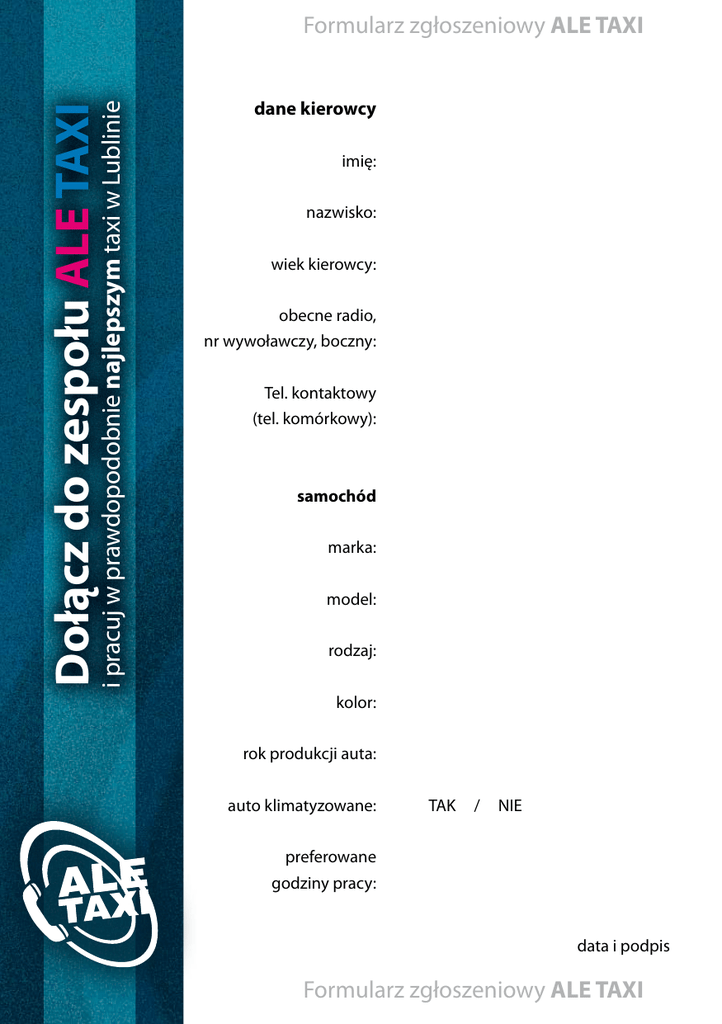 Dołącz do zespołu ALE TAXI i pracuj w prawdopodobnie najlepszym taxi w Lublinie Formularz zgłoszeniowy ALE TAXI dane kierowcy imię: nazwisko: wiek kierowcy: obecne radio, nr wywoławczy, boczny: Tel. kontaktowy (tel. komórkowy): samochód marka: model: rodzaj: kolor: rok produkcji auta: auto klimatyzowane: TAK / NIE preferowane godziny pracy: data i podpis Formularz zgłoszeniowy ALE TAXI