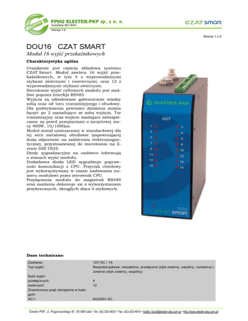 Certyfikat ISO 9001 Wersja 1.0 Strona 1 z 2 DOU16 CZAT SMART Moduł 16 wyjść przekaźnikowych Charakterystyka ogólna Urządzenie jest częścią składową systemu CZAT Smart. Moduł zawiera 16 wyjść przekaźnikowych, w tym 4 z wyprowadzonymi stykami zwiernymi i rozwiernymi, oraz 12 z wyprowadzonymi stykami zwiernymi. Sterowanie wyjść cyfrowych modułu jest możliwe poprzez interfejs RS485. Wyjścia są odizolowane galwanicznie między sobą oraz od toru transmisyjnego i obudowy. Dla podwyższenia pewności działania można łączyć po 2 sąsiadujące ze sobą wyjścia. Tor transmisyjny oraz wejście zasilające zabezpieczone są przed przepięciami o szczytowej mocy 400W, 10/1000µs. Moduł został umieszczony w standardowej dla tej serii metalowej obudowie (zapewniającej dużą odporność na zakłócenia elektromagnetyczne), przystosowanej do mocowania na listwie DIN TS35. Diody sygnalizacyjne na czołówce informują o stanach wyjść modułu. Dodatkowa dioda LED sygnalizuje poprawność komunikacji z CPU. Przycisk chwilowy jest wykorzystywany w czasie nadawania numeru modułowi przez sterownik CPU. Przyłączenia modułu do magistrali RS485 oraz zasilania dokonuje się z wykorzystaniem przykręcanych, okrągłych złącz 4-stykowych. Dane techniczne: Zasilanie: Typ wyjść: Ilość wyjść: przełącznych: zwiernych: Znamionowy prąd obciążenia w kategorii: AC1: 12V DC / 1A Bezpotencjałowe, niezależne, przełączne (styk zwierny, wspólny, rozwierny) i zwierne (styk zwierny, wspólny) 4 12 6A/250V AC Elester-PKP, ul. Pogonowskiego 81, 90-569 Łódź • Tel: (42) 253-4600 • Fax: (42)-253-4610 • mailto: [email protected] • http://www.elester-pkp.com.pl/ Certyfikat ISO 9001 Wersja 1.0 Strona 2 z 2 DC1: Minimalny prąd zestyku: Obciążalność prądowa stała zestyku: Przekrój przewodów podłączeniowych: Typ interfejsu szeregowego: Prędkość transmisji: Adres urządzenia: Separacja: wyjść do obudowy: między obwodami wyjść: Temperatura pracy: Masa: Wymiary (wysokość x szerokość x głębokość): 6A/24V DC 100mA 6A 0,2 – 2,5mm2 RS485 250kbit/s lub 38,4kbit/s Ustawiany programowo z CPU 3000V AC, 50Hz lub 4250V DC w czasie 60s 2000V AC, 50Hz lub 2830V DC w czasie 60s 5°C – 45°C 0,85kg 140 x 50 x 120 [mm] Sposób zamawiania: Numer katalogowy Opis 010301A0 DOU16, wykonanie podstawowe Elester-PKP, ul. Pogonowskiego 81, 90-569 Łódź • Tel: (42) 253-4600 • Fax: (42)-253-4610 • mailto: [email protected] • http://www.elester-pkp.com.pl/