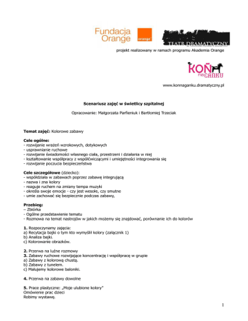 projekt realizowany w ramach programu Akademia Orange www.konnaganku.dramatyczny.pl Scenariusz zajęć w świetlicy szpitalnej Opracowanie: Małgorzata Parfieniuk i Bartłomiej Trzeciak Temat zajęć: Kolorowe zabawy Cele ogólne: - rozwijanie wrażeń wzrokowych, dotykowych - usprawnianie ruchowe - rozwijanie świadomości własnego ciała, przestrzeni i działania w niej - kształtowanie współpracy z współćwiczącymi i umiejętności integrowania się - rozwijanie poczucia bezpieczeństwa Cele szczegółowe (dziecko): - współdziała w zabawach poprzez zabawę integrującą - nazwa i zna kolory - reaguje ruchem na zmiany tempa muzyki - określa swoje emocje - czy jest wesołe, czy smutne - umie zachować się bezpiecznie podczas zabawy, Przebieg: – Zbiórka - Ogólne przedstawienie tematu - Rozmowa na temat nastrojów w jakich możemy się znajdować, porównanie ich do kolorów 1. Rozpoczynamy zajęcia: a) Recytacja bajki o tym kto wymyślił kolory (załącznik 1) b) Analiza bajki. c) Kolorowanie obrazków. 2. Przerwa na luźne rozmowy 3. Zabawy ruchowe rozwijające koncentrację i współpracę w grupie a) Zabawy z kolorową chustą. b) Zabawy z tunelem. c) Malujemy kolorowe baloniki. 4. Przerwa na zabawy dowolne 5. Prace plastyczne: „Moje ulubione kolory” Omówienie prac dzieci Robimy wystawę. 1 6. Zabawa w chowanie przedmiotów i poszukiwanie (np. poszukiwanie zagubionego zielonego węża). 7. Przerwa na odpoczynek i zabawy dowolne 8. Zabawy grupowe a) Dzieci określają odpowiedni kolor np. Czerwony jak? – burak b) Zabawa w „dotknij czegoś co jest koloru…” 9. Analiza tematu dnia Wypowiedzi dzieci na temat kolorów jakimi mogliby określić dzisiejszy nastrój na zajęciach. ,,Jak się dzisiaj bawiliście, czy dopisywał wam humor podczas zabaw, która zabawa wam się podobała najbardziej? Opiszcie swoje uczucia kolorami”. 10. Taniec integracyjny **************************************************************************************** załącznik nr 1 Bajka o tym, kto wymyślił kolory. Maria Lorek- autorka wielu książek, podręczników oraz programów do nauczania dla dzieci na poziomie kształcenia zintegrowanego Było to dawno, dawno temu. Tak dawno, że mało kto pamięta te czasy. Teraz tylko woda niebo i ziemia wspominają stare dzieje. Na świecie rządził Czarodziej Mrok. Co się dało malował na czarno. Czasem tylko, gdy był w dobrym humorze rozjaśnił coś na szaro. Na przykład czapeczki krasnoludkom. Był przekonany, że krasnoludki docenią jego dobre chęci i będą mu wdzięczne. Jakże się mylił. Przecież każdy wie, że krasnale poza tym, że pomagają innym, cenią sobie dobry humor. Lubią śmiać się i śpiewać. Któregoś dnia krasnal Muchomorek – bo tak się nazywał – zaprosił do siebie dwóch najbliższych przyjaciół: Promyczka i Zapominajkę. - Coś trzeba zrobić – powiedział. – Ktoś musi znaleźć sposób, aby było weselej. Na pewno gdzieś mieszka inny czarodziej, który potrafi to sprawić. - To musi być ktoś miły, pogodny i przyjazny – dodał Promyczek. - Tak. – potwierdził Zapominajek. – Ktoś o gorącym sercu. Ale kto? Nikogo takiego nie znamy. Gdzie go szukać? I czy ktoś taki jest? I dlaczego mamy to robić? I co ja przed chwilą mówiłem? - Oj, Zapominajku! Mówiłeś o bardzo ważnych sprawach. Jesteś roztargniony i senny. Wszystko przez to, że jest ciemno i każdemu – a tobie przede wszystkim – chce się spać. Zebraliśmy się po to, aby temu zaradzić. – wyjaśnił Muchomorek, po czym podrapał się po brodzie i stwierdził: - Chyba mam pomysł! - Jaki? Jaki? – jednocześnie spytali Promyczek z Zapominajkiem. No i oczywiście chwycili się za uszy, przekrzykując się wzajemnie: - Moje szczęście! Moje szczęście! - No właśnie – skoro już chodzi o szczęście – to musi być coś, co temu sprzyja. Jeśli jest Czarodziej Mrok, który daje nam czerń, to musi być Czarodziej, który da nam coś, co czernią nie jest. Trzeba napisać do niego list. Zacznijmy tak: „Jaśnie Panie Czarodzieju. Wiemy, że jesteś, choć Cię tu nie ma. Ale chcemy żebyś był. Zapraszamy do siebie. Ugościmy Cię bardzo serdecznie!” I dalej podpisy: Muchomorkiem, Promyczek i Zapominajek. List został wysłany, a krasnale czekały długo na odpowiedź, która brzmiała tak: „Dziękuje za zaproszenie. Zjawię się jutro o poranku. Tymczasem życzę dobrej nocy i kolorowych snów”. Podpisu nie było - Kolorowych snów? – razem wykrzyknęli Zapominajek z Promyczkiem i znów chwycili się za uszy by dodać: - Moje szczęście! Moje szczęście! - Co to znaczy „kolorowy”? – zadumał się Muchomorek. - Może jutro wszystko się wyjaśni – po czym ziewnął i trójka krasnali poszła spać. Muchomorkowi przyśnił się grzyb o przepięknym czerwonym kapeluszu, do którego się wprowadził i wszyscy z podziwem przychodzili oglądać jego nowy domek, Zapominajkowi kwiatuszek o drobnych niebieskich płatkach i takim zapachu, że cały czas kręciło mu się w nosie. 2 Ale najdziwniejszy sen miał Promyczek. Przyśnił mu się jaśniutki i ciepły strumyczek światła, który muskał mu czoło, uszy a w końcu nos. Muskał, muskał, aż Promyczek nie wytrzymał. Otworzył oczy i… A psik! kichnął tak głośno jak jeszcze nigdy. - A psik! – zawtórował mu Zapominajek. - Moje szczęście! Moje szczęście! – krzyknęli, ale już nie złapali się za uszy, bo nie byli pewni, czy to co widzą to sen czy jawa. Wokół siebie zobaczyli zieloną trawę, fioletowe fiołki, żółte motylki, rude wiewiórki skaczące wśród gałęzi o pomarańczowych i brązowych liściach. A w górze błękitne niebo, białe obłoczki spośród których wychylał się Czarodziej - Obudź się Muchomorku, mamy gościa – Zapominajek poszarpał Krasnala przez kubraczek - Jaki miałem piękny sen! – przeciągnął się Muchomorek i przetarł oczy, Przetarł raz, przetarł drugi i już chciał przet