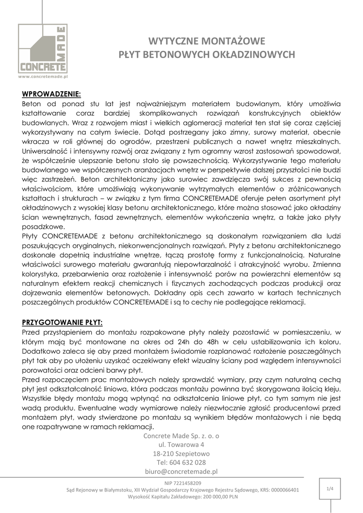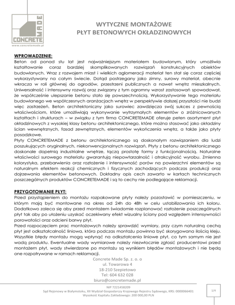 WYTYCZNE MONTAŻOWE PŁYT BETONOWYCH OKŁADZINOWYCH WPROWADZENIE: Beton od ponad stu lat jest najważniejszym materiałem budowlanym, który umożliwia kształtowanie coraz bardziej skomplikowanych rozwiązań konstrukcyjnych obiektów budowlanych. Wraz z rozwojem miast i wielkich aglomeracji materiał ten stał się coraz częściej wykorzystywany na całym świecie. Dotąd postrzegany jako zimny, surowy materiał, obecnie wkracza w roli głównej do ogrodów, przestrzeni publicznych a nawet wnętrz mieszkalnych. Uniwersalność i intensywny rozwój oraz związany z tym ogromny wzrost zastosowań spowodował, że współcześnie ulepszanie betonu stało się powszechnością. Wykorzystywanie tego materiału budowlanego we współczesnych aranżacjach wnętrz w perspektywie dalszej przyszłości nie budzi więc zastrzeżeń. Beton architektoniczny jako surowiec zawdzięcza swój sukces z pewnością właściwościom, które umożliwiają wykonywanie wytrzymałych elementów o zróżnicowanych kształtach i strukturach – w związku z tym firma CONCRETEMADE oferuje pełen asortyment płyt okładzinowych z wysokiej klasy betonu architektonicznego, które można stosować jako okładziny ścian wewnętrznych, fasad zewnętrznych, elementów wykończenia wnętrz, a także jako płyty posadzkowe. Płyty CONCRETEMADE z betonu architektonicznego są doskonałym rozwiązaniem dla ludzi poszukujących oryginalnych, niekonwencjonalnych rozwiązań. Płyty z betonu architektonicznego doskonale dopełnią industrialne wnętrze, łączą prostotę formy z funkcjonalnością. Naturalne właściwości surowego materiału gwarantują niepowtarzalność i atrakcyjność wyrobu. Zmienna kolorystyka, przebarwienia oraz rozłożenie i intensywność porów na powierzchni elementów są naturalnym efektem reakcji chemicznych i fizycznych zachodzących podczas produkcji oraz dojrzewania elementów betonowych. Dokładny opis cech zawarto w kartach technicznych poszczególnych produktów CONCRETEMADE i są to cechy nie podlegające reklamacji. PRZYGOTOWANIE PŁYT: Przed przystąpieniem do montażu rozpakowane płyty należy pozostawić w pomieszczeniu, w którym mają być montowane na okres od 24h do 48h w celu ustabilizowania ich koloru. Dodatkowo zaleca się aby przed montażem świadomie rozplanować rozłożenie poszczególnych płyt tak aby po ułożeniu uzyskać oczekiwany efekt wizualny ściany pod względem intensywności porowatości oraz odcieni barwy płyt. Przed rozpoczęciem prac montażowych należy sprawdzić wymiary, przy czym naturalną cechą płyt jest odkształcalność liniowa, która podczas montażu powinna być skorygowana ilością kleju. Wszystkie błędy montażu mogą wpłynąć na odkształcenia liniowe płyt, co tym samym nie jest wadą produktu. Ewentualne wady wymiarowe należy niezwłocznie zgłosić producentowi przed montażem płyt, wady stwierdzone po montażu są wynikiem błędów montażowych i nie będą one rozpatrywane w ramach reklamacji. Concrete Made Sp. z. o. o ul. Towarowa 4 18-210 Szepietowo Tel: 604 632 028 [email protected] NIP 7221458209 Sąd Rejonowy w Białymstoku, XII Wydział Gospodarczy Krajowego Rejestru Sądowego, KRS: 0000066401 Wysokość Kapitału Zakładowego: 200 000,00 PLN 1/4 PRZYGOTOWANIE POWIERZCHNI: Przed przystąpieniem do montażu należy odpowiednio przygotować powierzchnię klejenia. Podłoże oraz tylna powierzchnia płyt powinny być wysezonowane, suche i wolne od wszelkich zanieczyszczeń. Ściany należy zagruntować odpowiednim środkiem gruntującym. Nie należy kleić płyt na powierzchnie z gładkimi tynkami lub malowanymi, zaleca się zmatowienie takich powierzchni w celu poprawienia przyczepności. Płyty betonowe CONCRETEMADE nie powinny być montowane na ścianach o konstrukcji lekkiej (takich jak np.: płyty gipsowo-kartonowe) z uwagi na masę płyt. Montaż płyt betonowych CONCRETEMADE zaleca się na wytrzymałych i odpowiednio sztywnych powierzchniach. Niestosowanie się do powyższych zaleceń negatywnie wpływa na przyczepność oraz stabilności płyt, co jednoznacznie jest błędem montażowym a nie wadą płyt betonowych. OBRÓBKA PŁYT: Płyty CONCRETEMADE można docinać za pomocą ogólnodostępnych narzędzi przeznaczonych do obróbki płytek ceramicznych, zachowując te same zasady działania. Należy jednak pamiętać, że w miejscu cięcia widoczne będzie kruszywo, przez co powierzchnia cięta będzie różna od powierzchni eksponowanej płyty. Wszystkie otwory należy wykonywać narzędziami do tego przeznaczonymi takimi jak otwornice bez użycia udaru. Podczas wiercenia otworu należy pamiętać o podparciu całej powierzchni płyty, w przeciwnym wypadku płyta może pęknąć. Płyty można docinać pod kątem 45°. Czyszczenie płyt po montażu należy wykonać na mokro za pomocą wody i gąbki lub na sucho za pomocą ścierki z mikrofibry. Należy unikać intensywnego tarcia płyty w jednym miejscu ponieważ grozi to naruszeniem wierzchniej warstwy struktury płyty co może skutkować powstaniem przebarwień i nieestetycznych plam na płycie. Na płycie nie mogą zostać resztki stojącej wody. Nie wolno stosować wysokociśnieniowych urządzeń czyszczących. MONTAŻ NIEWIDOCZNY: Do klejenia zaleca się stosowanie klejów poliuretanowych, np. klej/uszczelniacz poliuretanowy ARBOTHANE 1245 firmy ADSHEAD RATCLIFFE. Zastosowanie klejów innego rodzaju na bazie wody może powodować problemy montażowe min.: wyginanie się płyt. Montaż płyt rozpoczynamy od dołu ku górze, układając płyty rzędami zakładając kolejne poziomy. Płyty przyklejamy do powierzchni ścian wyrównując wcześniej krzywiznę ściany oraz wszelkie nierówności płyt wynikające ze sposobu ich zaformowania, należy unikać korygowania nierówności ścian za pomocą grubości warstwy kleju ponieważ może to negatywnie wpłynąć na wytrzymałość połączenia. Na tylną część płyty aplikujemy odpowiedni klej poliuretan