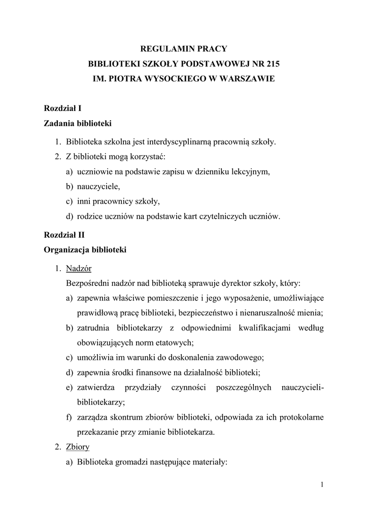 REGULAMIN PRACY BIBLIOTEKI SZKOŁY PODSTAWOWEJ NR 215 IM. PIOTRA WYSOCKIEGO W WARSZAWIE Rozdział I Zadania biblioteki 1. Biblioteka szkolna jest interdyscyplinarną pracownią szkoły. 2. Z biblioteki mogą korzystać: a) uczniowie na podstawie zapisu w dzienniku lekcyjnym, b) nauczyciele, c) inni pracownicy szkoły, d) rodzice uczniów na podstawie kart czytelniczych uczniów. Rozdział II Organizacja biblioteki 1. Nadzór Bezpośredni nadzór nad biblioteką sprawuje dyrektor szkoły, który: a) zapewnia właściwe pomieszczenie i jego wyposażenie, umożliwiające prawidłową pracę biblioteki, bezpieczeństwo i nienaruszalność mienia; b) zatrudnia bibliotekarzy z odpowiednimi kwalifikacjami według obowiązujących norm etatowych; c) umożliwia im warunki do doskonalenia zawodowego; d) zapewnia środki finansowe na działalność biblioteki; e) zatwierdza przydziały czynności poszczególnych nauczycieli- bibliotekarzy; f) zarządza skontrum zbiorów biblioteki, odpowiada za ich protokolarne przekazanie przy zmianie bibliotekarza. 2. Zbiory a) Biblioteka gromadzi następujące materiały: 1 wydawnictwa informacyjne — encyklopedie i słowniki, programy nauczania dla nauczycieli, lektury podstawowe i uzupełniające do języka polskiego, literaturę popularnonaukową i naukową, wybrane pozycje literatury pięknej, wydawnictwa albumowe, prasę dla uczniów i nauczycieli, inne wydawnictwa potrzebne do realizacji poszczególnych przedmiotów nauczania, wydawnictwa z zakresu psychologii, pedagogiki, filozofii, socjologii i dydaktyk różnych przedmiotów nauczania, dokumenty audiowizualne i multimedialne, edukacyjne programy komputerowe, dokumenty szkolne (statut, regulaminy i inne) oraz akty prawne regulujące pracę szkoły. b) Rozmieszczenie zbiorów: literatura piękna stoi w układzie działowym, literatura popularnonaukowa i naukowa — wg UKD, literatura do języka polskiego — alfabetycznie wg klas, księgozbiór podręczny w oszklonych szafach wg UKD. c) Prasa i księgozbiór podręczny udostępniany jest w czytelni i do sal lekcyjnych na zajęcia. 3. Finansowanie wydatków a) Wydatki biblioteki są pokrywane z budżetu szkoły. b) Zbiory biblioteki mogą być wzbogacane dzięki dotacjom rodziców i innych ofiarodawców. 4. Czas pracy biblioteki 2 a) Biblioteka udostępnia swoje zbiory z czasie trwania zajęć lekcyjnych, w czasie przerw śródlekcyjnych i po zakończeniu lekcji. b) Szczegółowe informacje na temat godzin pracy biblioteki są dostępne dla użytkowników przy wejściu i na stronie internetowej szkoły. c) Dopuszcza się ograniczenie czasu udostępniania zbiorów lub czasowe zamkniecie wypożyczalni dla użytkowników biblioteki w wypadku: przeprowadzania skontrum, dokonywania zakupów i opracowywania zbiorów, konserwacji zbiorów, przeprowadzania selekcji księgozbioru, uczestnictwa bibliotekarzy w różnych formach doskonalenia zawodowego. Rozdział III Zadania i obowiązki nauczyciela-bibliotekarza 1. Praca pedagogiczna Nauczyciel-bibliotekarz jest zobowiązany: a) udostępniać zbiory w wypożyczalni i czytelni oraz przekazywać komplety podręczników i innych materiałów edukacyjnych do pracowni i sali lekcyjnych, b) prowadzić działalność informacyjną dotyczącą zbiorów, biblioteki i czytelnictwa, c) udzielać porad w doborze lektury zależnie od potrzeb i zainteresowań, d) prowadzić rozmowy z uczniami na temat ich zainteresowań i przeczytanych książek, e) prowadzić zajęcia z przysposobienia czytelniczego i informacyjnego przy współpracy z wychowawcami i nauczycielami przedmiotów oraz prowadzić indywidualny instruktaż w tym zakresie. 3 2. Współpraca z rada pedagogiczną, sekretariatem szkoły oraz środowiskiem lokalnym Nauczyciel-bibliotekarz jest zobowiązany: a) współpracować z wychowawcami oddziałów, nauczycielami przedmiotów, wychowawcami świetlicy i opiekunami organizacji i kół zainteresowań w rozwijaniu kultury czytelniczej uczniów i w przygotowaniu ich do samokształcenia; b) współpracować z wychowawcami oddziałów przy organizowaniu wycieczek do innych ośrodków informacji (np. biblioteki publicznej, biblioteki pedagogicznej); c) współpracować z nauczycielami przedmiotów przy gromadzeniu i selekcji zbiorów; d) współpracować z wychowawcami oddziałów przy egzekwowaniu zwrotu książek i rozliczeń za książki zagubione i zniszczone; e) informować nauczycieli i innych użytkowników biblioteki o nowych nabytkach (ogłoszenia, prezentacje, strona internetowa szkoły); f) brać udział w posiedzeniach rady pedagogicznej; g) współpracować z sekretariatem szkoły w zakresie gromadzenia czasopism i dokumentów szkolnych; h) współpracować ze środowiskiem lokalnym — bibliotekami w ramach lekcji bibliotecznych oraz organizowanych imprez. 3. Prace organizacyjno-techniczne Nauczyciel-bibliotekarz jest zobowiązany: a) troszczyć się o właściwą organizację, wyposażenie i estetykę lokalu bibliotecznego; b) gromadzić zbiory zgodnie z profilem programowym szkoły i jej potrzebami i przeprowadzać ich selekcję; c) prowadzić ewidencję zbiorów; 4 d) opracowywać zbiory (klasyfikacja, katalogowanie, opracowanie techniczne); e) prowadzić konserwację zbiorów; f) w miarę możliwości tworzyć komputerową bazę danych; g) prowadzić dzienną, półroczną i roczną statystykę wypożyczeń, dziennik pracy biblioteki, księgi inwentarzowe, rejestr ubytków, ewidencję wypożyczeń; h) planować pracę (roczny ramowy plan pracy biblioteki, terminarz zajęć bibliotecznych i imprez czytelniczych); i) składać dyrektorowi szkoły półroczne i roczne sprawozdanie z pracy biblioteki i oceny stanu czytelnictwa w szkole; j) doskonalić warsztat swojej pracy; k) nadzorować wykorzystanie komputerów i łącza internetowego w bibliotece. Rozdział IV Prawa i obowiązki czytelników 1. Czytelnicy mają prawo do bezpłatnego korzystania z biblioteki. 2. Korzystający z biblioteki zobowiązani są do