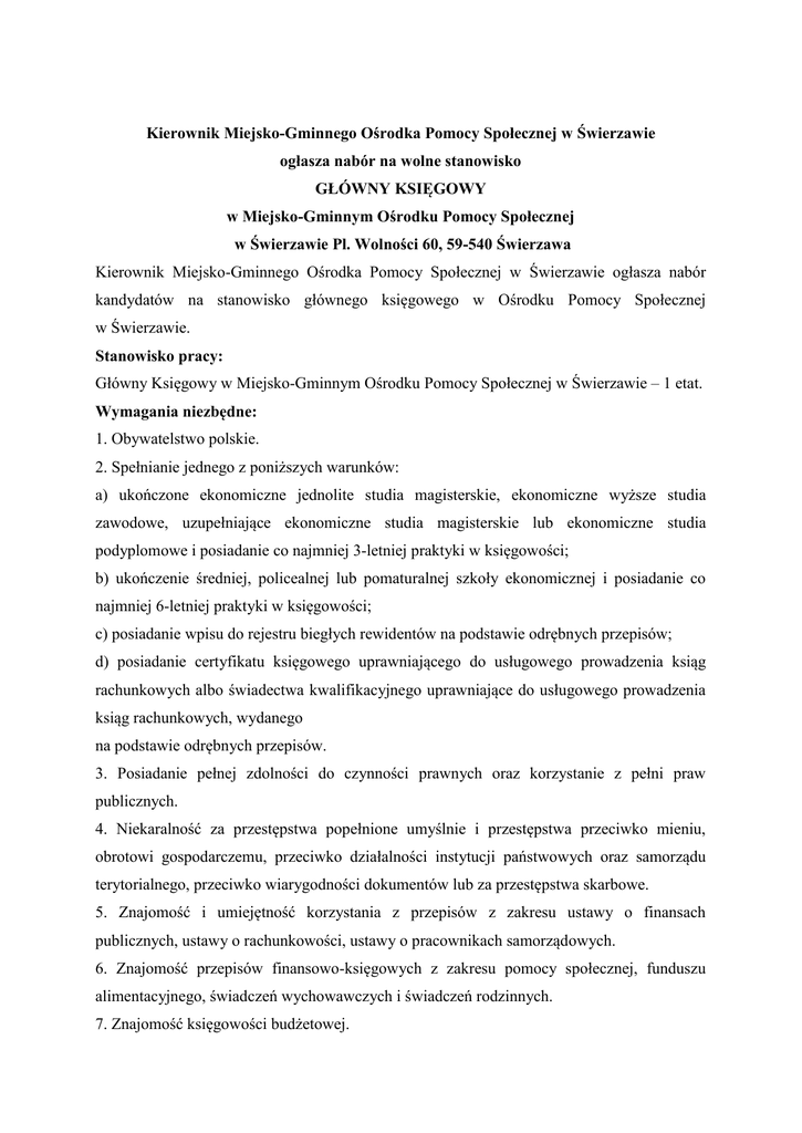 Kierownik Miejsko-Gminnego Ośrodka Pomocy Społecznej w Świerzawie ogłasza nabór na wolne stanowisko GŁÓWNY KSIĘGOWY w Miejsko-Gminnym Ośrodku Pomocy Społecznej w Świerzawie Pl. Wolności 60, 59-540 Świerzawa Kierownik Miejsko-Gminnego Ośrodka Pomocy Społecznej w Świerzawie ogłasza nabór kandydatów na stanowisko głównego księgowego w Ośrodku Pomocy Społecznej w Świerzawie. Stanowisko pracy: Główny Księgowy w Miejsko-Gminnym Ośrodku Pomocy Społecznej w Świerzawie – 1 etat. Wymagania niezbędne: 1. Obywatelstwo polskie. 2. Spełnianie jednego z poniższych warunków: a) ukończone ekonomiczne jednolite studia magisterskie, ekonomiczne wyższe studia zawodowe, uzupełniające ekonomiczne studia magisterskie lub ekonomiczne studia podyplomowe i posiadanie co najmniej 3-letniej praktyki w księgowości; b) ukończenie średniej, policealnej lub pomaturalnej szkoły ekonomicznej i posiadanie co najmniej 6-letniej praktyki w księgowości; c) posiadanie wpisu do rejestru biegłych rewidentów na podstawie odrębnych przepisów; d) posiadanie certyfikatu księgowego uprawniającego do usługowego prowadzenia ksiąg rachunkowych albo świadectwa kwalifikacyjnego uprawniające do usługowego prowadzenia ksiąg rachunkowych, wydanego na podstawie odrębnych przepisów. 3. Posiadanie pełnej zdolności do czynności prawnych oraz korzystanie z pełni praw publicznych. 4. Niekaralność za przestępstwa popełnione umyślnie i przestępstwa przeciwko mieniu, obrotowi gospodarczemu, przeciwko działalności instytucji państwowych oraz samorządu terytorialnego, przeciwko wiarygodności dokumentów lub za przestępstwa skarbowe. 5. Znajomość i umiejętność korzystania z przepisów z zakresu ustawy o finansach publicznych, ustawy o rachunkowości, ustawy o pracownikach samorządowych. 6. Znajomość przepisów finansowo-księgowych z zakresu pomocy społecznej, funduszu alimentacyjnego, świadczeń wychowawczych i świadczeń rodzinnych. 7. Znajomość księgowości budżetowej. 8. Doświadczenie w pracy w dziale księgowości w jednostkach samorządu terytorialnego lub dziale księgowości w samorządowych jednostkach organizacyjnych. 9. Stan zdrowia pozwalający na zatrudnienie na danym stanowisku. 10. Nieposzlakowana opinia. Wymagania dodatkowe: 1. Znajomość ustawy prawa zamówień publicznych, prawa pracy. 2. Znajomość ustawy o pomocy społecznej, ustawy o świadczeniach rodzinnych oraz ustawy o pomocy państwa w wychowaniu dzieci. 3. Znajomość przepisów dotyczących wynagradzania pracowników samorządowych, prawa podatkowego oraz ubezpieczeń społecznych. 4. Biegła obsługa komputera, w tym programów finansowo – księgowych, płacowych, „Płatnik” 5. Znajomość bankowości elektronicznej. 6. Umiejętność pracy w zespole, sumienność, rzetelność, dobra organizacja czasu pracy, terminowość oraz gotowość do podnoszenia swoich kwalifikacji. 7. Samodzielność, komunikatywność, odporność na stres, odpowiedzialność i dokładność w realizacji powierzonych zadań. Zadania wykonywane na stanowisku: 1. Prowadzenie rachunkowości jednostki w oparciu o aktualne przepisy ustawy o rachunkowości i ustawy o finansach publicznych. 2. Dokonywanie wstępnej kontroli zgodności operacji gospodarczych i finansowych z planem finansowym. 3. Dokonywanie wstępnej kontroli kompletności i rzetelności dokumentów dotyczących operacji gospodarczych i finansowych. 4. Sprawdzanie dokumentów pod względem formalnym i rachunkowym oraz ich opisywanie. 5. Nadzorowanie i sprawdzanie sporządzonych list wypłat przyznanych świadczeń rodzinnych, wychowawczych oraz świadczeń pomocy społecznej. 6. Prowadzenie kontroli realizowanych świadczeń rodzinnych, wychowawczych oraz świadczeń pomocy społecznej. 7. Prowadzenie rejestru faktur, rejestru delegacji oraz rejestru szkoleń. 8.Wykonywanie dyspozycji środkami pieniężnymi. 9. Nadzór nad majątkiem i jego ewidencjonowanie. 10. Prowadzenie rozliczeń podatkowych oraz z ZUS. 11. Wyliczanie, ewidencjonowanie i wypłata wynagrodzeń dla pracowników. 12. Naliczanie odpisów na ZFŚS. 13. Przestrzeganie dyscypliny finansów publicznych oraz tajemnicy służbowej. 14. Sporządzanie sprawozdań finansowych i statystycznych. 15. Sporządzanie sprawozdań budżetowych RB. 15. Prowadzenie ewidencji syntetycznej i analitycznej dochodów i wydatków. 16. Gromadzenie i przechowywanie dowodów księgowych oraz pozostałej dokumentacji przewidzianej ustawą. 17. Stała współpraca ze Skarbnikiem Gminy. 18. Nadzór nad prawidłowym przebiegiem przekazywania składników majątkowych, sprawowanie odpowiedzialności materialnej oraz zasad inwentaryzacji i likwidacji środków trwałych i wyposażenia. Czasookres zatrudnienia: Umowa na czas określony na okres trzech miesięcy, po tym okresie na czas nieokreślony. Wymiar czasu pracy: 1 etat, Planowy termin rozpoczęcia pracy: 02 stycznia 2017 roku. Informacja dotycząca wskaźnika zatrudnienia osób niepełnosprawnych w jednostce, w miesiącu poprzedzającym ogłoszenie naboru. Wskaźnik zatrudnienia osób niepełnosprawnych w jednostce w miesiącu wrześniu nie przekraczał 6% w rozumieniu przepisów o rehabilitacji zawodowej i społecznej oraz zatrudnianiu osób niepełnosprawnych. Wymagane dokumenty: 1. CV 2. List motywacyjny. 3. Kserokopie dokumentów potwierdzające kwalifikacje i doświadczenie zawodowe. 4. Kwestionariusz osobowy. 5. Oświadczenie o niekaralności za przestępstwo popełnione z winy umyślnej. 6. Oświadczenie, że kandydat nie był karany za przestępstwa: przeciwko mieniu, przeciwko obrotowi gospodarczemu, przeciwko działalności instytucji państwowych oraz samorządu terytorialnego, przeciwko wiarygodności dokumentów lub za przestępstwo karne skarbowe. 7. Oświadczenie o posiadaniu pełni praw publicznych i pełnej zdolności do czynności prawnych. 8. Oświadczenie o wyrażeniu zgody na przetwarzanie danych osobowych rekrutacji. w celach