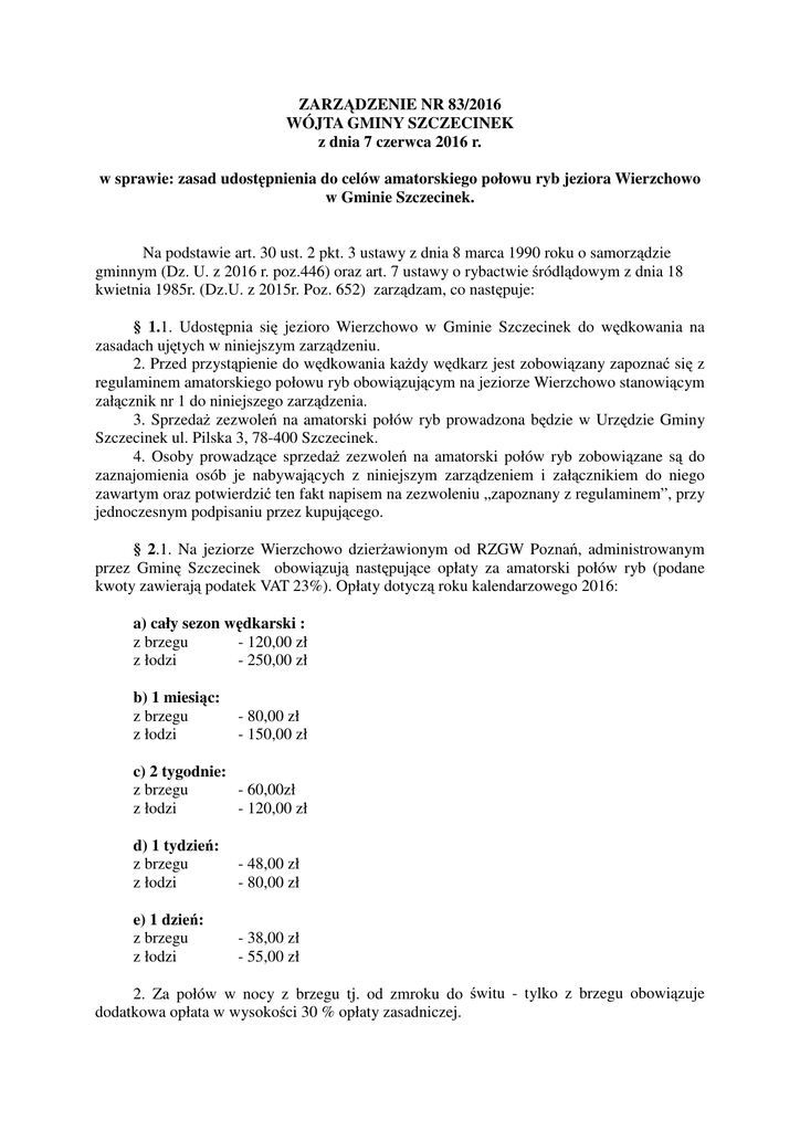 ZARZĄDZENIE NR 83/2016 WÓJTA GMINY SZCZECINEK z dnia 7 czerwca 2016 r. w sprawie: zasad udostępnienia do celów amatorskiego połowu ryb jeziora Wierzchowo w Gminie Szczecinek. Na podstawie art. 30 ust. 2 pkt. 3 ustawy z dnia 8 marca 1990 roku o samorządzie gminnym (Dz. U. z 2016 r. poz.446) oraz art. 7 ustawy o rybactwie śródlądowym z dnia 18 kwietnia 1985r. (Dz.U. z 2015r. Poz. 652) zarządzam, co następuje: § 1.1. Udostępnia się jezioro Wierzchowo w Gminie Szczecinek do wędkowania na zasadach ujętych w niniejszym zarządzeniu. 2. Przed przystąpienie do wędkowania każdy wędkarz jest zobowiązany zapoznać się z regulaminem amatorskiego połowu ryb obowiązującym na jeziorze Wierzchowo stanowiącym załącznik nr 1 do niniejszego zarządzenia. 3. Sprzedaż zezwoleń na amatorski połów ryb prowadzona będzie w Urzędzie Gminy Szczecinek ul. Pilska 3, 78-400 Szczecinek. 4. Osoby prowadzące sprzedaż zezwoleń na amatorski połów ryb zobowiązane są do zaznajomienia osób je nabywających z niniejszym zarządzeniem i załącznikiem do niego zawartym oraz potwierdzić ten fakt napisem na zezwoleniu „zapoznany z regulaminem”, przy jednoczesnym podpisaniu przez kupującego. § 2.1. Na jeziorze Wierzchowo dzierżawionym od RZGW Poznań, administrowanym przez Gminę Szczecinek obowiązują następujące opłaty za amatorski połów ryb (podane kwoty zawierają podatek VAT 23%). Opłaty dotyczą roku kalendarzowego 2016: a) cały sezon wędkarski : z brzegu - 120,00 zł z łodzi - 250,00 zł b) 1 miesiąc: z brzegu z łodzi - 80,00 zł - 150,00 zł c) 2 tygodnie: z brzegu - 60,00zł z łodzi - 120,00 zł d) 1 tydzień: z brzegu z łodzi - 48,00 zł - 80,00 zł e) 1 dzień: z brzegu z łodzi - 38,00 zł - 55,00 zł 2. Za połów w nocy z brzegu tj. od zmroku do świtu - tylko z brzegu obowiązuje dodatkowa opłata w wysokości 30 % opłaty zasadniczej. 3. Połów pod lodem mieści się w opłacie zasadniczej. 4. Wniesienie opłaty za połów z łodzi za dany okres połowu upoważnia do wędkowania w nocy z brzegu w tym czasie bez dodatkowej opłaty. 5. Zezwolenie na wędkowanie ważne jest z kartą wędkarską. 6. Zezwoleniem na wędkowanie jest dowód wpłaty zgodny z obowiązującym cennikiem opłat oraz pisemne zezwolenie wydane przez Gminę Szczecinek zezwalające na amatorski połów ryb na jeziorze Wierzchowo. 7. Osoby szczególnie zaangażowane w pracach na rzecz Gminy Szczecinek i związane z gospodarką na jeziorze mogą otrzymać darmowe zezwolenie uprawniające ich do amatorskiego połowu ryb. 8. Osoby łowiące powinny posiadać przy sobie dowód tożsamości w celu jej potwierdzenia. 9. Połów z jednostek pływających dozwolony jest rok rocznie od 1 maja do 31 października. 10. Połów z brzegu dozwolony jest rokrocznie od 1 maja do 31 października. 11. Połów spod lodu dozwolony jest rokrocznie od 1 grudnia do 28 lutego. 12. Zakazuje się połowów rokrocznie w miesiącu marcu i kwietniu 13. Do kontroli na jeziorze Wierzchowo upoważnieni są: a) Policja, b) Państwowa Straż Rybacka, c) Społeczna Straż Rybacka, d) Straż Leśna, e) Pracownicy Urzędu Gminy Szczecinek 14. Naruszenie zasad amatorskiego połowu ryb określonych w niniejszym zarządzeniu oraz regulaminie jeziora Wierzchowo pociąga za sobą konsekwencje określone w ustawie o rybactwie śródlądowym lub zatrzymanie zezwolenia bez możliwości odszkodowania. § 3. Wykonanie zarządzenia powierza się Referatowi Komunalnemu. § 4. Zarządzenie wchodzi w życie z dniem podpisania. Wójt Gminy Ryszard Jasionas