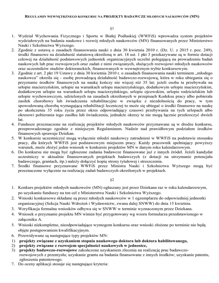 REGULAMIN WEWNĘTRZNEGO KONKURSU NA PROJEKTY BADAWCZE MŁODYCH NAUKOWCÓW (MN) §1 1. Wydział Wychowania Fizycznego i Sportu w Białej Podlaskiej (WWFiS) wprowadza system projektów wydziałowych na badania naukowe i rozwój młodych naukowców (MN) finansowanych przez Ministerstwo Nauki i Szkolnictwa Wyższego. 2. Zgodnie z ustawą o zasadach finansowania nauki z dnia 30 kwietnia 2010 r. (Dz. U. z 2015 r. poz. 249), środki finansowe na działalność statutową określoną w art. 18 ust. 1 pkt 3 przekazywane są w formie dotacji celowej na działalność podstawowych jednostek organizacyjnych uczelni polegającą na prowadzeniu badań naukowych lub prac rozwojowych oraz zadań z nimi związanych, służących rozwojowi młodych naukowców oraz uczestników studiów doktoranckich, finansowanych w wewnętrznym trybie konkursowym. 3. Zgodnie z art. 2 pkt 19 Ustawy z dnia 30 kwietnia 2010 r. o zasadach finansowania nauki terminem „młodego naukowca” określa się - osobę prowadzącą działalność badawczo-rozwojową, która w roku ubiegania się o przyznanie środków finansowych na naukę kończy nie więcej niż 35 lat; jeżeli osoba ta przebywała na urlopie macierzyńskim, urlopie na warunkach urlopu macierzyńskiego, dodatkowym urlopie macierzyńskim, dodatkowym urlopie na warunkach urlopu macierzyńskiego, urlopie ojcowskim, urlopie rodzicielskim lub urlopie wychowawczym, udzielonych na zasadach określonych w przepisach Kodeksu pracy albo pobierała zasiłek chorobowy lub świadczenia rehabilitacyjne w związku z niezdolnością do pracy, w tym spowodowaną chorobą wymagającą rehabilitacji leczniczej to może się ubiegać o środki finansowe na naukę po ukończeniu 35 roku życia przez okres odpowiadający czasowi przebywania na tych urlopach albo okresowi pobierania tego zasiłku lub świadczenia, jednakże okresy te nie mogą łącznie przekroczyć dwóch lat. 4. Fundusze przeznaczone na realizację projektów młodych naukowców przyznawane są w drodze konkursu, przeprowadzonego zgodnie z niniejszym Regulaminem. Nadzór nad prawidłowym podziałem środków finansowych sprawuje Dziekan. 5. W konkursie uczestniczyć mogą wyłącznie młodzi naukowcy zatrudnieni w WWFiS na podstawie stosunku pracy, dla których WWFiS jest podstawowym miejscem pracy. Każdy pracownik spełniający powyższy warunek, może złożyć jeden wniosek w konkursie projektów MN w danym roku kalendarzowym. 6. Do konkursu nie mogą być zgłoszone zadania badawcze finansowane już z innych źródeł. Jeżeli kandydat uczestniczy w aktualnie finansowanych projektach badawczych (z dotacji na utrzymanie potencjału badawczego, grantach, itp.) należy dołączyć kopię strony tytułowej i streszczenia. 7. Środki finansowe przyznawane WWFiS przez Ministra Nauki i Szkolnictwa Wyższego mogą być przeznaczone wyłącznie na realizację zadań badawczych określonych w projektach. §2 1. Konkurs projektów młodych naukowców (MN) ogłaszany jest przez Dziekana raz w roku kalendarzowym, po uzyskaniu funduszy na ten cel z Ministerstwa Nauki i Szkolnictwa Wyższego. 2. Wnioski konkursowe składane są przez młodych naukowców w 1 egzemplarzu do odpowiedniej jednostki organizacyjnej (Sekcja Nauki Wdrożeń i Wydawnictw, zwana dalej SNWW) do dnia 15 kwietnia. 3. Weryfikacja formalna wniosków odbywa się w SNWW w terminie wyznaczonym przez Dziekana. 4. Wniosek o przyznanie projektu MN winien być przygotowany wg wzoru formularza przedstawionego w załączniku A. 5. Wnioski niekompletne, nieodpowiadające wymogom konkursu oraz wnioski złożone po terminie nie będą objęte postępowaniem kwalifikacyjnym. 6. Przewidywane są następujące typy projektów MN: 1) projekty związane z uzyskaniem stopnia naukowego doktora lub doktora habilitowanego, 2) projekty związane z rozwojem specjalności naukowych w jednostce, 3) projekty badawczo-rozwojowe zakończone uzyskaniem zlecenia na realizację prac badawczorozwojowych z przemysłu; uzyskanie grantu na badania finansowane z innych środków; uzyskanie patentu, zgłoszenia patentowego. 7. Do oceny aplikacji stosuje się następujące kryteria: I. OCENA WARTOŚCI POZNAWCZEJ LUB PRAKTYCZNEJ BADAŃ OBJĘTYCH PROJEKTEM Ocena jakościowa 1. Sformułowanie celu poznawczego i/lub praktycznego 2. Oryginalność problemu, hipotez i/lub metod badawczych 3. Trafność wyboru metod i narzędzi badawczych 4. Znaczenie przewidywanych wyników dla nauki 5. Znaczenie przewidywanych wyników dla praktyki 0 1 2 3 4 0 1 2 3 4 0 1 2 3 4 0 1 2 3 4 0 1 2 3 4 Ocena ilościowa Ocena punktowa (0-20 pkt) II. OCENA WARUNKÓW WYKONANIA PROJEKTU Ocena jakościowa 1. Dorobek naukowy i kwalifikacje kierownika projektu 2. Dorobek naukowy i kwalifikacje głównego wykonawcy 0 1 2 3 4 0 1 2 3 4 0 1 2 3 4 0 1 2 3 4 0 1 2 3 4 0 1 2 3 4 Ocena ilościowa Ocena punktowa (0-8 pkt) III. OCENA HARMONOGRAMU I KOSZTÓW PRAC OBJĘTYCH PROJEKTEM Ocena jakościowa 1. Plan badań i jego zgodność z opisem projektu 2. Wysokość ogólnych kosztów projektu w relacji do zamierzonego celu 3. 1 Zasadność planowanych zakupów i kosztów aparatury oraz programów komputerowych Zasadność udziału kosztów wyjazdów zagranicznych w koszcie projektu, w relacji do celu tych wyjazdów 4. Ocena ilościowa Ocena punktowa (0-16 pkt) Suma punktów (0-44 pkt) 8. Dziekan zobowiązuje Wydziałową Komisję Nauki (zwana dalej Komisją) do zaopiniowania złożonych wniosków i utworzenia listy rankingowej projektów badawczych (załącznik B). 9. Wnioski odwoławcze z dodatkowym uzasadnieniem można składać w sekretariacie Dziekana, a Dziekan może takie odwołania skierować do ponownego rozpatrzenia przez Komisję. 10. Po rozpatrzeniu ewentualnych odwołań decyzję o zatwierdzeniu projektów badawczych podejmuje Dziekan na podstawie ustalonego rankingu i podaje do wiadomości nie później niż do 30 czerwca. 11. Liczba przyjętych projektów i wysokość finansowania uzależniona jest od wysokości otrzymanej na