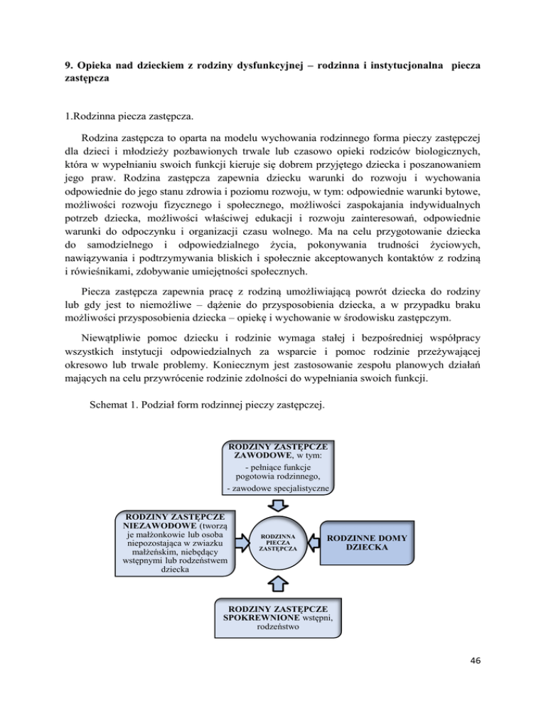 9. Opieka nad dzieckiem z rodziny dysfunkcyjnej – rodzinna i instytucjonalna piecza zastępcza 1.Rodzinna piecza zastępcza. Rodzina zastępcza to oparta na modelu wychowania rodzinnego forma pieczy zastępczej dla dzieci i młodzieży pozbawionych trwale lub czasowo opieki rodziców biologicznych, która w wypełnianiu swoich funkcji kieruje się dobrem przyjętego dziecka i poszanowaniem jego praw. Rodzina zastępcza zapewnia dziecku warunki do rozwoju i wychowania odpowiednie do jego stanu zdrowia i poziomu rozwoju, w tym: odpowiednie warunki bytowe, możliwości rozwoju fizycznego i społecznego, możliwości zaspokajania indywidualnych potrzeb dziecka, możliwości właściwej edukacji i rozwoju zainteresowań, odpowiednie warunki do odpoczynku i organizacji czasu wolnego. Ma na celu przygotowanie dziecka do samodzielnego i odpowiedzialnego życia, pokonywania trudności życiowych, nawiązywania i podtrzymywania bliskich i społecznie akceptowanych kontaktów z rodziną i rówieśnikami, zdobywanie umiejętności społecznych. Piecza zastępcza zapewnia pracę z rodziną umożliwiającą powrót dziecka do rodziny lub gdy jest to niemożliwe – dążenie do przysposobienia dziecka, a w przypadku braku możliwości przysposobienia dziecka – opiekę i wychowanie w środowisku zastępczym. Niewątpliwie pomoc dziecku i rodzinie wymaga stałej i bezpośredniej współpracy wszystkich instytucji odpowiedzialnych za wsparcie i pomoc rodzinie przeżywającej okresowo lub trwale problemy. Koniecznym jest zastosowanie zespołu planowych działań mających na celu przywrócenie rodzinie zdolności do wypełniania swoich funkcji. Schemat 1. Podział form rodzinnej pieczy zastępczej. RODZINY ZASTĘPCZE ZAWODOWE, w tym: - pełniące funkcje pogotowia rodzinnego, - zawodowe specjalistyczne RODZINY ZASTĘPCZE NIEZAWODOWE (tworzą je małżonkowie lub osoba niepozostająca w zwiazku małżeńskim, niebędący wstępnymi lub rodzeństwem dziecka RODZINNA PIECZA ZASTĘPCZA RODZINNE DOMY DZIECKA RODZINY ZASTĘPCZE SPOKREWNIONE wstępni, rodzeństwo 46