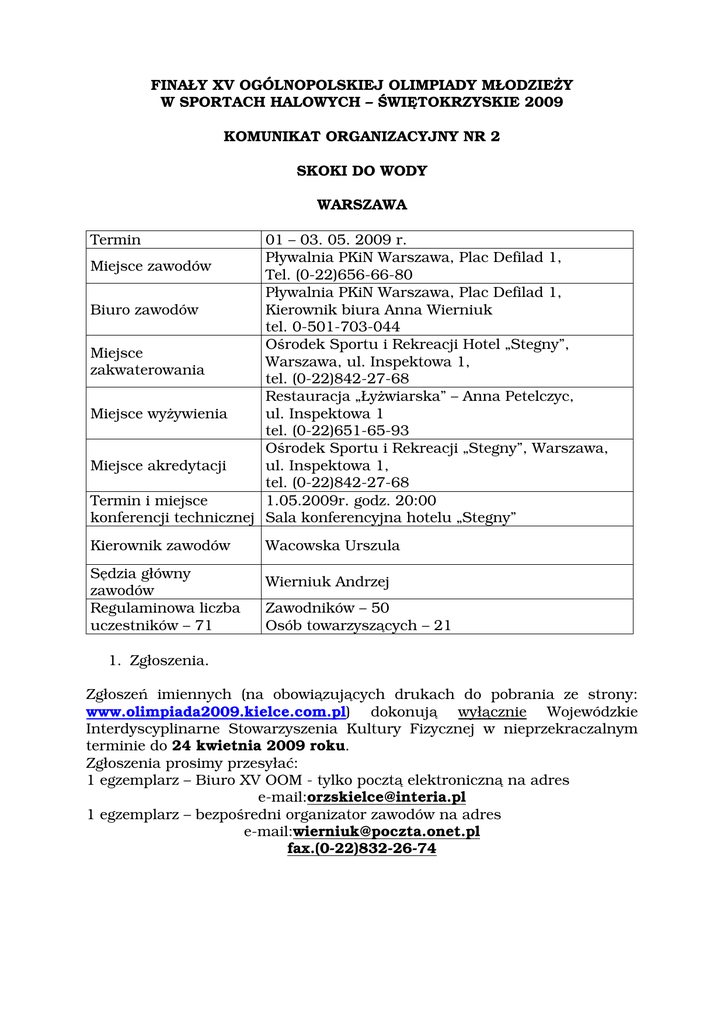 FINAŁY XV OGÓLNOPOLSKIEJ OLIMPIADY MŁODZIEŻY W SPORTACH HALOWYCH – ŚWIĘTOKRZYSKIE 2009 KOMUNIKAT ORGANIZACYJNY NR 2 SKOKI DO WODY WARSZAWA Termin 01 – 03. 05. 2009 r. Pływalnia PKiN Warszawa, Plac Defilad 1, Miejsce zawodów Tel. (0-22)656-66-80 Pływalnia PKiN Warszawa, Plac Defilad 1, Biuro zawodów Kierownik biura Anna Wierniuk tel. 0-501-703-044 Ośrodek Sportu i Rekreacji Hotel „Stegny”, Miejsce Warszawa, ul. Inspektowa 1, zakwaterowania tel. (0-22)842-27-68 Restauracja „Łyżwiarska” – Anna Petelczyc, Miejsce wyżywienia ul. Inspektowa 1 tel. (0-22)651-65-93 Ośrodek Sportu i Rekreacji „Stegny”, Warszawa, Miejsce akredytacji ul. Inspektowa 1, tel. (0-22)842-27-68 Termin i miejsce 1.05.2009r. godz. 20:00 konferencji technicznej Sala konferencyjna hotelu „Stegny” Kierownik zawodów Sędzia główny zawodów Regulaminowa liczba uczestników – 71 Wacowska Urszula Wierniuk Andrzej Zawodników – 50 Osób towarzyszących – 21 1. Zgłoszenia. Zgłoszeń imiennych (na obowiązujących drukach do pobrania ze strony: www.olimpiada2009.kielce.com.pl) dokonują wyłącznie Wojewódzkie Interdyscyplinarne Stowarzyszenia Kultury Fizycznej w nieprzekraczalnym terminie do 24 kwietnia 2009 roku. Zgłoszenia prosimy przesyłać: 1 egzemplarz – Biuro XV OOM - tylko pocztą elektroniczną na adres e-mail:[email protected] 1 egzemplarz – bezpośredni organizator zawodów na adres e-mail:[email protected] fax.(0-22)832-26-74 2. Warunki uczestnictwa. W Finałach XV OOM w sportach halowych mogą brać udział zawodnicy zakwalifikowani (zgodnie z wykazami sporządzonymi przez Polski Związek Sportowy) posiadający aktualną licencję w ilościach oraz rocznikach podanych w Regulaminie Współzawodnictwa Sportowego Dzieci i Młodzieży zamieszczonego na stronie Polskiej Federacji Sportu Młodzieżowego www.sportmlodziezowy.pl 3. Program zawodów: 1.05.2009 – piątek od godz. 12:00 godz. 15:00 - 18:00 godz. 20:00 2.05.2009 – sobota godz. 9:00 godz. 10:00 godz. 11:30 godz. 12:30 godz. 13:00 godz. 16:00 godz. godz. godz. godz. 16:30 18:00 19:00 19:30 3.05.2009 – niedziela godz. 9:00 godz. 10:00 godz. 11:00 godz. 12:30 godz. 13:15 godz. 14:15 wyjazd po obiedzie przyjazd ekip, zakwaterowanie i obiad trening konferencja techniczna trening grupa C dziewczęta – 1m grupa C chłopcy – 3m grupa B dziewczęta – 1m grupa B chłopcy – 3m uroczyste otwarcie XV OOM w skokach do wody grupa C dziewczęta 3m grupa C chłopcy – wieża grupa B dziewczęta – 3m grupa B chłopcy - wieża trening grupa C dziewczęta – wieża grupa C chłopcy – 1m grupa B dziewczęta – wieża grupa B chłopcy – 1m dekoracja i zamknięcie zawodów
