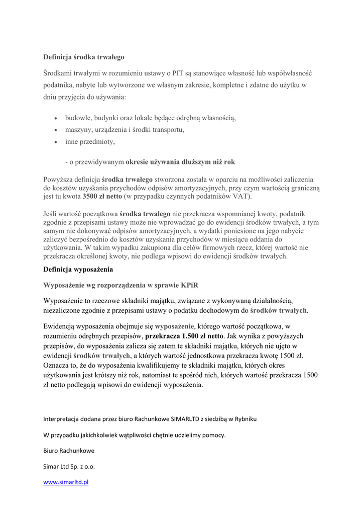 Definicja środka trwałego Środkami trwałymi w rozumieniu ustawy o PIT są stanowiące własność lub współwłasność podatnika, nabyte lub wytworzone we własnym zakresie, kompletne i zdatne do użytku w dniu przyjęcia do używania: • budowle, budynki oraz lokale będące odrębną własnością, • maszyny, urządzenia i środki transportu, • inne przedmioty, - o przewidywanym okresie używania dłuższym niż rok Powyższa definicja środka trwałego stworzona została w oparciu na możliwości zaliczenia do kosztów uzyskania przychodów odpisów amortyzacyjnych, przy czym wartością graniczną jest tu kwota 3500 zł netto (w przypadku czynnych podatników VAT). Jeśli wartość początkowa środka trwałego nie przekracza wspomnianej kwoty, podatnik zgodnie z przepisami ustawy może nie wprowadzać go do ewidencji środków trwałych, a tym samym nie dokonywać odpisów amortyzacyjnych, a wydatki poniesione na jego nabycie zaliczyć bezpośrednio do kosztów uzyskania przychodów w miesiącu oddania do użytkowania. W takim wypadku zakupiona dla celów firmowych rzecz, której wartość nie przekracza określonej kwoty, nie podlega wpisowi do ewidencji środków trwałych. Definicja wyposażenia Wyposażenie wg rozporządzenia w sprawie KPiR Wyposażenie to rzeczowe składniki majątku, związane z wykonywaną działalnością, niezaliczone zgodnie z przepisami ustawy o podatku dochodowym do środków trwałych. Ewidencją wyposażenia obejmuje się wyposażenie, którego wartość początkowa, w rozumieniu odrębnych przepisów, przekracza 1.500 zł netto. Jak wynika z powyższych przepisów, do wyposażenia zalicza się zatem te składniki majątku, których nie ujęto w ewidencji środków trwałych, a których wartość jednostkowa przekracza kwotę 1500 zł. Oznacza to, że do wyposażenia kwalifikujemy te składniki majątku, których okres użytkowania jest krótszy niż rok, natomiast te spośród nich, których wartość przekracza 1500 zł netto podlegają wpisowi do ewidencji wyposażenia. Interpretacja dodana przez biuro Rachunkowe SIMARLTD z siedzibą w Rybniku W przypadku jakichkolwiek wątpliwości chętnie udzielimy pomocy. Biuro Rachunkowe Simar Ltd Sp. z o.o. www.simarltd.pl Podsumowanie Tak więc większość otaczających nas rzeczy jest środkami trwałymi, lecz ze względu na ich niską wartość przepisy nie wymagają wprowadzania ich do ewidencji środków trwałych. Zdarza się, że podatnicy zakupują sprzęty o wartości przekraczającej kwotę 3500 zł, których jednak - ze względu na planowany okres użytkowania krótszy niż rok - nie ujmują w ewidencji środków trwałych. Sprzęt taki staje się zatem wyposażeniem. Ujmowany jest bezpośrednio w kosztach oraz wpisywany do ewidencji wyposażenia. Podstawą w tej kwestii jest jednak fakt, że sprzęt ten nie może być wykorzystywany w działalności dłużej niż rok. Zatem z upływem tego okresu powinien być co do zasady np. sprzedany bądź zlikwidowany. Interpretacja dodana przez biuro Rachunkowe SIMARLTD z siedzibą w Rybniku W przypadku jakichkolwiek wątpliwości chętnie udzielimy pomocy. Biuro Rachunkowe Simar Ltd Sp. z o.o. www.simarltd.pl