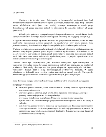 12. Ubóstwo Ubóstwo - to termin, który funkcjonuje w świadomości społecznej jako brak dostatecznych środków materialnych do życia, jako bieda, niedostatek. Idąc dalej - ubóstwo można zdefiniować także jako „stan poniżej pewnego zmiennego w czasie progu dochodowego lub progu realizacji potrzeb w odniesieniu do jednostki, rodziny lub grupy społecznej”.1 W biuletynie społeczno – gospodarczym infos prowadzonym na zlecenie Biura Analiz Sejmowych ubóstwo może być pojmowane w sposób absolutny lub względny (relatywny). W ujęciu absolutnym ubogie są osoby, rodziny lub gospodarstwa domowe, które nie mają możliwości zaspokojenia potrzeb uznanych za podstawowe, przy czym poziom życia jednostek ustalany jest niezależnie od poziomu życia innych członków społeczeństwa. W ujęciu względnym poziom zaspokojenia potrzeb jednostek odnoszony jest każdorazowo do poziomu zaspokojenia potrzeb przez innych członków społeczeństwa. Rozumiane w ten sposób ubóstwo jest wynikiem nadmiernych rozpiętości w poziomie zaspokojenia potrzeb ludzi. Nie może ono zostać całkowicie wyeliminowywane, a jedynie ograniczone przez zmniejszenie nierówności w poziomach życia. Ubóstwo może być rozpatrywanie jako zjawisko obiektywne bądź subiektywne. W pierwszym przypadku ocena dotycząca zaspokojenia potrzeb jest niezależna od osobistych przekonań. Najczęściej dokonywana jest przez ekspertów wyznaczających ilościowo i wartościowo koszyk dóbr i usług zaspokajających podstawowe potrzeby. W ujęciu subiektywnym jednostki same oceniają poziom zaspokojenia swoich potrzeb. Oba sposoby pomiaru mogą być stosowane zarówno w ujęciu absolutnym, jak i relatywnym. Dane dotyczące zasięgu ubóstwa obiektywnego publikuje GUS. W analizach uwzględnia następujące wskaźniki: relatywna granica ubóstwa, której wartość stanowi połowę średnich wydatków ogółu gospodarstw domowych. ustawowa granica ubóstwa, czyli kwota, która zgodnie z obowiązującą ustawą o pomocy społecznej uprawnia do ubiegania się o przyznanie świadczenia pieniężnego. Ustawowa granica ubóstwa pozostaje wynosi 634 zł dla jednoosobowego gospodarstwa domowego oraz 514 zł dla osoby w rodzinie; subiektywna granica ubóstwa, podstawą jej wyznaczenia są deklaracje respondentów dotyczące wysokości dochodów potrzebnych do realizacji podstawowych potrzeb. W uproszczeniu odpowiada ona poziomowi dochodów deklarowanych przez badanych jako ledwie im wystarczające; 1 T. Pilch, I. Lepalczyk, Pedagogika społeczna, Szczecin 2005. 68