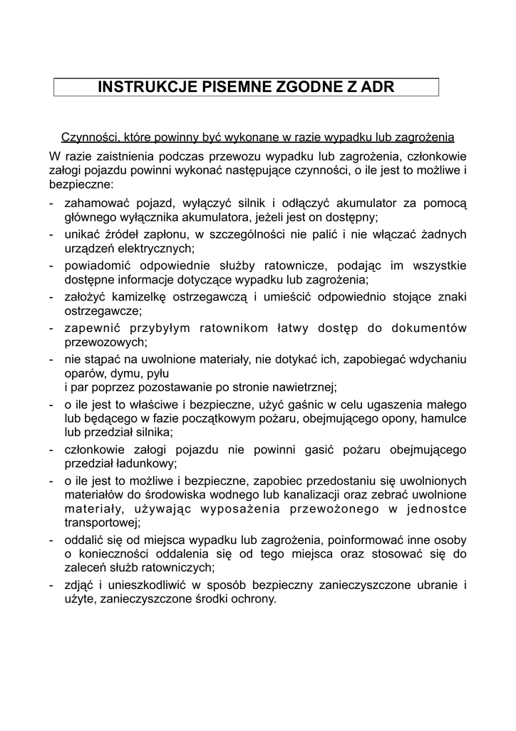 INSTRUKCJE PISEMNE ZGODNE Z ADR Czynności, które powinny być wykonane w razie wypadku lub zagrożenia W razie zaistnienia podczas przewozu wypadku lub zagrożenia, członkowie załogi pojazdu powinni wykonać następujące czynności, o ile jest to możliwe i bezpieczne: - zahamować pojazd, wyłączyć silnik i odłączyć akumulator za pomocą głównego wyłącznika akumulatora, jeżeli jest on dostępny; - unikać źródeł zapłonu, w szczególności nie palić i nie włączać żadnych urządzeń elektrycznych; - powiadomić odpowiednie służby ratownicze, podając im wszystkie dostępne informacje dotyczące wypadku lub zagrożenia; - założyć kamizelkę ostrzegawczą i umieścić odpowiednio stojące znaki ostrzegawcze; - zapewnić przybyłym ratownikom łatwy dostęp do dokumentów przewozowych; - nie stąpać na uwolnione materiały, nie dotykać ich, zapobiegać wdychaniu oparów, dymu, pyłu i par poprzez pozostawanie po stronie nawietrznej; - o ile jest to właściwe i bezpieczne, użyć gaśnic w celu ugaszenia małego lub będącego w fazie początkowym pożaru, obejmującego opony, hamulce lub przedział silnika; - członkowie załogi pojazdu nie powinni gasić pożaru obejmującego przedział ładunkowy; - o ile jest to możliwe i bezpieczne, zapobiec przedostaniu się uwolnionych materiałów do środowiska wodnego lub kanalizacji oraz zebrać uwolnione materiały, używając wyposażenia przewożonego w jednostce transportowej; - oddalić się od miejsca wypadku lub zagrożenia, poinformować inne osoby o konieczności oddalenia się od tego miejsca oraz stosować się do zaleceń służb ratowniczych; - zdjąć i unieszkodliwić w sposób bezpieczny zanieczyszczone ubranie i użyte, zanieczyszczone środki ochrony. Dodatkowe wskazówki dla członków załogi pojazdu dotyczące charakterystyki zagrożeń stwarzanych przez towary niebezpieczne określonej klasy oraz czynności zależnych od zaistniałych okoliczności Nalepki ostrzegawcze Charakterystyka zagrożeń Dodatkowe wskazówki (1) (2) Materiały i przedmioty wybuchowe Mogą posiadać rożne właściwości powodujących efekty takie jak: wybuch masowy, rozrzut odłamków, intensywny ogień / promieniowanie cieplne, świecenie, huk lub wydzielanie dymu. Są wrażliwe na wstrząsy, uderzenia i ciepło. Schronić się, pozostać z dala od okien. Niewielkie zagrożenie wybuchem i pożarem. Schronić się. Zagrożenie pożarem. Zagrożenie wybuchem. Mogą znajdować się pod ciśnieniem. Zagrożenie działaniem duszącym. Mogą powodować poparzenia lub odmrożenia. Zagrożenie wybuchem w przypadku ogrzania. Schronić się. Unikać zagłębień terenu. Zagrożenie działaniem duszącym. Mogą znajdować się pod ciśnieniem. Mogą powodować odmrożenia. Zagrożenie wybuchem w przypadku ogrzania. Schronić się. Unikać zagłębień terenu. Zagrożenie zatruciem. Mogą znajdować się pod ciśnieniem. Mogą powodować poparzenia lub odmrożenia. Zagrożenie wybuchem w przypadku ogrzania. Użyć maski ucieczkowej. Schronić się. Unikać zagłębień terenu. Zagrożenie pożarem. Zagrożenie wybuchem. Zagrożenie wybuchem w przypadku podgrzania. Schronić się. Unikać zagłębień terenu. 1 1.5 1.6 (3) Materiały i przedmioty wybuchowe 1.4 Gazy palne 2.1 Gazy niepalne, nietrujące 2.2 Gazy trujące 2.3 Materiały ciekłe zapalne 3 3 3 Materiały stałe zapalne, materiały samoreaktywne i materiały wybuchowe stałe odczulone 4 4.1 Materiały samozapalne 4 4.2 Zagrożenie pożarem. Materiały łatwopalne lub palne. Mogą zapalić na skutek działania ciepła, iskier lub otwartego płomienia. Mogą zawierać materiały samoreaktywne skłonne do rozkładu egzotermicznego w wyniku dostarczenia ciepła, kontaktu z innymi materiałami (takimi jak kwasy, związki metali ciężkich lub aminy), tarcia lub uderzenia. W wyniku rozkładu mogą wydzielać się szkodliwe i palne pary lub gazy lub może nastąpić samozapalenie. Zagrożenie wybuchem w przypadku ogrzania. Zagrożenie wybuchem materiałów wybuchowych odczulonych w przypadku ubytku substancji odczulającej. Zagrożenie pożarem przez samozapalenie w przypadku uszkodzenia sztuk przesyłki lub uwolnienia się zawartości. Mogą gwałtownie reagować z wodą. Materiały wytwarzające w zetknięciu z wodą gazy palne Zagrożenie pożarem i wybuchem w przypadku kontaktu z wodą. 4 4.3 4 Uwolniony materiał powinien być utrzymywany w stanie suchym, pod przykryciem. Nalepki ostrzegawcze Charakterystyka zagrożeń Dodatkowe wskazówki (1) (2) (3) Materiały utleniające Zagrożenie gwałtowną reakcją, pożarem i wybuchem w przypadku kontaktu materiałami palnymi. 5.1 Nie dopuszczać do zmieszania z materiałami palnymi (np. z trocinami). 5.1 Nadtlenki organiczne 5.2 5.2 5.2 Zagrożenie rozkładem egzotermicznym wskutek dostarczenia ciepła, kontaktu z innymi materiałami Nie dopuszczać do (takimi jak kwasy, związki metali ciężkich i aminy), tarcia zmieszania z materiałami lub uderzenia. W wyniku rozkładu mogą wydzielać się palnymi (np. z trocinami). szkodliwe i palne pary lub gazy lub może nastąpić samozapalenie. Materiały trujące Zagrożenie zatruciem w wyniku wdychania, kontaktu ze skórą lub połknięcia. Użyć maski ucieczkowej. Zagrożenie w przypadku przedostania się do środowiska wodnego lub kanalizacji. 6.1 Materiały zakaźne 6.2 Zagrożenie zakażeniem. Może spowodować groźną chorobę u ludzi lub u zwierząt. Zagrożenie w przypadku przedostania się do środowiska wodnego lub kanalizacji. Materiały promieniotwórcze 7A 7B Zagrożenie wchłonięciem i napromieniowaniem zewnętrznym. Ograniczyć czas narażenia. 7C 7D Materiały rozszczepialne Zagrożenie reakcją łańcuchową. 7E Materiały żrące 8 Różne materiały i przedmioty niebezpieczne 9 Zagrożenie poparzeniem chemicznym. Mogą gwałtownie reagować ze sobą, z wodą i z innymi materiałami. Uwolnione materiały mogą wydzielać żrące pary. Zagrożenie w przypadku przed