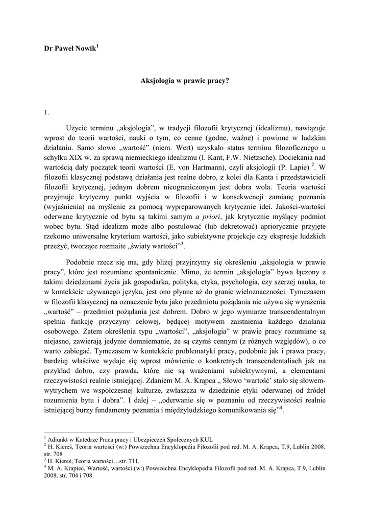 Dr Paweł Nowik1 Aksjologia w prawie pracy? Użycie terminu