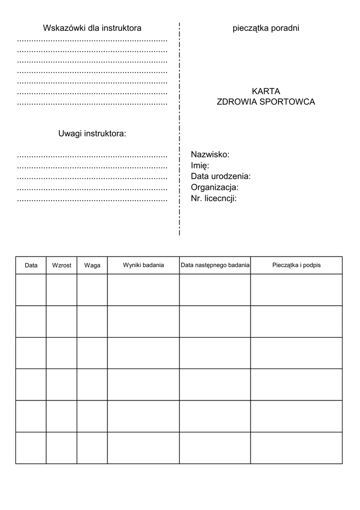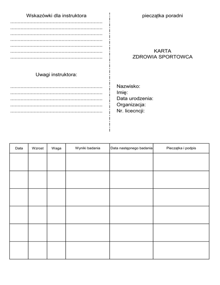 Wskazówki dla instruktora ............................................................... ............................................................... ............................................................... ............................................................... ............................................................... ............................................................... ............................................................... pieczątka poradni KARTA ZDROWIA SPORTOWCA Uwagi instruktora: ............................................................... ............................................................... ............................................................... ............................................................... ............................................................... Data Wzrost Waga Wyniki badania Nazwisko: Imię: Data urodzenia: Organizacja: Nr. licecncji: Data następnego badania Pieczątka i podpis Data Wzrost Waga Wyniki badania Data następnego badania Pieczątka i podpis Data Wzrost Waga Wyniki badania Data następnego badania Pieczątka i podpis