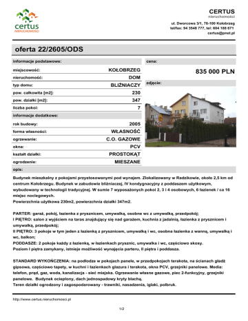 CERTUS nieruchomości ul. Dworcowa 3/1, 78-100 Kołobrzeg tel/fax: 94 3548 777, tel: 604 188 671 [email protected] oferta 22/2605/ODS informacje podstawowe: miejscowość: cena: KOŁOBRZEG typ domu: 835 000 PLN DOM nieruchomość: BLIŹNIACZY pow. całkowita [m2]: 230 pow. działki [m2]: 347 zdjęcie: 7 liczba pokoi: informacje dodatkowe: 2005 rok budowy: forma własności: ogrzewanie: WŁASNOŚĆ C.O. GAZOWE PCV okna: kształt działki: ogrodzenie: PROSTOKĄT MIESZANE opis: Budynek mieszkalny z pokojami przystosowanymi pod wynajem. Zlokalizowany w Radzikowie, około 2,5 km od centrum Kołobrzegu. Budynek w zabudowie bliźniaczej, IV kondygnacyjny z poddaszem użytkowym, wybudowany w technologii tradycyjnej. W sumie 7 wyposażonych pokoi 2, 3 i 4 osobowych, 6 łazienek / ca 16 miejsc noclegowych. Powierzchnia użytkowa 230m2, powierzchnia działki 347m2. PARTER: garaż, pokój, łazienka z prysznicem, umywalką, osobne wc z umywalką, przedpokój; I PIĘTRO: salon z wyjściem na taras znajdujący się nad garażem, kuchnia z jadalnią, łazienka z prysznicem i umywalką, przedpokój; II PIĘTRO: 3 pokoje w tym jeden z łazienką z prysznicem, umywalką i wc, osobna łazienka z wanną, umywalką i wc, balkon; PODDASZE: 2 pokoje każdy z łazienką, w łazienkach prysznic, umywalka i wc, częściowo skosy. Poziom I piętra zamykany, istnieje możliwość wynajęcia parteru, II piętra i poddasza. STANDARD WYKOŃCZENIA: na podłodze w pokojach panele, w przedpokojach terakota, na ścianach gładź gipsowa, częściowo tapety, w kuchni i łazienkach glazura i terakota, okna PCV, grzejniki panelowe. Media: telefon, prąd, gaz, woda, kanalizacja - sieć miejska. Ogrzewanie własne gazowe, piec 2-funkcyjny, grzejniki panelowe. Budynek ocieplony, dach jednospadowy kryty blachą. Teren działki ogrodzony i zagospodarowany - trawniki, nasadzenia, iglaki, polbruk. http://www.certus.nieruchomosci.pl 1/2 CERTUS nieruchomości ul. Dworcowa 3/1, 78-100 Kołobrzeg tel/fax: 94 3548 777, tel: 604 188 671 [email protected] LOKALIZACJA: osiedle Radzikowo III, zachodnia część miasta - osiedle domów jednorodzinnych, niska zabudowa. Cicha spokojna okolica, odległość do plaży ok.1200 metrów. W bezpośrednim sąsiedztwie liczne sklepy, kawiarnie, tereny zielone. Termin wydania nieruchomości do uzgodnienia. W cenie pełne umeblowanie. W celu uzyskania szczegółowych informacji o ofercie prosimy o kontakt telefoniczny, bądź mailowy. http://www.certus.nieruchomosci.pl 2/2