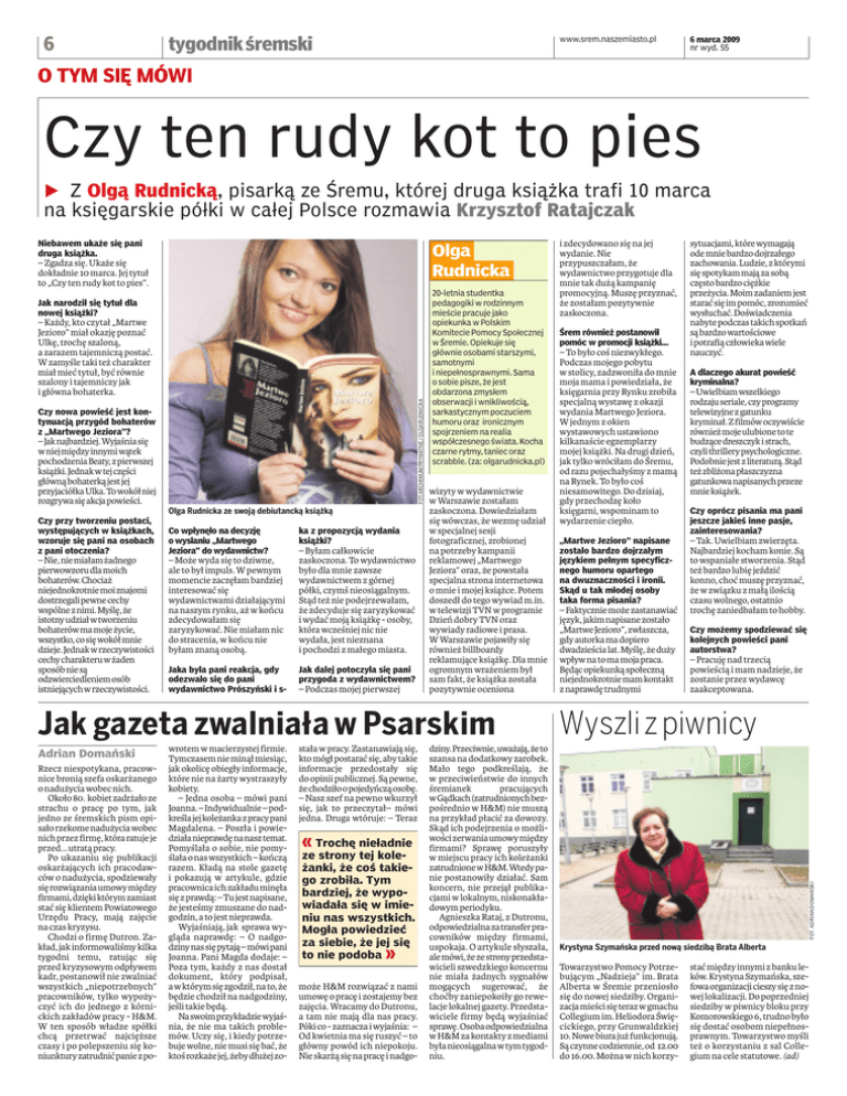 6 www.srem.naszemiasto.pl tygodnik śremski 6 marca 2009 nr wyd. 55 O TYM SIĘ MÓWI Czy ten rudy kot to pies b Z Olgą Rudnicką, pisarką ze Śremu, której druga książka trafi 10 marca na księgarskie półki w całej Polsce rozmawia Krzysztof Ratajczak Olga Rudnicka – Zgadza się. Ukaże się dokładnie 10 marca. Jej tytuł to „Czy ten rudy kot to pies”. Jak narodził się tytuł dla nowej książki? FOT.ARCHIWUM PRYWATNE / OLGARUDNICKA – Każdy, kto czytał „Martwe Jezioro” miał okazję poznać Ulkę, trochę szaloną, a zarazem tajemniczą postać. W zamyśle taki też charakter miał mieć tytuł, być równie szalony i tajemniczy jak i główna bohaterka. Czy nowa powieść jest kontynuacją przygód bohaterów z „Martwego Jeziora”? – Jak najbardziej. Wyjaśnia się w niej między innymi wątek pochodzenia Beaty, zpierwszej książki. Jednak w tej części główną bohaterką jest jej przyjaciółka Ulka. To wokół niej rozgrywa się akcja powieści. Olga Rudnicka ze swoją debiutancką książką Czy przy tworzeniu postaci, występujących w książkach, wzoruje się pani na osobach z pani otoczenia? – Nie, nie miałam żadnego pierwowzoru dla moich bohaterów. Chociaż niejednokrotnie moi znajomi dostrzegali pewne cechy wspólne znimi. Myślę, że istotny udział wtworzeniu bohaterów ma moje życie, wszystko, co się wokół mnie dzieje. Jednak wrzeczywistości cechy charakteru wżaden sposób nie są odzwierciedleniem osób istniejących w rzeczywistości. Co wpłynęło na decyzję o wysłaniu „Martwego Jeziora” do wydawnictw? – Może wyda się to dziwne, ale to był impuls. W pewnym momencie zaczęłam bardziej interesować się wydawnictwami działającymi na naszym rynku, aż w końcu zdecydowałam się zaryzykować. Nie miałam nic do stracenia, w końcu nie byłam znaną osobą. Jaka była pani reakcja, gdy odezwało się do pani wydawnictwo Prószyński i s- ka z propozycją wydania książki? – Byłam całkowicie zaskoczona. To wydawnictwo było dla mnie zawsze wydawnictwem z górnej półki, czymś nieosiągalnym. Stąd też nie podejrzewałam, że zdecyduje się zaryzykować i wydać moją książkę - osoby, która wcześniej nic nie wydała, jest nieznana i pochodzi z małego miasta. Jak dalej potoczyła się pani przygoda z wydawnictwem? – Podczas mojej pierwszej 20-letnia studentka pedagogiki w rodzinnym mieście pracuje jako opiekunka w Polskim Komitecie Pomocy Społecznej w Śremie. Opiekuje się głównie osobami starszymi, samotnymi i niepełnosprawnymi. Sama o sobie pisze, że jest obdarzona zmysłem obserwacji i wnikliwością, sarkastycznym poczuciem humoru oraz ironicznym spojrzeniem na realia współczesnego świata. Kocha czarne rytmy, taniec oraz scrabble. (za: olgarudnicka.pl) wizyty w wydawnictwie w Warszawie zostałam zaskoczona. Dowiedziałam się wówczas, że wezmę udział w specjalnej sesji fotograficznej, zrobionej na potrzeby kampanii reklamowej „Martwego Jeziora” oraz, że powstała specjalna strona internetowa o mnie i mojej książce. Potem doszedł do tego wywiad m.in. w telewizji TVN w programie Dzień dobry TVN oraz wywiady radiowe i prasa. W Warszawie pojawiły się również billboardy reklamujące książkę. Dla mnie ogromnym wrażeniem był sam fakt, że książka została pozytywnie oceniona Jak gazeta zwalniała w Psarskim Adrian Domański Rzecz niespotykana, pracownice bronią szefa oskarżanego o nadużycia wobec nich. Około 80. kobiet zadrżało ze strachu o pracę po tym, jak jedno ze śremskich pism opisało rzekome nadużycia wobec nich przez firmę, która ratuje je przed... utratą pracy. Po ukazaniu się publikacji oskarżających ich pracodawców o nadużycia, spodziewały się rozwiązania umowy między firmami, dzięki którym zamiast stać się klientem Powiatowego Urzędu Pracy, mają zajęcie na czas kryzysu. Chodzi o firmę Dutron. Zakład, jak informowaliśmy kilka tygodni temu, ratując się przed kryzysowym odpływem kadr, postanowił nie zwalniać wszystkich „niepotrzebnych” pracowników, tylko wypożyczyć ich do jednego z kórnickich zakładów pracy - H&M. W ten sposób władze spółki chcą przetrwać najcięższe czasy i po polepszeniu się koniunkturyzatrudnićpaniezpo- wrotem w macierzystej firmie. Tymczasem nie minął miesiąc, jak okolicę obiegły informacje, które nie na żarty wystraszyły kobiety. – Jedna osoba – mówi pani Joanna. – Indywidualnie – podkreśla jej koleżanka zpracy pani Magdalena. – Poszła i powiedziałanieprawdęnanasztemat. Pomyślała o sobie, nie pomyślała o nas wszystkich – kończą razem. Kładą na stole gazetę i pokazują w artykule, gdzie pracownica ich zakładu minęła się z prawdą: – Tu jest napisane, że jesteśmy zmuszane do nadgodzin, a to jest nieprawda. Wyjaśniają, jak sprawa wygląda naprawdę: – O nadgodziny nas się pytają – mówi pani Joanna. Pani Magda dodaje: – Poza tym, każdy z nas dostał dokument, który podpisał, a w którym się zgodził, na to, że będzie chodził na nadgodziny, jeśli takie będą. Naswoimprzykładziewyjaśnia, że nie ma takich problemów. Uczy się, i kiedy potrzebuje wolne, nie musi się bać, że ktoś rozkaże jej, żeby dłużej zo- stała w pracy. Zastanawiają się, kto mógł postarać się, aby takie informacje przedostały się do opinii publicznej. Są pewne, żechodziłoopojedyńcząosobę. – Nasz szef na pewno wkurzył się, jak to przeczytał– mówi jedna. Druga wtóruje: – Teraz « Trochę nieładnie ze strony tej koleżanki, że coś takiego zrobiła. Tym bardziej, że wypowiadała się w imieniu nas wszystkich. Mogła powiedzieć za siebie, że jej się to nie podoba » może H&M rozwiązać z nami umowę o pracę i zostajemy bez zajęcia. Wracamy do Dutronu, a tam nie mają dla nas pracy. Póki co - zaznacza i wyjaśnia: – Od kwietnia ma się ruszyć – to główny powód ich niepokoju. Nie skarżą się na pracę i nadgo- dzin