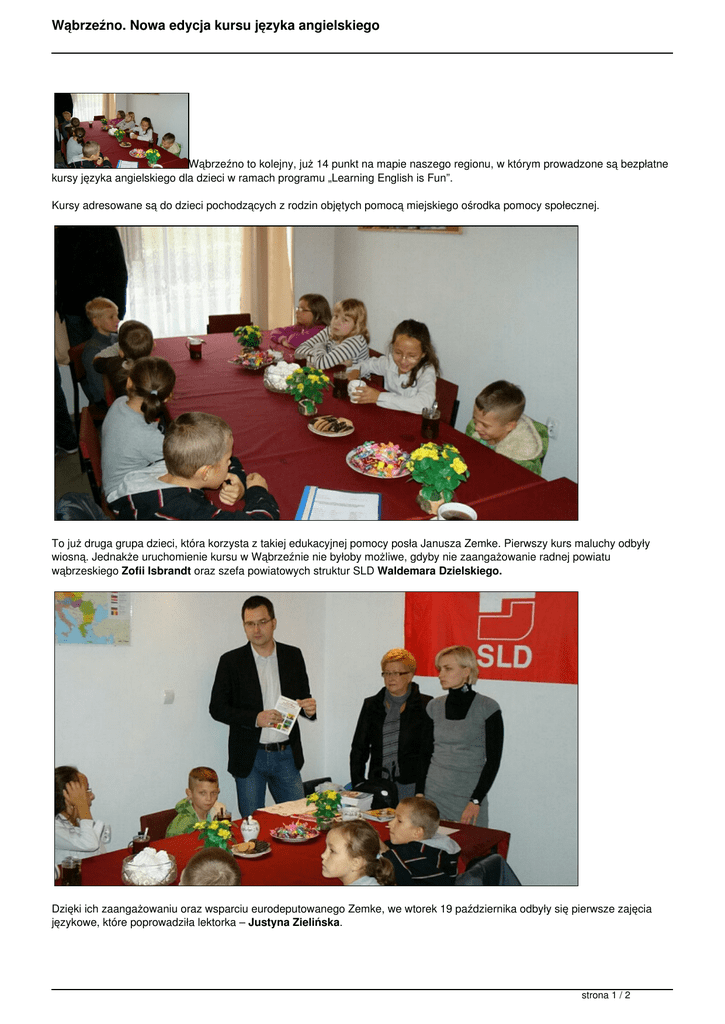 Wąbrzeźno. Nowa edycja kursu języka angielskiego Wąbrzeźno to kolejny, już 14 punkt na mapie naszego regionu, w którym prowadzone są bezpłatne kursy języka angielskiego dla dzieci w ramach programu „Learning English is Fun”. Kursy adresowane są do dzieci pochodzących z rodzin objętych pomocą miejskiego ośrodka pomocy społecznej. To już druga grupa dzieci, która korzysta z takiej edukacyjnej pomocy posła Janusza Zemke. Pierwszy kurs maluchy odbyły wiosną. Jednakże uruchomienie kursu w Wąbrzeźnie nie byłoby możliwe, gdyby nie zaangażowanie radnej powiatu wąbrzeskiego Zofii Isbrandt oraz szefa powiatowych struktur SLD Waldemara Dzielskiego. Dzięki ich zaangażowaniu oraz wsparciu eurodeputowanego Zemke, we wtorek 19 października odbyły się pierwsze zajęcia językowe, które poprowadziła lektorka – Justyna Zielińska. strona 1 / 2 Wąbrzeźno. Nowa edycja kursu języka angielskiego Program kursu „Learning English is Fun” realizowany jest w siedzibie Sojuszu Lewicy Demokratycznej oraz Punkcie Informacyjnym posła do Parlamentu Europejskiego przy ulicy Chełmińskiej 5 w Wąbrzeźnie. tekst: Tomek Puławski foto: Zbyszek Welenc Wąbrzeźno, 20 października 2011 r. strona 2 / 2