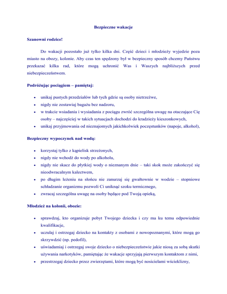 Bezpieczne wakacje Szanowni rodzice! Do wakacji pozostało już tylko kilka dni. Część dzieci i młodzieży wyjedzie poza miasto na obozy, kolonie. Aby czas ten spędzony był w bezpieczny sposób chcemy Państwu przekazać kilka rad, które mogą uchronić Was i Waszych najbliższych przed niebezpieczeństwem. Podróżując pociągiem – pamiętaj: unikaj pustych przedziałów lub tych gdzie są osoby nietrzeźwe, nigdy nie zostawiaj bagażu bez nadzoru, w trakcie wsiadania i wysiadania z pociągu zwróć szczególna uwagę na otaczające Cię osoby – najczęściej w takich sytuacjach dochodzi do kradzieży kieszonkowych, unikaj przyjmowania od nieznajomych jakichkolwiek poczęstunków (napoje, alkohol), Bezpieczny wypoczynek nad wodą: korzystaj tylko z kąpielisk strzeżonych, nigdy nie wchodź do wody po alkoholu, nigdy nie skacz do płytkiej wody o nieznanym dnie – taki skok może zakończyć się nieodwracalnym kalectwem, po długim leżeniu na słońcu nie zanurzaj się gwałtownie w wodzie – stopniowe schładzanie organizmu pozwoli Ci uniknąć szoku termicznego, zwracaj szczególna uwagę na osoby będące pod Twoją opieką, Młodzież na kolonii, obozie: sprawdzaj, kto organizuje pobyt Twojego dziecka i czy ma ku temu odpowiednie kwalifikacje, uczulaj i ostrzegaj dziecko na kontakty z osobami z nowopoznanymi, które mogą go skrzywdzić (np. pedofil), uświadamiaj i ostrzegaj swoje dziecko o niebezpieczeństwie jakie niosą za sobą skutki używania narkotyków, pamiętając że wakacje sprzyjają pierwszym kontaktom z nimi, przestrzegaj dziecko przez zwierzętami, które mogą być nosicielami wścieklizny, Zagrożenia wynikające z propozycji używania środków odurzających lub narkotyków: nie przyjmuj poczęstunków od nieznajomych, zwłaszcza w środkach komunikacji, pamiętaj, że posiadanie nawet najmniejszej ilości narkotyku jest prawnie zakazane, o pojawieniu się narkotyków powiadamiaj opiekuna lub osobę dorosłą, w razie potrzeby policję, Zagrożenia wynikające ze spożywania alkoholu: zdecydowanie odmawiaj każdorazowej propozycji spożycia napoju alkoholowego. miej świadomość, że każdy rodzaj alkoholu działa na organizm tak samo, opóźnia reakcję będąc pod wpływem alkoholu narażasz się na ryzyko stania się ofiarą przestępstwa lub jego sprawcą, Ryzyko zagrożeń przypadkowymi kontaktami seksualnymi: unikaj miejsc ustronnych, nieoświetlonych i odludnych, zapewniaj sobie towarzystwo osób znanych i życzliwych, nie obdarzaj zaufaniem nieznajomych, jeżeli napad stanie się faktem, głośno krzycz np. „pali się”, „pożar”, Inne niebezpieczne zachowania: nie wpuszczaj do domu nieznanych, obcych osób, nie obdarzaj zaufaniem nowopoznanych osób, które mogą wykorzystać łatwowierność grupy psychomanipulacyjnej, w rozmowach telefonicznych i osobistych kontaktach z nieznajomymi nie podawaj majątku i nieobecności dorosłych w domu, nie korzystaj z windy, gdy pasażerem jest osoba nieznana, zachowaj ostrożność w kontaktach z wolno biegającymi psami, będąc na dyskotece nigdy nie przyjmuj poczęstunku od nieznajomych — do podane dosypane substancje psychoaktywne, w różnym stopniu ograniczające świadomość, własny napój miej stale w zasięgu wzroku, aby uniknąć przykrej niespodzianki, Przy opracowaniu wykorzystano materiały Komendy Głównej Policji. Każdego roku w czasie letniego wypoczynku dochodzi do dużej ilości zdarzeń i wypadków z udziałem nieletnich. Przyczyną jest nie tylko brak zagospodarowania wolnego czasu dzieci i młodzieży, ale często również niewłaściwa opieka nad nimi ze strony rodziców czy prawnych opiekunów. Dochodzi do utonięć, spożywania alkoholu i narkotyków, uszkodzeń ciała podczas prac polowych, wypadków komunikacyjnych.