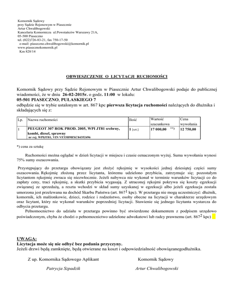 Komornik Sądowy przy Sądzie Rejonowym w Piasecznie Artur Chwalibogowski Kancelaria Komornicza ul.Powstańców Warszawy 21A, 05-500 Piaseczno tel. (022)726-83-21, fax 750-17-50 e-mail: [email protected] www.piasecznokomornik.pl Km 828/14 OBWIESZCZENIE O LICYTACJI RUCHOMOŚCI Komornik Sądowy przy Sądzie Rejonowym w Piasecznie Artur Chwalibogowski podaje do publicznej wiadomości, że w dniu 26-02-2015r. o godz. 11:00 w lokalu: 05-501 PIASECZNO, PUŁASKIEGO 7 odbędzie się w trybie ustalonym w art. 867 kpc pierwsza licytacja ruchomości należących do dłużnika i składających się z: Lp. Nazwa ruchomości Ilość 1 PEUGEOT 307 ROK PROD. 2005, WPI JT81 srebrny, kombi, diesel, sprawny 1 [szt.] Wartość szacunkowa 17 000,00 **) Cena wywołania 12 750,00 .nr rej. WPIJT81, VIN VF33H9HXC84352496 *) cena za sztukę Ruchomości można oglądać w dzień licytacji w miejscu i czasie oznaczonym wyżej. Suma wywołania wynosi 75% sumy oszacowania. Przystępujący do przetargu obowiązany jest złożyć rękojmię w wysokości jednej dziesiątej części sumy oszacowania. Rękojmię złożoną przez licytanta, któremu udzielono przybicia, zatrzymuje się; pozostałym licytantom rękojmię zwraca się niezwłocznie. Jeżeli nabywca nie wykonał w terminie warunków licytacji co do zapłaty ceny, traci rękojmię, a skutki przybicia wygasają. Z utraconej rękojmi pokrywa się koszty egzekucji związanej ze sprzedażą, a reszta wchodzi w skład sumy uzyskanej w egzekucji albo jeżeli egzekucja została umorzona jest przelewana na dochód Skarbu Państwa (art. 8671 kpc). W przetargu nie mogą uczestniczyć: dłużnik, komornik, ich małżonkowie, dzieci, rodzice i rodzeństwo, osoby obecne na licytacji w charakterze urzędowym oraz licytant, który nie wykonał warunków poprzedniej licytacji. Stawienie się jednego licytanta wystarcza do odbycia przetargu. Pełnomocnictwo do udziału w przetargu powinno być stwierdzone dokumentem z podpisem urzędowo poświadczonym, chyba że chodzi o pełnomocnictwo udzielone adwokatowi lub radcy prawnemu (art. 8672 kpc) UWAGA: Licytacja może się nie odbyć bez podania przyczyny. Jeżeli drzwi będą zamknięte, będą otwierane na koszt i odpowiedzialność obowiązanegodłużnika. Z up. Komornika Sądowego Aplikant Komornik Sądowy Patrycja Szpadzik Artur Chwalibogowski