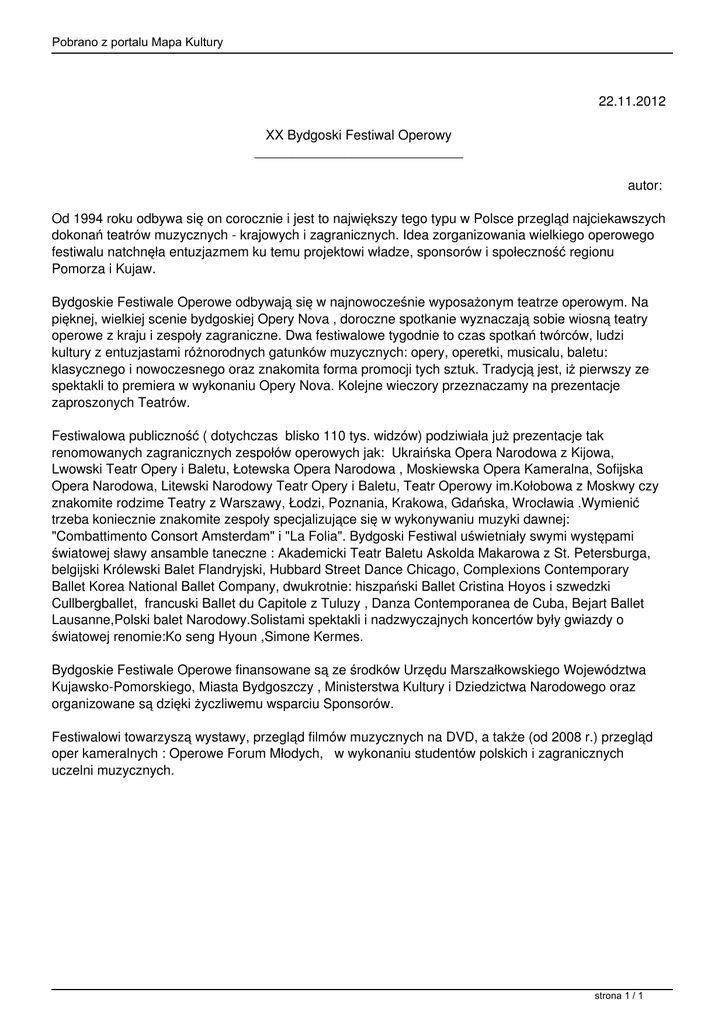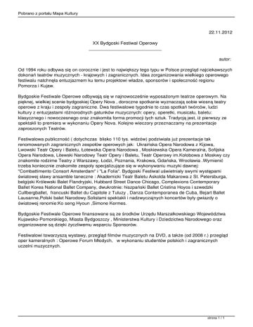 Pobrano z portalu Mapa Kultury 22.11.2012 XX Bydgoski Festiwal Operowy ____________________________ autor: Od 1994 roku odbywa się on corocznie i jest to największy tego typu w Polsce przegląd najciekawszych dokonań teatrów muzycznych - krajowych i zagranicznych. Idea zorganizowania wielkiego operowego festiwalu natchnęła entuzjazmem ku temu projektowi władze, sponsorów i społeczność regionu Pomorza i Kujaw. Bydgoskie Festiwale Operowe odbywają się w najnowocześnie wyposażonym teatrze operowym. Na pięknej, wielkiej scenie bydgoskiej Opery Nova , doroczne spotkanie wyznaczają sobie wiosną teatry operowe z kraju i zespoły zagraniczne. Dwa festiwalowe tygodnie to czas spotkań twórców, ludzi kultury z entuzjastami różnorodnych gatunków muzycznych: opery, operetki, musicalu, baletu: klasycznego i nowoczesnego oraz znakomita forma promocji tych sztuk. Tradycją jest, iż pierwszy ze spektakli to premiera w wykonaniu Opery Nova. Kolejne wieczory przeznaczamy na prezentacje zaproszonych Teatrów. Festiwalowa publiczność ( dotychczas blisko 110 tys. widzów) podziwiała już prezentacje tak renomowanych zagranicznych zespołów operowych jak: Ukraińska Opera Narodowa z Kijowa, Lwowski Teatr Opery i Baletu, Łotewska Opera Narodowa , Moskiewska Opera Kameralna, Sofijska Opera Narodowa, Litewski Narodowy Teatr Opery i Baletu, Teatr Operowy im.Kołobowa z Moskwy czy znakomite rodzime Teatry z Warszawy, Łodzi, Poznania, Krakowa, Gdańska, Wrocławia .Wymienić trzeba koniecznie znakomite zespoły specjalizujące się w wykonywaniu muzyki dawnej: "Combattimento Consort Amsterdam" i "La Folia". Bydgoski Festiwal uświetniały swymi występami światowej sławy ansamble taneczne : Akademicki Teatr Baletu Askolda Makarowa z St. Petersburga, belgijski Królewski Balet Flandryjski, Hubbard Street Dance Chicago, Complexions Contemporary Ballet Korea National Ballet Company, dwukrotnie: hiszpański Ballet Cristina Hoyos i szwedzki Cullbergballet, francuski Ballet du Capitole z Tuluzy , Danza Contemporanea de Cuba, Bejart Ballet Lausanne,Polski balet Narodowy.Solistami spektakli i nadzwyczajnych koncertów były gwiazdy o światowej renomie:Ko seng Hyoun ,Simone Kermes. Bydgoskie Festiwale Operowe finansowane są ze środków Urzędu Marszałkowskiego Województwa Kujawsko-Pomorskiego, Miasta Bydgoszczy , Ministerstwa Kultury i Dziedzictwa Narodowego oraz organizowane są dzięki życzliwemu wsparciu Sponsorów. Festiwalowi towarzyszą wystawy, przegląd filmów muzycznych na DVD, a także (od 2008 r.) przegląd oper kameralnych : Operowe Forum Młodych, w wykonaniu studentów polskich i zagranicznych uczelni muzycznych. strona 1 / 1