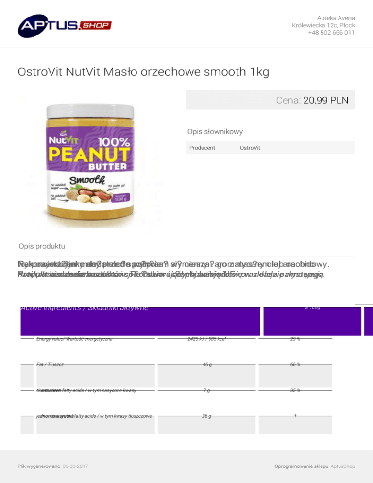 Apteka Avena Królewiecka 12c, Płock +48 502 666 011 OstroVit NutVit Masło orzechowe smooth 1kg Cena: 20,99 PLN Opis słownikowy Producent OstroVit Opis produktu wykorzysta? Na Rekomendujemy powierzchni jakomas?a aby dodatek przed mo?e dospo?yciem potrwa. wytr?ca? si? wymiesza? cenny i aromatyczny go z mas?emolej lubarachidowy. osobno Kraj pochodzenia orzechów: Pa?stwa UE. Produkt naturalnie niewzawiera bez dodatku orzechach. substancji cukru i soli. konserwujących, Cukier cz?onkowskie i sól pojawiające barwników sięoraz w składzie oleju palmowego. występują Active ingredients / Składniki aktywne Energy value/ Wartość energetyczna w 100g 2425 kJ / 585 kcal 29 % Fat / Tłuszcz 46 g 66 % tłuszczowe :saturated fatty acids / w tym nasycone kwasy 7g 35 % jednonienasycone :monosaturated fatty acids / w tym kwasy tłuszczowe 26 g † Plik wygenerowano: 03-03-2017 Oprogramowanie sklepu: AptusShop Apteka Avena Królewiecka 12c, Płock +48 502 666 011 wielonienasycone :polyunsaturated fatty acids / w tym kwasy tłuszczowe 13 g † Carbohydrates / Węglowodany 14 g 5% 3g 3% 25 g 50 % 12,5 mg <1% :sugars / w tym cukry Protein / Białko Salt / Sól INFORMACJA ALERGIKÓW : Produkt zawiera orzechy arachidowe. Produkt mo?e zawiera? DLA ?ladowe ilo?ci innych orzechów. Przechowywa? w temperaturze pokojowej. Plik wygenerowano: 03-03-2017 Powered by TCPDF (www.tcpdf.org) Oprogramowanie sklepu: AptusShop