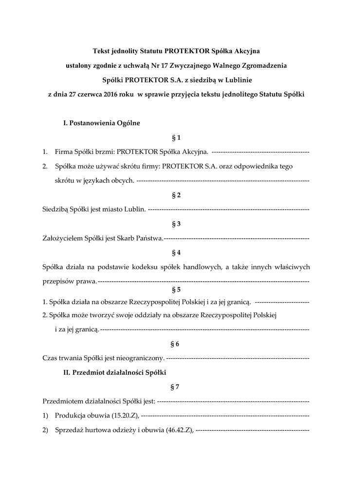Tekst jednolity Statutu PROTEKTOR Spółka Akcyjna ustalony zgodnie z uchwałą Nr 17 Zwyczajnego Walnego Zgromadzenia Spółki PROTEKTOR S.A. z siedzibą w Lublinie z dnia 27 czerwca 2016 roku w sprawie przyjęcia tekstu jednolitego Statutu Spółki I. Postanowienia Ogólne §1 1. Firma Spółki brzmi: PROTEKTOR Spółka Akcyjna. ------------------------------------------- 2. Spółka może używać skrótu firmy: PROTEKTOR S.A. oraz odpowiednika tego skrótu w językach obcych. ---------------------------------------------------------------------------§2 Siedzibą Spółki jest miasto Lublin. ----------------------------------------------------------------------§3 Założycielem Spółki jest Skarb Państwa. ---------------------------------------------------------------§4 Spółka działa na podstawie kodeksu spółek handlowych, a także innych właściwych przepisów prawa. --------------------------------------------------------------------------------------------§5 1. Spółka działa na obszarze Rzeczypospolitej Polskiej i za jej granicą. -----------------------2. Spółka może tworzyć swoje oddziały na obszarze Rzeczypospolitej Polskiej i za jej granicą. -------------------------------------------------------------------------------------------§6 Czas trwania Spółki jest nieograniczony. --------------------------------------------------------------II. Przedmiot działalności Spółki §7 Przedmiotem działalności Spółki jest: ------------------------------------------------------------------1) Produkcja obuwia (15.20.Z), -------------------------------------------------------------------------2) Sprzedaż hurtowa odzieży i obuwia (46.42.Z), -------------------------------------------------- 3) Sprzedaż detaliczna obuwia i wyrobów skórzanych prowadzona w wyspecjalizowanych sklepach (47.72.Z), ---------------------------------------------------------- 4) Działalność agentów zajmujących się sprzedażą wyrobów tekstylnych, odzieży, wyrobów futrzarskich, obuwia i artykułów skórzanych (46.16.Z), ------------------------- 5) Magazynowanie i przechowywanie pozostałych towarów (52.10.B), ---------------------- 6) Kupno i sprzedaż nieruchomości na własny rachunek (68.10.Z), --------------------------- 7) Wynajem i zarządzanie nieruchomościami własnymi lub dzierżawionymi (68.20.Z), 8) Wynajem i dzierżawa pozostałych maszyn, urządzeń oraz dóbr materialnych, gdzie indziej niesklasyfikowane (77.39.Z), ---------------------------------------------------------------- 9) Wynajem i dzierżawa samochodów osobowych i furgonetek (77.11.Z), ------------------ 10) Pozostała działalność wspomagająca prowadzenie działalności gospodarczej, gdzie indziej niesklasyfikowana (82.99.Z), ---------------------------------------------------------------11) Transport drogowy towarów (49.41.Z). -----------------------------------------------------------III. Kapitał własny § 8 - skreślony §9 1. Kapitał zakładowy Spółki wynosi 9.572.300 zł (dziewięć milionów pięćset siedemdziesiąt dwa tysiące trzysta złotych), a liczba akcji wynosi 19.021.600 (dziewiętnaście milionów dwadzieścia jeden tysięcy sześćset); wartość nominalna jednej akcji wynosi 0,50 zł (zero złotych pięćdziesiąt groszy). ------------------------------- 2. Akcje wymienione w § 9 ust. 1 niniejszego Statutu są akcjami zwykłymi na okaziciela: ------------------------------------------------------------------------------------------------- serii A - 5.988.480 sztuk,---------------------------------------------------------------------------- serii B - 3.376.170 sztuk, ---------------------------------------------------------------------------- serii C - 9.364.650 sztuk, ---------------------------------------------------------------------------- serii D - 292.300 sztuk. -----------------------------------------------------------------------------Akcje serii A zostały opłacone w całości przed zarejestrowaniem Spółki, zaś akcje serii B, C i D zostały opłacone w całości przed zarejestrowaniem podwyższenia kapitału zakładowego odpowiednio o emisję akcji serii B, C i D. Akcje serii D zostały objęte w zamian za wkład niepieniężny. ---------------------------------------------------------3. O podwyższeniu kapitału zakładowego Spółki decyduje Walne Zgromadzenie w drodze uchwały. ----------------------------------------------------------------------------------------- 4. Kapitał zakładowy Spółki może zostać podwyższony poprzez: ---------------------------a) emisję nowych akcji, także w ofercie publicznej; ------------------------------------------b) podniesienie wartości nominalnej akcji Spółki. -------------------------------------------- 5. Kapitał zakładowy Spółki może zostać pokryty także poprzez przeniesienie do niego z kapitału zapasowego lub rezerwowego kwoty określonej w uchwale Walnego Zgromadzenia.------------------------------------------------------------------------------- 6. Kapitał zakładowy Spółki może zostać obniżony poprzez:----------------------------------a) obniżenie wartości nominalnej akcji; ---------------------------------------------------------b) umorzenie części akcji.---------------------------------------------------------------------------- 7. Na pokrycie strat bilansowych tworzy się kapitał zapasowy, na który przelewa się co najmniej 8% rocznego zysku netto Spółki, dopóki kapitał ten nie osiągnie co najmniej 1/3 części kapitału zakładowego. -------------------------------------------------------- 8. O użyciu kapitału zapasowego decyduje Walne Zgromadzenie zwykłą większością głosów, przy czym część kapitału zapasowego w wysokości 1/3 kapitału zakładowego może być użyta jedynie do pokrycia strat bilansowych. — 9. Walne Zgromadzenie może postanowić o utworzeniu innych kapitałów lub funduszy celowych. ---------------------------------------------------------