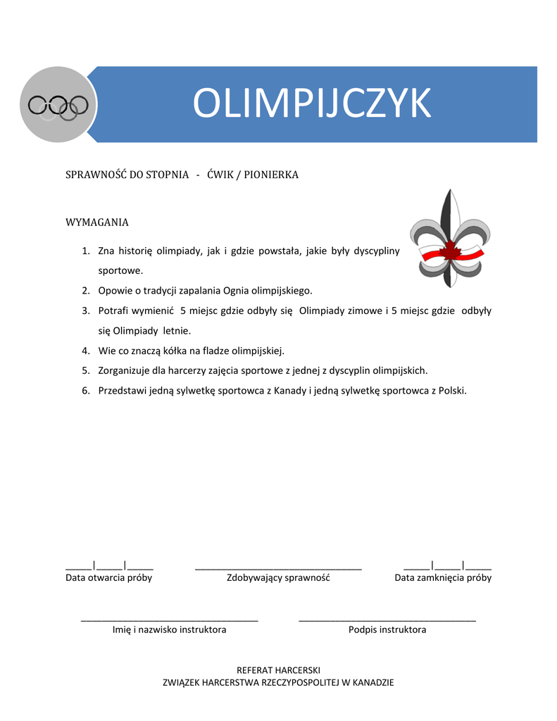 OLIMPIJCZYK SPRAWNOŚĆ DO STOPNIA - ĆWIK / PIONIERKA WYMAGANIA 1. Zna historię olimpiady, jak i gdzie powstała, jakie były dyscypliny sportowe. 2. Opowie o tradycji zapalania Ognia olimpijskiego. 3. Potrafi wymienić 5 miejsc gdzie odbyły się Olimpiady zimowe i 5 miejsc gdzie odbyły się Olimpiady letnie. 4. Wie co znaczą kółka na fladze olimpijskiej. 5. Zorganizuje dla harcerzy zajęcia sportowe z jednej z dyscyplin olimpijskich. 6. Przedstawi jedną sylwetkę sportowca z Kanady i jedną sylwetkę sportowca z Polski. _____|_____|_____ Data otwarcia próby ________________________________ Zdobywający sprawność __________________________________ Imię i nazwisko instruktora _____|_____|_____ Data zamknięcia próby __________________________________ Podpis instruktora REFERAT HARCERSKI ZWIĄZEK HARCERSTWA RZECZYPOSPOLITEJ W KANADZIE