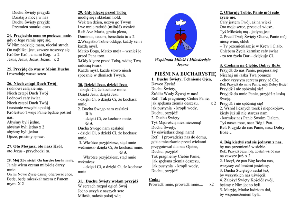 Duchu Święty przyjdź Działaj z mocą w nas Duchu Święty przyjdź Przemień smutku czas. 24. Przyjaciela mam co pociesza mnie, gdy o Jego ramię oprę się. W Nim nadzieję mam, uleciał strach. On najbliżej jest, zawsze troszczy się. Królów Król, z nami Bóg. x 2 Jezus, Jezus, Jezus, Jezus. x 2 25. Przyjdę do was w Moim Duchu i rozraduję wasze serca 29. Gdy klęczę przed Tobą modlę się i składam hołd. Weź ten dzień, uczyń go Twym i we mnie radość (miłość) wznieć. Ref: Ave Maria, gratia plena, Dominus, tecum, benedicta tu x 2 2.Wszystko Tobie oddaję, każdy sen i każdą myśl. Matko Boga, Matko moja – wznieś je przed Pana tron. 3.Gdy klęczę przed Tobą, widzę Twą radosną twarz. Każda myśl, każde słowo niech spocznie w dłoniach Twych. 26. Niech zstąpi Duch Twój i odnowi całą ziemię. Niech zstąpi Duch Twój i odnowi cały świat. Niech zstąpi Duch Twój i nastanie wszędzie pokój. Królestwo Twoje Panie będzie pośród nas. Abyśmy byli jedno, abyśmy byli jedno x 2 abyśmy byli jedno Ojcze, prosimy spraw. 30. Dzięki Jezu, dzięki Jezu - dzięki Ci, że kochasz mnie. Dzięki Jezu, dzięki Jezu - dzięki Ci, o dzięki Ci, że kochasz mnie. 2. Ducha Swego nam zesłałeś Dh - dzięki Ci, że kochasz mnie. GA Ducha Swego nam zesłałeś - dzięki Ci, o dzięki Ci, że kochasz mnie. 3. Wkrótce przyjdziesz, stąd mnie 27. Oto Mesjasz, oto nasz Król, weźmiesz- dzięki Ci, że kochasz mnie. oto Jezus - przychodzi tu. GA Wkrótce przyjdziesz, stąd mnie 28. Mój Zbawiciel, On bardzo kocha mnie. weźmiesz Ja nie wiem czemu miłością darzy - dzięki Ci, o dzięki Ci, że kochasz mnie. mnie On mi Nowe Życie dzisiaj ofiarować chce. Będę, będę mieszkał razem z Panem mym. X 2 31. Duchu Święty wołam przyjdź W sercach rozpal ogień Swój Jedno uczyń z naszych serc Miłość, radość pokój wlej. Wspólnota Miłość i Miłosierdzie Jezusa 2. Ofiaruję Tobie, Panie mój całe życie me. Cały jestem Twój, aż na wieki Oto moje serce, przecież wiesz.. Tyś Miłością mą - jedyną jest. 2. Przed Twój Święty Ołtarz, Panie mój niosę wino, chleb – Ty przemieniasz je w Krew i Ciało. Chlebem Życia karmisz cały świat - za ten życia Dar – dziękuję Ci. 3. Czekam na Ciebie, Dobry Boże Przyjdź do nas Panie, pośpiesz się! PIEŚNI NA EUCHARYSTIĘ Niechaj mi łaska Twa pomoże 1. Duchu Święty, Tchnienie Ojca, - chcę czystym sercem przyjąć Cię. Dawco Życia! Ref: Przyjdź do mnie Panie, mój Dobry Boże! Duchu Święty, Przyjdź i nie spóźniaj się! Źródło Wody Żywej w nas! Przyjdź do mnie Panie, przyjdź z łaską Ref.: Tak pragniemy Ciebie Panie, Swoją. jak spękana ziemia deszczu, x 2 Przyjdź i nie spóźniaj się! jak pustynia - kropli wody, 2. Wśród licznych trosk i niepokojów, Duchu, przyjdź! kiedy już sił nie starcza nam 2. Duchu Święty - karmisz nas Panie Swoim Ciałem. Tyś Mądrością niezmierzoną! Tyś nasza moc, nasz Bóg i Pan. Duchu Święty, Ref: Przyjdź do nas Panie, nasz Dobry Ty oświetlasz drogi nam! Boże… Ref.: I prowadzisz nas do domu, gdzie mieszkanie przed wiekami 4. Bóg kiedyś stał się jednym z nas, przygotował dla nas Ojciec, by nas przemienić w siebie. Ref.: Przyjdź Jezu mój, zostań wśród nas Duchu, przyjdź! na zawsze już. x 2 Tak pragniemy Ciebie Panie, 2. Uczył, że pan Bóg kocha nas, jak spękana ziemia deszczu, wszyscy zaś braćmi jesteśmy. jak pustynia - kropli wody, 3. Ducha Świętego zesłał też, Duchu, przyjdź! by wszystkich nas uświęcił. Coda: 4. Założył Święty Kościół swój, Prowadź mnie, prowadź mnie.... x2 byśmy z Nim jedno byli. 5. Maryję, Matkę ludziom dał, by wspomożeniem była. 5. Oto idzie mój Bóg, oto idzie mój Król! Oto Zbawiciel mój x 2 - a Imię Jego Jezus! Ref: Tęsknię za Tobą Panie! Wiem, że przyjdziesz niebawem. Z głębi serca dziś wołam: x 2 - MARANA THA! Moc Jego Ramienia nad swym ludem - Pan, mój Zbawca. *** 10. Przyjdź Jezu, przyjdź, czekamy dziś do naszych serc, do naszych dni. / x2 Niech spłynie Twoja łaska i niech wypełni mnie bo nadszedł czas by cały świat poznał Cię. Tyś Królem jest - wołamy przyjdź ! Tyś Królem jest - wołamy przyjdź! 6. Tak mi dobrze, że jesteś tu Panie/x2 Trzymaj mnie mocno dziś. Zawsze chcę przy Tobie być /x 2 Panie, Panie, Panie mój 2. Boża miłość wypełnia mnie,Panie/x2 11.Otwórz me oczy o Panie 3. Boża Radość… Pokój… Łaska Otwórz me oczy i serce Chcę widzieć Ciebie, chcę widzieć 7 . Jezus, najwyższe Imię, Ciebie! x2 Nasz Zbawiciel, Książę pokoju, Wywyższonego widzieć chcę Emmanuel, Bóg jest z nami, Ujrzeć Ciebie w blasku twej chwały Odkupiciel, Słowo Żywota. Wylej swą siłę i moc Święty Bóg, Mesjasz Gdy śpiewam Święty, Święty, Święty prawdziwy, jedyny Ojca Syn Święty, Święty Święty! umiłowany. Zgładził grzech, Chcę widzieć Ciebie, chcę widzieć Baranek na wieki, królów Król Ciebie! i panów Pan. 12. O Alleluja, Alleluja x 4 8. Wielbić Pana chcę O wychwalajcie Go wszystkie narody radosną śpiewać pieśń. i wysławiajcie Go wszystkie ludy. Wielbić Pana chcę, Jego łaskawość nad nami potężna On źródłem życia jest. a Jego wierność trwa na wieki. 9. Raduje się dusza ma - wielbi Pana swego. Będę Ci śpiewał z całej siły. Sławić Cię będę za Twe dzieła będę Ci śpiewał z całej siły. Błogosławić będę Twoje Imię, - jest miłosierny Pan Zastępów. 13. Wielki jest nasz Pan i godzien wielkiej chwały w mieście naszego Boga. Święta Jego Góra, wspaniałe wzniesienie radością jest całej ziemi. 14. Wielbić Imię Pana dziś chcę, Wielbić Imię Pana dziś chcę, Wielbić Imię Pana dziś chcę x 2 - to mój Bóg. 1. Imię Pana jest twierdzą, warowną twierdzą. Skałą zbawienia, x2 schronieniem mym. 15. Będę chwalił Pana na wieki, chwalił Pana na wieki Bez końca me usta niech wielbią Go/x2 Uwielbiaj Pana za mną I razem wywyższajmy Jego Imię! 16