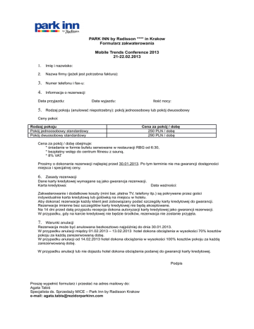 PARK INN by Radisson **** in Krakow Formularz zakwaterowania Mobile Trends Conference 2013 21-22.02.2013 1. Imię i nazwisko: 2. Nazwa firmy (jeżeli jest potrzebna faktura): 3. Numer telefonu i fax-u: 4. Informacja o rezerwacji Data przyjazdu: 5. Data wyjazdu: Ilość nocy: Rodzaj pokoju (anulować niepotrzebny): pokój jednoosobowy lub pokój dwuosobowy Ceny pokoi: Rodzaj pokoju Pokój jednoosobowy standardowy Pokój dwuosobowy standardowy Cena za pokój / dobę 250 PLN / dobę 290 PLN / dobę Cena za pokój / dobę obejmuje: * śniadanie w formie bufetu serwowane w restauracji RBG od 6:30, * bezpłatny wstęp do centrum fitnesu z sauną, * 8% VAT Prosimy o dokonanie rezerwacji najlepiej przed 30.01.2013. Po tym terminie nie ma gwarancji dostępności miejsca i specjalnej ceny. 6. Zasady rezerwacji Dane karty kredytowej wymagane są jako gwarancja rezerwacji. Karta kredytowa: Data ważności: Zakwaterowanie i dodatkowe koszty (mini bar, płatna TV, telefony itp.) są pokrywane przez gości indywidualnie karta kredytową lub gotówką na miejscu w hotelu. Aby dokonać rezerwacje każdy klient jest zobowiązany podać szczegóły karty kredytowej do gwarancji. Rezerwacje imienne bez szczegółów karty kredytowej nie będą akceptowane. Na 14 dni przed datą przyjazdu recepcja dokona autoryzacji karty kredytowej jako gwarancji rezerwacji. W przypadku, gdy na karcie kredytowej nie będzie środków, rezerwacja nie zostanie przyjęta. 7. Warunki anulacji Rezerwacja może być anulowana bezkosztowo najpóźniej do dnia 30.01.2013. W przypadku anulacji między 01.02.2013 – 13.02.2013 hotel dokona obciążenia w wysokości 70% kosztów pokoju za każdą zarezerwowaną dobę. W przypadku anulacji od 14.02.2013 hotel dokona obciążenia w wysokości 100% kosztów pokoju za każdą zarezerwowaną dobę. W przypadku anulacji lub nie dojazdu hotel dokona obciążenia podanej do gwarancji karty kredytowej. Podpis Proszę wypełnić formularz i przesłać na adres mailowy do: Agata Tabiś Specjalista ds. Sprzedaży MICE – Park Inn by Radisson Krakow e-mail: [email protected]