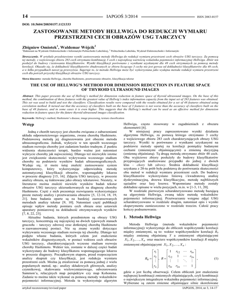 IAPGOŚ 3/2014 14 ISSN 2083-0157 DOI: 10.5604/20830157.1121333 ZASTOSOWANIE METODY HELLWIGA DO REDUKCJI WYMIARU PRZESTRZENI CECH OBRAZÓW USG TARCZYCY Zbigniew Omiotek1, Waldemar Wójcik2 Doktorant na Wydziale Elektrotechniki i Informatyki Politechniki Lubelskiej, 2 Politechnika Lubelska, Wydział Elektrotechniki i Informatyki 1 Streszczenie. W artykule przedstawiono wyniki zastosowania metody Hellwiga do redukcji wymiaru przestrzeni cech obrazów USG tarczycy. Za pomocą tej metody, z wejściowego zbioru 283 cech otrzymano kombinację 3 cech z największą wartością wskaźnika pojemności informacyjnej Hellwiga. Zbiór ten posłużył do budowy i testowania klasyfikatorów. Wyniki klasyfikacji porównano z wynikami uzyskanymi dla 48 cech otrzymanych za pomocą metody korelacji. Okazało się, że dokładność klasyfikatorów zbudowanych ze zbioru liczącego 3 cechy nie jest gorsza od dokładności klasyfikatorów dla 48 cech, a w kilku przypadkach nawet ją przewyższa. Sugeruje to, że metoda Hellwiga może być wykorzystana jako wydajna metoda redukcji wymiaru przestrzeni cech dla potrzeb przyszłej klasyfikacji obrazów USG tarczycy. Słowa kluczowe: metoda Hellwiga, choroba Hashimoto, przetwarzanie obrazów, klasyfikacja tekstur THE USE OF HELLWIG’S METHOD FOR DIMENSION REDUCTION IN FEATURE SPACE OF THYROID ULTRASOUND IMAGES Abstract. This paper presents the use of Hellwig’s method for dimension reduction in feature space of thyroid ultrasound images. On the base of this method, the combination of three features with the greatest value of Hellwig’s index information capacity from the input set of 283 features was obtained. This set was used to build and test the classifiers. Classification results were compared with the results obtained for a set of 48 features obtained using correlation method. It turned out that the accuracy of classifiers built on the base of 3 features is not worse than the accuracy of classifiers built on the base of 48 features, and in some cases it is even higher. This suggests that the Hellwig’s method can be used as an effective method for dimension reduction in feature space for the future thyroid ultrasound images classification. Keywords: Hellwig’s method, Hashimoto’s disease, image processing, texture classification Wstęp Jedną z chorób tarczycy jest choroba związana z zaburzeniami układu odpornościowego organizmu, zwana chorobą Hashimoto. Podstawową metodą jej diagnozowania jest obecnie metoda ultrasonograficzna. Jednak, wykrycie w ten sposób wczesnego stadium rozwoju choroby jest zadaniem bardzo trudnym. Z punktu widzenia skuteczności terapii, bardzo ważne jest natomiast wykrycie choroby jak najwcześniej. Dlatego też niezwykle istotne jest zwiększenie skuteczności wykrywania wczesnego stadium choroby na podstawie wyników badań ultrasonograficznych. Wydaje się, iż może tutaj znaleźć zastosowanie system komputerowy, który wykorzystując odpowiednią metodę automatycznej klasyfikacji obrazów, wspomagałaby lekarza w procesie diagnozy [15, 16]. Zdjęcia USG tarczycy, w procesie analizy obrazu, są traktowane jako obrazy teksturowe. Niestety, w literaturze można znaleźć niewiele wyników badań tekstur obrazów USG tarczycy ukierunkowanych na diagnozę choroby Hashimoto. Część z nich prezentuje rozwiązania wykorzystujące proste metody analizy i przetwarzania obrazów [5, 12-14, 18, 19, 21]. Inne badania oparte są na bardziej zaawansowanych metodach analizy tekstur [9, 10]. Natomiast część publikacji opisuje wpływ metody pomiaru cech obrazu oraz ustawień aparatury pomiarowej na dokładność otrzymywanych wyników [7, 8, 22, 23]. Aktualne badania, których przedmiotem są obrazy USG tarczycy, koncentrują się najczęściej na dwóch typowych stanach gruczołu – tarczycy zdrowej oraz dotkniętej chorobą Hashimoto w zaawansowanej postaci. Nie są znane wyniki dotyczące wykrywania wczesnego stadium rozwoju tej choroby. Dlatego też podjęto własne badania, których celem jest znalezienie wskaźników diagnostycznych, w postaci wektora cech obrazów USG tarczycy, charakteryzujących wczesne stadium rozwoju choroby Hashimoto. Wektor ten, zostanie w dalszej części badań wykorzystany do budowy klasyfikatora wspomagającego lekarza w procesie diagnozy. Początkowym etapem, przed rozpoczęciem analizy skupień czy klasyfikacji, jest redukcja wymiaru przestrzeni cech. Można ją zrealizować za pomocą jednej z wielu popularnych metod, np.: analizy składowych głównych, analizy czynnikowej, skalowania wielowymiarowego, odwzorowania Sammon’a, relacyjnych map perspektyw czy map Kohonena. Zadanie to można także wykonać za pomocą metody wskaźników pojemności informacyjnej. Metoda ta wykorzystuje algorytm artykuł recenzowany/revised paper Hellwiga, często stosowany w zagadnieniach z obszaru ekonometrii [6]. W niniejszej pracy zaprezentowano wyniki działania algorytmu Hellwiga, za pomocą którego otrzymano 3 cechy z wejściowego zbioru 283 cech charakteryzujących obrazy USG tarczycy. Wyniki te porównano z wynikami uzyskanymi na podstawie metody opartej na korelacji pomiędzy badanymi cechami (zmiennymi objaśniającymi) a zmienną decyzyjną (zmienną objaśnianą). Tą drugą metodą otrzymano zbiór 48 cech. Oba wyjściowe zbiory posłużyły do budowy klasyfikatorów przypisujących analizowane przypadki do jednej z dwóch klas – chory lub zdrowy. Średnia dokładność klasyfikacji uzyskana z 20-tu prób była podstawą do porównania skuteczności obu metod w redukcji wymiaru przestrzeni cech. Do budowy klasyfikatorów wykorzystano liniową i kwadratową analizę dyskryminacyjną, drzewa klasyfikacyjne, metodę najbliższych sąsiadów oraz lasy losowe. Wspomniane metody zostały dokładnie opisane w wielu pozycjach, m.in. w [1-3, 11, 20]. W rozdziale pierwszym scharakteryzowano metodę bazującą na algorytmie Hellwiga, zwaną także metodą wskaźników pojemności informacyjnej. Prze