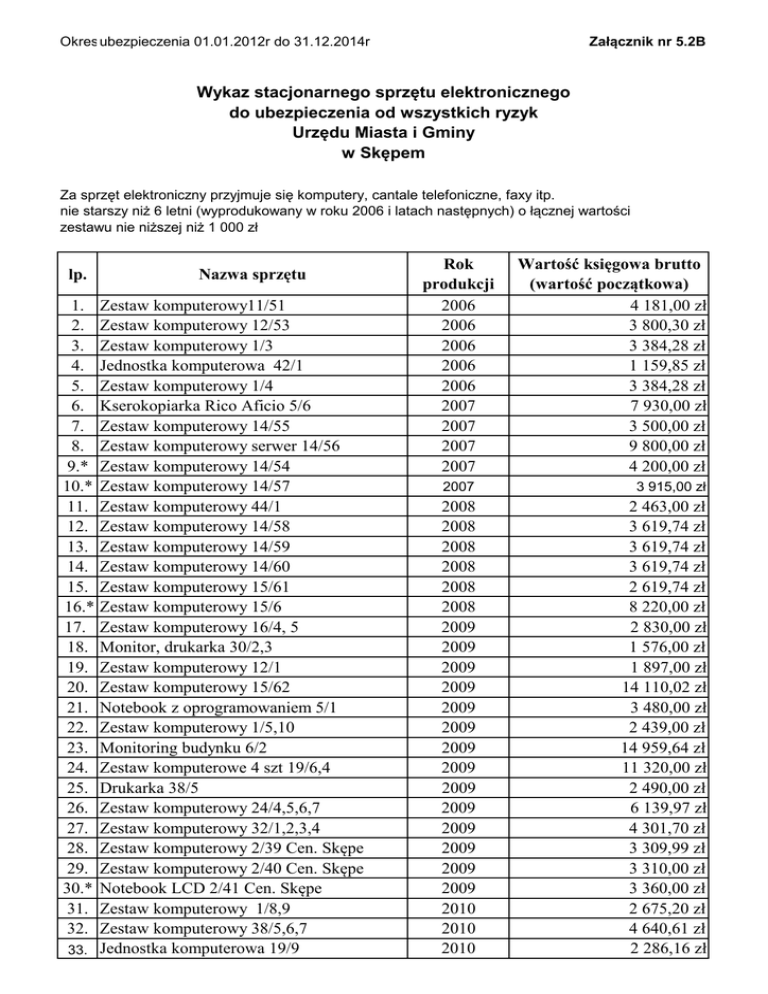 Okres ubezpieczenia ubezpieczenia 01.01.2012r od 01.01.2007 do do 31.12.2014r 31.12.2007 Załącznik nr 5.2B Wykaz stacjonarnego sprzętu elektronicznego do ubezpieczenia od wszystkich ryzyk Urzędu Miasta i Gminy w Skępem Za sprzęt elektroniczny przyjmuje się komputery, cantale telefoniczne, faxy itp. nie starszy niż 6 letni (wyprodukowany w roku 2006 i latach następnych) o łącznej wartości zestawu nie niższej niż 1 000 zł lp. 1. 2. 3. 4. 5. 6. 7. 8. 9.* 10.* 11. 12. 13. 14. 15. 16.* 17. 18. 19. 20. 21. 22. 23. 24. 25. 26. 27. 28. 29. 30.* 31. 32. Nazwa sprzętu Zestaw komputerowy11/51 Zestaw komputerowy 12/53 Zestaw komputerowy 1/3 Jednostka komputerowa 42/1 Zestaw komputerowy 1/4 Kserokopiarka Rico Aficio 5/6 Zestaw komputerowy 14/55 Zestaw komputerowy serwer 14/56 Zestaw komputerowy 14/54 Zestaw komputerowy 14/57 Zestaw komputerowy 44/1 Zestaw komputerowy 14/58 Zestaw komputerowy 14/59 Zestaw komputerowy 14/60 Zestaw komputerowy 15/61 Zestaw komputerowy 15/6 Zestaw komputerowy 16/4, 5 Monitor, drukarka 30/2,3 Zestaw komputerowy 12/1 Zestaw komputerowy 15/62 Notebook z oprogramowaniem 5/1 Zestaw komputerowy 1/5,10 Monitoring budynku 6/2 Zestaw komputerowe 4 szt 19/6,4 Drukarka 38/5 Zestaw komputerowy 24/4,5,6,7 Zestaw komputerowy 32/1,2,3,4 Zestaw komputerowy 2/39 Cen. Skępe Zestaw komputerowy 2/40 Cen. Skępe Notebook LCD 2/41 Cen. Skępe Zestaw komputerowy 1/8,9 Zestaw komputerowy 38/5,6,7 33. Jednostka komputerowa 19/9 Rok produkcji 2006 2006 2006 2006 2006 2007 2007 2007 2007 Wartość księgowa brutto (wartość początkowa) 4 181,00 zł 3 800,30 zł 3 384,28 zł 1 159,85 zł 3 384,28 zł 7 930,00 zł 3 500,00 zł 9 800,00 zł 4 200,00 zł 2007 3 915,00 zł 2008 2008 2008 2008 2008 2008 2009 2009 2009 2009 2009 2009 2009 2009 2009 2009 2009 2009 2009 2009 2010 2010 2010 2 463,00 zł 3 619,74 zł 3 619,74 zł 3 619,74 zł 2 619,74 zł 8 220,00 zł 2 830,00 zł 1 576,00 zł 1 897,00 zł 14 110,02 zł 3 480,00 zł 2 439,00 zł 14 959,64 zł 11 320,00 zł 2 490,00 zł 6 139,97 zł 4 301,70 zł 3 309,99 zł 3 310,00 zł 3 360,00 zł 2 675,20 zł 4 640,61 zł 2 286,16 zł 34. Zestaw komputerowy 32/7,8,9,10 35.* Notebook z oprogramowaniem 38/8 36. Jednostka komputerowa 42/2 37. Zestawy komputerowe 4 szt. Cent.Wólka 38. 39. 40. 41. 42. 43.* Zestaw komputerowy 21/7,8,9 Zestaw komputerowy 1/2,11,12 Projektor.Ronter.Ekran, Antena Cen.Wólka Drukarka Centrum Wólka Zestaw komputerowy 1/13 Notebook Centrum Wólka Razem * - zestaw przenośny 2011 2011 2011 2011 2011 2011 2011 2011 2011 2011 3 289,00 zł 2 200,00 zł 2 150,00 zł 20 229,82 zł 3 742,00 zł 3 324,00 zł 4 657,51 zł 1 080,80 zł 2 376,56 zł 3 466,96 zł 201 058,61 zł