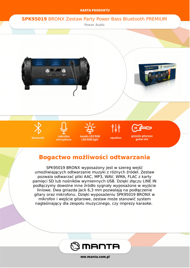 SPK95019BRONXZestawPartyPowerBassBluetoothPREMIUM PowerAudio Bogactwomożliwościodtwarzania SPK95019BRONXwyposażonyjestwszeregwejść umożliwiającychodtwarzaniemuzykizróżnychźródeł.Zestaw pozwalaodtwarzaćplikiAAC,MP3,WAV,WMA,FLACzkarty pamięciSDlubnośnikówwymiennychUSB.DziękizłączuLINEIN podłączymydowolneinneźródłosygnaływyposażonewwyjście liniowe.DwagniazdaJack6,3mmpozwalająnapodłączenie gitaryorazmikrofonu.DziękiwyposażeniuSPK95019BRONXw mikrofoniwejściegitarowe,zestawmożestanowićsystem nagłaśniającydlazespołumuzycznego,czyimprezykaraoke. SPK95019BRONXZestawPartyPowerBassBluetoothPREMIUM PowerAudio Specyfikacja Potężnebrzmieniew przenośnejobudowie SPK95019BRONXtozestawmuzycznyPartyPower Bassodużejmocymuzycznejzamkniętyw kompaktowejobudowiewkształcietuby.SPK95019 mawbudowanypotężnysubwooferośrednicy8” orazdwagłośnikistereo,każdyoprzekątnej3" mocy15W.ZestawSPK95019BRONXoferuje całkowitąmocnapoziomie3000WP.M.P.O. Wbudowanykorektorbarwydźwiękupozwala idealniedobraćbrzmienieutworówdoupodobań użytkownika. Bluetoothisterowanie smartfonem WurządzeniuklasyPREMIUM,jakimjestSPK95019 BRONX,niemożezabraknąćbezprzewodowego łączaBluetooth.DziękitechnologiiBluetooth możliwejestnietylkostrumienioweodtwarzanie muzykizsmartfonulubtabletupodłączonegodo zestawuSPK95019BRONX,aletakżesterowanie całymzestawemzapomocąspecjalnejaplikacji przeznaczonejdlasystemuAndroid.Wystarczy pobraćzeSklepuGooglePlayaplikację„Discolor DJ”imożnasterowaćwszystkimifunkcjami zestawu. Wbudowanegłośniki 3000WP.M.P.O.30W8''Woofer+2x15W 3" Zasilanie 220-240V,50-60HzWbudowany akumulator6000mAhCzaspracyna akumulatorze-4h Wymiary(SxWxG) 620x255x275mm Waga 6,6kg Złącza USB,AUX-in,podłaczenieMikrofonu-jack, podłaczeniegitary-jack, RadioFM Nie Dodatkowefunkcje EfektyswietlneDiscoLEDRGBKaraoke EqualizerWyświetlaczLED Pasmoprzenoszenia 40Hz-20KHz Cechyszczególne odtwarzanieAAC,MP3,WAV,WMA,FLAC Dodatkowewyposażenie Pilotzdalnegosterowania,Mikrofon, Instrukcja,KartaGwarancyjna http://www.manta.com.pl/pl/spk95019 EAN:5902510602697