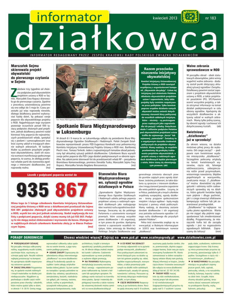 kwiecień 2013 INFORM ATOR REDAGOWA N Y PR ZE Z ZESPÓŁ KR A JOWEJ R ADY POLSKIEGO ZWIĄ ZKU DZIAŁKOWCÓW Marszałek Sejmu skierowała projekt obywatelski do pierwszego czytania w Sejmie Razem przeciwko niszczeniu inicjatywy obywatelskiej Z aledwie trzy tygodnie od złożenia podpisów pod obywatelskim projektem ustawy o ROD w Sejmie, Marszałek Ewa Kopacz skierowała go do pierwszego czytania. Zgodnie z procedurą ustawodawczą powinno się ono odbyć do 5 maja br. Czasu pozostało już więc naprawdę niewiele, dlatego działkowcy powinni wykorzystać każdy dzień, by pokazać swoje poparcie dla obywatelskiego projektu o ROD. Najpełniejszym tego wyrazem pozostaje oczywiście ponad 930 tysięcy podpisów złożonych pod projektem, jednak działkowcy powinni nadal kierować listy poparcia do najważniejszych przedstawicieli władz, spotykać się z posłami i samorządowcami oraz brać czynny udział w trwających obecnie walnych zebraniach. W każdym klubie są posłowie przychylni projektowi obywatelskiemu. Jeżeli ich starania wzmocni manifestacja społecznego poparcia, to szansa, że zdołają przekonać władze partii do stanowiska zgodnego z interesami działkowców, jest naprawdę realna. (mz) Fot: Prezes PZD Eugeniusz Kondracki i Prezydent Biura Międzynarodowego Chris Zijdeveld Spotkanie Biura Międzynarodowego w Luksemburgu W dniach 8 i 9 marca br. w Luksemburgu odbyło się posiedzenie Biura Międzynarodowego Ogrodów Działkowych i Rodzinnych. Polski Związek Działkowców reprezentowali: prezes PZD Eugeniusz Kondracki oraz pełnomocnicy Komitetu Inicjatywy Ustawodawczej Projektu Ustawy o ROD mec. Bartłomiej Piech i mec. Tomasz Terlecki. Jeden z najważniejszych tematów obrad poświęcony był aktualnej sytuacji polskich działkowców. Członkowie Biura wyrazili swoje pełne poparcie dla PZD i jego działań podejmowanych w obronie ogrodów. Na zakończenie skierowali list do przedstawicieli władz RP – prezydenta Bronisława Komorowskiego, premiera Donalda Tuska, Marszałek Sejmu Ewy Kopacz, Marszałka Senatu Bogdana Borusewicza. (mz) Licznik z podpisami poparcia wzrósł do 935 867 Mimo tego że 5 lutego członkowie Komitetu Inicjatywy Ustawodawczej projektu Ustawy o ROD wraz z działkowcami przekazali do Sejmu 924 801 podpisów złożonych pod obywatelskim projektem ustawy o ROD, wynik ten nie jest jednak ostateczny. Nadal napływają do nas listy z podpisami poparcia, dzięki czemu mamy ich już 935 867. Podpisy te nie mogą zostać zlekceważone i wyrzucone do kosza. Dlatego też w najbliższych dniach członkowie Komitetu złożą je w Biurze Podawczym Sejmu. (mz) PORADY OGRODNICZE f PORZĄDKUJEMY DZIAŁKĘ Na początku miesiąca odkrywamy rośliny, wygrabiamy resztki ściółek, zaschnięte liście, wycinamy zaschnięte pędy bylin. Resztki roślinne najlepiej przeznaczyć na kompost. Po uprzątnięciu działki rozpoczynamy wiosenne uprawki. f ZAKAZ SPALANIA Przypominamy, że spalanie resztek roślinnych i innych materiałów na działce jest niedopuszczalne. Wyjątkiem są pochodzące z działki części roślin porażone przez choroby i szkodniki, które można spalać tylko w dzień, w okresie 1 X–30 IV. Gminy mogą nr 183 Stanowisko Biura Międzynarodowego ws. sytuacji ogrodów działkowych w Polsce „Zgromadzenie Ogólne Międzynarodowego Biura Ogrodów Działkowych i Rodzinnych udziela pełnego poparcia projektowi ustawy o rodzinnych ogrodach działkowych jako realizującego idee i wartości ruchu ogrodnictwa działkowego. Zwracamy się do polskiego Parlamentu o ustanowienie rozwiązań prawnych, które uszanują wszystkie prawa działkowców i ich organizacji, w tym prawa do gruntów. Apelujemy również o zaprzestanie wszelkich inicjatyw, które zmierzają do likwidacji Polskiego Związku Działkowców oraz Komitet Inicjatywy Ustawodawczej Projektu Ustawy o ROD nawiązał współpracę z organizatorami kampanii „Obywatele decydują”. Celem tej inicjatywy jest ułatwienie Polakom składania obywatelskich projektów ustaw i zapewnienie, żeby takie projekty były rzetelnie rozpatrywane przez polityków. Tylko bowiem poprzez wspólne działania samych obywateli można zmienić dotychczasowy stosunek klasy politycznej do wszelkich oddolnych inicjatyw, które – niestety – są postrzegane przez rządzących jako zagrożenie dla ich pozycji i władzy. Dotychczas około 5 milionów podpisów Polaków pod obywatelskimi projektami ustaw trafiło do sejmowego „kosza” lub sejmowej „zamrażarki”. Świadczy to o negatywnym stosunku środowisk politycznych do projektów obywatelskich. Mamy nadzieję, że wspólnie przełamiemy złą praktykę traktowania projektów obywatelskich, a projekt ustawy o rodzinnych ogrodach działkowych będzie pierwszym z wielu, które staną się obowiązującym prawem. (ah) generalnego zniesienia obecnych praw do gruntów zajętych przez ogrody działkowe. Jesteśmy przekonani, że takie działania są sprzeczne z interesem działkowców i mogą stanowić poważne zagrożenie dla wielu polskich ogrodów. Liczymy, że w Polsce, podobnie jak u innych członków wspólnoty europejskiej, ogrody działkowe - tereny przyjazne społecznościom miejskim i służące ogółowi - będą mogły korzystać z pomocy władz publicznych. Mamy nadzieję, że doceniony zostanie dorobek działkowców i ich organizacji oraz potrzeba zachowania ogrodów i silnego ruchu działkowego dla przyszłych pokoleń Polaków”. Pełna treść stanowiska znajduje się na www.pzd.pl, w Biuletynie Informacyjnym nr 3/2013 oraz kwietniowym numerze „działkowca”. Walne zebrania sprawozdawcze w ROD W porządku obrad - obok statutowych obowiązków, jakie winny wypełnić walne zebrania - dodany został punkt dotyczący aktualnej sytuacji ogrodów i Związku. Działkowcy powinni zostać zapoznani z projektem obywatelskim ustawy o ROD, a także projektami poselskimi (PO, SP).Powinni ocenić wszystkie projekty, a także otrzymać informacje na temat dzi
