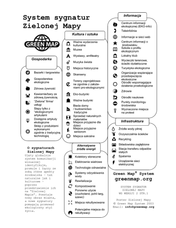 System sygnatur Zielonej Mapy Kultura i sztuka Gospodarka a Bazarki i targowiska ¤ Gospodarstwa ekologiczne A Zdrowa żywność ~ Kawiarnie/bary ze zdrową żywnością “Zielona” firma/ usługi Slepy tylko z “ekologicznymi artykułami Dostępne artykuły ekologiczne Sklep z produktami wykonanymi zgodnie z tradycyjną technologią k G g } F , Centrum informacji ekologicznej (EKO-info) Teleinfolinia H Informacje w sieci web o Ważne wydarzenia kulturalne n : Muzea N Centrum informacji o środowiskiu Szkoła o profilu ekologicznym e Wystawy, amfiteatry ª Lokalny klub Œ Muzyka świata Ô Wycieczki terenowe, ścieżki dydaktyczne c Miejsca historyczne h Turystyka ekologiczna C Skanseny \ D Tereny zaprojektowane zgodnie z założeniami pro-ekologicznymi O Organizacje wspierające przedsięwzięcia ekologiczne Ośrodki wspomagające działania proekologiczne b Eko-budynki p Zdrowie B Ważne budynki ˆ Ośrodki naukowe ´ Punkty monitoringu środowiska Wyznaczone miejsca na protest £ Bieda domy / budownictwo tradycyjne Sprzedaż naturalnych materiałów Miejsce przyjazne dla dzieci Miejsce przyjazne seniorom P Miejsca sakralne › d ƒ E Infrastruktura i ‡ I Kolektory słoneczne 1 ! J @ ™ # Elektrownie wiatrowe º j Systemy odzyskiwania wody | 2 Rewitalizacja Alternatywne źródła energii O sygnaturach Zielonej Mapy Ujęty globalnie system komunikacji wizualnej identyfikuje, promuje i łączy ze sobą różne apekty środowiska – tak naturalne jak i kulturowe – poprzez przedstawienie ich na “Zielonej Mapie”. Powstaje nowy obraz miasta, a nowe sygnatury pomagają promować ekologiczny styl życia. Informacja / Technologie odnawialne Kompostowanie Ponowne użycie (ciucholand, pchli targ, szewc) * Miejsca rekultywowane ¶ Potencjalne miejsca do rekultywacji Źródła wody pitnej Urządzenie sieci elektrycznej Oczyszczalnia ścieków Recykling Składowiska zagłębione Stacja transferu odpadów stałych Spalarnia Green Map® System greenmap.org SYSTEM SYGNATUR ZIELONEJ MAPY WG WERSJI 2 STR.1 Poster Zielonej Mapy © Green Map System 2003 Email: [email protected] System sygnatur Zielonej Mapy, wg wersji 2 Natura: Ląd i Woda str..2 x t u Park nad wodą W Lasy publiczne / tereny naturalne Bagna i podmokłości Parki/tereny rekreacyjne v U K Mikroklimat i prądy wodne Ciekawa forma terenu / obiekt geologiczny Otwarta przestrzeń Ó Miejsce naturalne/ informacja w r ¨ ‹ ‰ Î V > z Korytarz ekologiczny . Działki (nie będące własnością prywatną) Z S Wyjątkowy ogród Obiekt wodny Kemping ¡ ¥ Zabawa na śniegu y Miejsce do patrzenia w gwiazdy Y Wspaniałe widoki Widoki wschodu i zachodu słońca Wyjątkowe drzewo Geofity Jesienne liście Las bambusowy Zacienione bulwary Typowe zbiorowisko roślinne/ rośliny rodzime Ogród Rower L Ścieżki rowerowe/ przejazdy na jezdni Odzielne ścieżki rowerowe/przejazdy Bezpieczny parking dla rowerów Dostępność dla niepełnosprawnych Najlepsze spacery l ` ] [ " X m M μ … + = < Strefa pieszych Plac/strefa wolna od samochodów Przystań · q s Q œ ® Ptaki i miejsca obserwacji ptaków Cenne siedliska ptactwa Środowisko przybrzeżne Środowisko morskie Podmokłe siedliska Owady Punkt informacji o dzikiej przyrodzie / azyl dla zwierząt ZOO Stawy Hodowla zwierząt Wybieg dla psów Szlak przelotu ptaków Punkty toksyczności/źródła zanieczyszczeń Miejsce zniszczone Kontakt 8 § { 4 Green Map System $ Źródło zanieczyszczenia powietrza ¢ 0 9 ( & Źródło zanieczyszczenia wody Email: [email protected] Adres: PO Box 249 New York, NY 10002, USA Tel: +1 212 674 1631 Fax: +1 212 674 6206 Prom Główny przystanek transportu publicznego Lokalny przystanek transportu publicznego Lekka kolej Parkuj i jedź Stacje paliw/obsługi samochodów alternatywnych Parkuj i ładuj R † T ° ß ¬ Zbieractwo/wędkarstwo Możliwość poruszania się _ Natura: Fauna Natura: Flora Website: ? f ; 5 greenmap.org % Różne 6 Zadzwoń najpierw/ konieczne wcześniejsze umówienie się Zielona Mapa dostępna tutaj Miejsca specjalne/ sponsorzy ^ 3 ) Strefa niebezpieczna Strefa niebezpiecznego ruchu drogowego Źródło nadmiernego hałasu Ropa i gaz ziemny Plama ropy Podziemne zbiorniki Miejsce oficjalnie uznane za zanieczyszczone Punkt składowania toksycznych chemikaliów Miejsca, gdzie uwalniane są toksyczne chemikalia Wytwórnia niebezpiecznych odpadów Punkt zagospodarowania niebezpiecznych Wysypisko śmieci Górnictwo