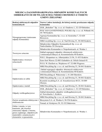 MIEJSCA ZAGOSPODAROWANIA ODPADÓW KOMUNALNYCH ODBIERANYCH OD WŁAŚCICIELI NIERUCHOMOŚCI Z TERENU GMINY ZIELONKI Rodzaj odebranych odpadów Nazwa i adres instalacji, do której zostały przekazane odpady komunalnych komunalne ZGK „Bolesław” Sp. z o.o. ul. Osadowa 1, 32-329 Bolesław. PUK VAN GANSEWINKEL POLSKA Sp. z o.o. ul. Półłanki 64, 30-740 Kraków. Niesegregowane (zmieszane odpady komunalne) Agencja Komunalna Sp. z o.o. ul. Kościelna 7, 32-620 Brzeszcze. MIKI recykling Sp. z o.o. ul. Nad Drwiną 33, 30-840 Kraków. Składowisko Odpadów Komunalnych Sp. z o.o. ul. Nadwiślańska 36 Oświęcim. Składowisko Komunalne w Niepołomicach, ul. Wodna 1. Tworzywa sztuczne Zakład segregacji odpadów zbieranych selektywnie i zmieszanych Barycz ul. Krzemieniecka 40 Kraków. P.H.U. Ekopartner os. Albertyńskie 21/56, 31-853 Kraków. Opakowania z tworzyw sztucznych Euro-Sort Wawro 32-085 Giebułtów ul. Orlich Gniazd 45. P.O.S. W. EkoSort os. Wojskowe 4/7 32-086 Węgrzce. MIKI Recykling Sp. z o.o. ul. nad Drwiną 33, 30-841 Kraków. Szkło Zakład segregacji odpadów zbieranych selektywnie i zmieszanych Barycz ul. Krzemieniecka 40 Kraków. DSS Recykling ul. Walcownia 1, 41-260 Sławków. Opakowania ze szkła Opakowania z metali MIKI Recykling Sp. z o.o. ul. nad Drwiną 33, 30-841 Kraków. Krynicki recykling S.A. ul. Iwaszkiewicza 48/23, 10-089 Olsztyn. MIKI Recykling Sp. z o.o. ul. nad Drwiną 33, 30-841 Kraków. ZGK „Bolesław” Sp. z o.o. ul. Osadowa 1, 32-329 Bolesław. Odpady wielkogabarytowe Zakład demontażu odpadów wielkogabarytowych, ul. Nowohucka 1, Kraków. MIKI Recykling Sp. z o.o. ul. nad Drwiną 33, 30-841 Kraków. Zużyte urządzenia elektryczne i Biosystem S.A. ul. Wodna 4, 30-556 Kraków. elektroniczne Tomad, ul. Kolejowa 39, 32-332 Bukowno. Gleba i ziemia, w tym kamienie, jak również zmieszane odpady z betonu, gruzu ceglanego, odpadowych materiałów ceramicznych i elementów wyposażenia Składowisko Komunalne w Niepołomicach, ul. Wodna 1. Odzież Zużyte opony Zakład demontażu odpadów wielkogabarytowych, ul. Nowohucka 1, Kraków. Zakład demontażu odpadów wielkogabarytowych, ul. Nowohucka 1, Kraków. Zakład Przerobu Złomu „Złomex S.A”ul. Igołomska 27, 31-983 Kraków. Żelazo i stal F.H.U. Agmet Szyce, 32-085 Modlnica. Leki Zakłady Sanitarne w Krakowie Sp. z .o.o. Spalarnia, ul. Dymarek 7, 31-983 Kraków. Odpady zielone SITA MAŁOPOLSKA Sp. z o.o.Kompostownia ul. Kosiarzy 5a, 30-731 Kraków. Kompostownia „Barycz”, ul. Krzemieniecka 40. Euro-Sort Wawro 32-085 Giebułtów ul. Orlich Gniazd 45. Opakowania z papieru i tektury MIKI Recykling Sp. z o.o. ul. Nad Drwiną 33, 30-841 Kraków. P.H.U. Ekopartner os. Albertyńskie 21/56, 31-853 Kraków. Papier i tektura Zakład segregacji odpadów zbieranych selektywnie i zmieszanych „Barycz”, ul. Krzemieniecka 40, Kraków. Odzież Zakład demontażu opadów wielkogabarytowych, ul. Nowohucka 1, Kraków.