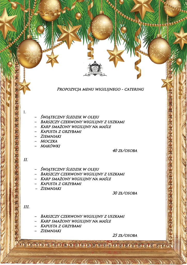 Propozycja menu wigilijnego - catering I. – – – – – – – Świąteczny śledzik w oleju Barszczy czerwony wigilijny z uszkami Karp smażony wigilijny na maśle Kapusta z grzybami Ziemniaki Moczka Makówki 40 zł/osoba – – – – – Świąteczny śledzik w oleju Barszczy czerwony wigilijny z uszkami Karp smażony wigilijny na maśle Kapusta z grzybami Ziemniaki 30 zł/osoba – – – – Barszczy czerwony wigilijny z uszkami Karp smażony wigilijny na maśle Kapusta z grzybami Ziemniaki 25 zł/osoba II. III.
