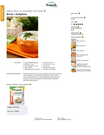 BONDUELLE / PRZEPIS / ZUPA / WEGETARIAŃSKIE / KREM Z KALAFIORA Krem z kalafiora ILOŚĆ PORCJI 4 CZAS PRZYGOTOWANIA 45 MIN OCENA 5/5 KATEGORIE WEGETARIAŃSKIE ZUPA DODANE PRZEZ TOMASZ SZYMAŃSKI PODOBNE PRZEPISY Krem z pieczarek Zupa kalafiorowa Krem z buraków Krem z młodej marchwi i pomarańczy Kalafior pod beszamelem SKŁADNIKI: SPOSÓB PRZYGOTOWANIA: Kalafior MINUTE (600 g) Marchew (1 szt.) Ziele angielskie (1-2 szt.) Mąka (4 łyżki) Natka pietruszki (do smaku) Rosół jarzynowy (1 l) Liść laurowy (1-2 szt.) Jaja (1 szt.) Śmietana 30% (60 ml) Sól i pieprz (do smaku) Zapiekanka z mielonym indykiem pod purée ziemniaczano - kalafiorowym Zupa krem z białych warzyw z chipsem pancetty i grzankami Marchew pokroić w drobną kostkę i ugotować z liściem laurowym oraz zielem angielskim w rosole. Gdy marchew będzie miękka, dodać rozmrożonego kalafiora. Z jaj i mąki przygotować ciasto i wlać je do gotującej się zupy. Chwilę gotować, dodać śmietanę. Podawać z posiekaną natką pietruszki. PRODUKTY BONDUELLE UŻYTE W PRZEPISIE Kalafior MINUTE MASA NETTO: 2500 g All rights reserved projekt i realizacja Copyright © 2012-2015 Bonduelle Agencja Reklamowa 4 ALL