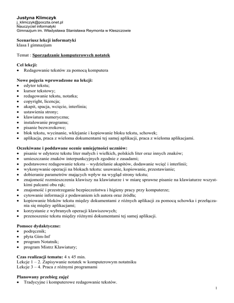 Justyna Klimczyk [email protected] Nauczyciel informatyki Gimnazjum im. Władysława Stanisława Reymonta w Kleszczowie Scenariusz lekcji informatyki klasa I gimnazjum Temat : Sporządzanie komputerowych notatek Cel lekcji: • Redagowanie tekstów za pomocą komputera Nowe pojęcia wprowadzone na lekcji: • edytor tekstu; • kursor tekstowy; • redagowanie tekstu, notatka; • copyright, licencja; • akapit, spacja, wcięcie, interlinia; • ustawienia strony; • klawiatura numeryczna; • instalowanie programu; • pisanie bezwzrokowe; • blok tekstu, wycinanie, wklejanie i kopiowanie bloku tekstu, schowek; • aplikacja, praca z wieloma dokumentami tej samej aplikacji, praca z wieloma aplikacjami. Oczekiwane i poddawane ocenie umiejętności uczniów: • pisanie w edytorze tekstu liter małych i wielkich, polskich liter oraz innych znaków; • umieszczanie znaków interpunkcyjnych zgodnie z zasadami; • podstawowe redagowanie tekstu – wydzielanie akapitów, dodawanie wcięć i interlinii; • wykonywanie operacji na blokach tekstu: usuwanie, kopiowanie, przestawianie; • dobieranie parametrów mających wpływ na wygląd strony tekstu; • znajomość rozmieszczenia klawiszy na klawiaturze i w miarę sprawne pisanie na klawiaturze wszystkimi palcami obu rąk; • znajomość i przestrzeganie bezpieczeństwa i higieny pracy przy komputerze; • cytowanie informacji z podawaniem ich autora oraz źródła; • kopiowanie bloków tekstu między dokumentami z różnych aplikacji za pomocą schowka i przełączania się między aplikacjami; • korzystanie z wybranych operacji klawiszowych; • przenoszenie tekstu między różnymi dokumentami tej samej aplikacji. Pomoce dydaktyczne: • podręcznik; • płyta Gim-Inf • program Notatnik; • program Mistrz Klawiatury; Czas realizacji tematu: 4 x 45 min. Lekcje 1 – 2. Zapisywanie notatek w komputerowym notatniku Lekcje 3 – 4. Praca z różnymi programami Planowany przebieg zajęć • Tradycyjne i komputerowe redagowanie tekstów. 1 • • • • • • • Zasady dotyczące zapisywania notatek w komputerowym notatniku. Sprawne korzystanie z klawiatury. Organizowanie miejsca pracy przy komputerze. Przenoszenie tekstu między dokumentami z dwóch różnych aplikacji. Przenoszenie tekstu między dokumentami z tej samej aplikacji. Ćwiczenie sprawdzające. Ocenienie ćwiczenia. Realizacja tematu Tradycyjne i komputerowe redagowanie tekstów. " Edytor tekstu - program komputerowy przeznaczony do tworzenia (pisania) i redagowania tekstów za pomocą komputera. Edytor umożliwia wykonywanie wielu operacji na tekstach (na pojedynczych znakach lub na całych blokach tekstu): wstawianie, usuwanie, wycinanie, formatowanie akapitów, przeszukiwanie i zastępowanie, kopiowanie, łączenie różnych dokumentów, sprawdzanie pisowni itd. Redagowanie dokumentu - nadawanie dokumentowi odpowiedniej postaci w zależności od jego treści i odbiorcy, do którego jest adresowany lub kierowany. W redagowaniu dokumentu stosuje się różne możliwości edytora tekstu, do których zalicza się np. dobór kroju, wielkości i wyróżnienia czcionek, ustalanie wielkości marginesów, włączanie ilustracji, tabel, wykresów itd. Redagowanie dokumentu na ogół dotyczy jednocześnie postaci i treści dokumentu. Notatka – krótki tekst, gdzie istotna jest informacja, którą chcemy zanotować. Mniej ważna jest forma tego zapisu, dlatego w tekście notatki zwykle nie stosuje się wyróżnień. Do przygotowania komputerowych notatek może posłużyć bardzo prosty edytor tekstu – Notatnik Zapisywanie notatek w komputerowym notatniku. Aby uruchomić program Notatnik należy: • kliknąć przycisk Start → Programy → Akcesoria → Notatnik okno programu Notatnik " Copyright (prawo autorskie) – zbiór przepisów prawa dotyczących ochrony praw autorów dzieł takich, jak: książki, filmy, piosenki, utwory muzyczne, utwory sceniczne, obrazy malarstwa, grafiki, a także programy komputerowe. Licencja – Zezwolenie na korzystanie z dzieła, takiego np. jak program komputerowy, które jest objęte prawem autorskim. Licencja dołączona przez producenta do programu jest dokumentem, który uprawnia nabywcę programu do legalnego korzystania z niego. Korzystanie z programu bez licencji jest niezgodne 2 z obowiązującym prawem autorskim. Ćwiczenie: Poszukaj słów „copyright” i licencja” w leksykonie SLI na płycie Gim-Inf. Zapisz w zeszycie objaśnienia obu słów. Zasady pisania Pisanie znaków na klawiaturze • Miejsce, w którym jest wstawiany znak na ekranie, wyznacza kursor tekstowy mający postać migającej pionowej kreski |. • Klawisze z literami służą do pisania małych liter. Przykłady: akwamaryna, stok. • Wielką literę otrzymuje się przez jednoczesne naciśnięcie klawisza Shift i klawisza z literą. Przykłady: BRAWO, OK. • Naciśnięcie prawego klawisza Alt i klawisza z literą daje małą polską literę. Przykłady: gęś, żółw. • Litera ź to Alt i x. Przykłady: źdźbło, źrebak. • Dołączenie do tego klawisza Shift powoduje wyświetlenie wielkiej polskiej litery. Przykłady: DŹBÓW, ŁÓDŹ. • Cyfrę lub znak z dolnej części klawisza uzyskuje się po naciśnięciu tego klawisza. Przykłady: 1/2, 9-3, 30. • Znak z górnej części klawisza otrzymuje się przez jednoczesne naciśnięcie klawisza Shift i klawisza ze znakiem. Przykłady: +, (, ), @, _. Znaki interpunkcyjne w tekście drukowanym • Między wyrazami w tekście wstawiamy tylko jeden znak odstępu (odstęp nazywany jest też spacją). • Większość znaków interpunkcyjnych stawiamy bezpośrednio po poprzedzającym je wyrazie, a za znakiem dodajemy jeden odstęp. • Do poprzedzającego wyrazu "przykleja się" następujące znaki: przecinek, kropkę, dwukropek, średnik, pytajnik, wykrzyknik. Przykłady: Czy tak? Dobrze! • Inaczej zapisujemy zwroty w nawiasach (oznaczające np. wtrącenia) i w cudzysłowach "tu przytaczamy cyt