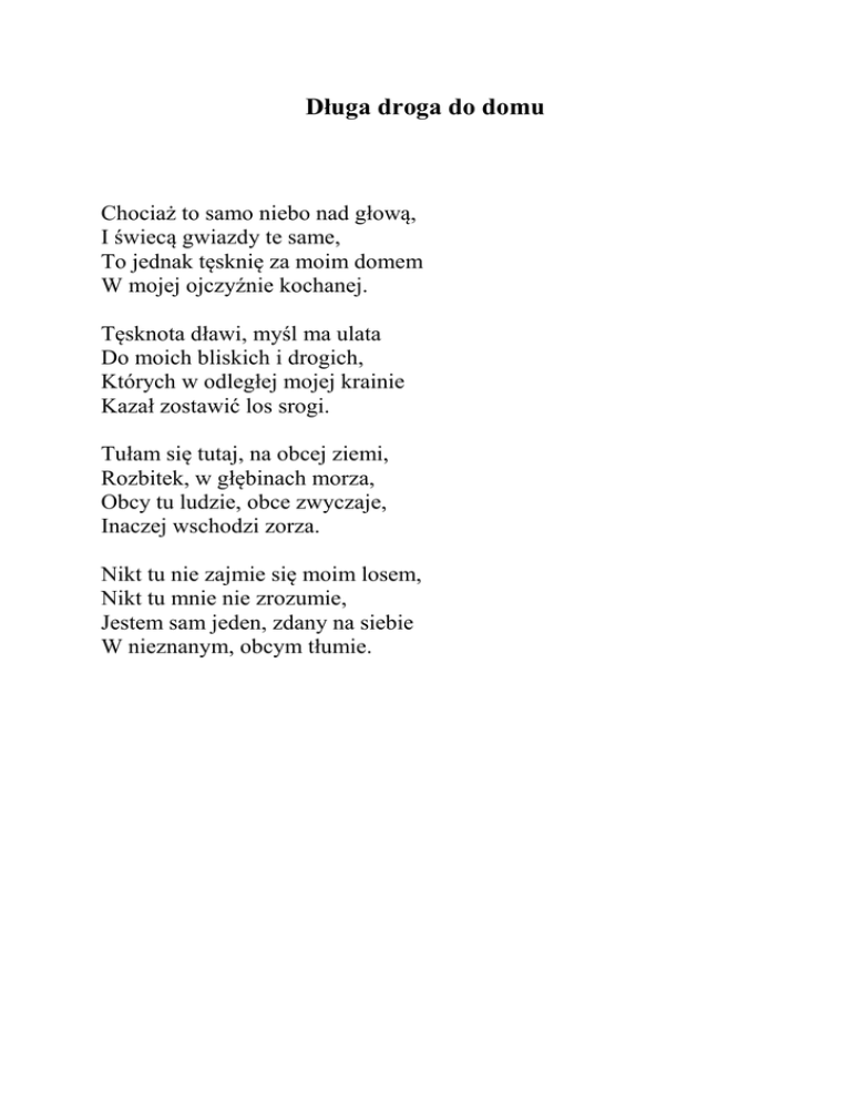 Długa droga do domu Chociaż to samo niebo nad głową, I świecą gwiazdy te same, To jednak tęsknię za moim domem W mojej ojczyźnie kochanej. Tęsknota dławi, myśl ma ulata Do moich bliskich i drogich, Których w odległej mojej krainie Kazał zostawić los srogi. Tułam się tutaj, na obcej ziemi, Rozbitek, w głębinach morza, Obcy tu ludzie, obce zwyczaje, Inaczej wschodzi zorza. Nikt tu nie zajmie się moim losem, Nikt tu mnie nie zrozumie, Jestem sam jeden, zdany na siebie W nieznanym, obcym tłumie.