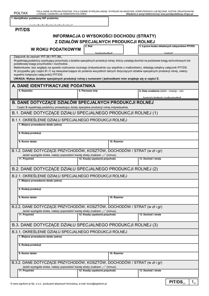 POLA JASNE WYPEŁNIA PODATNIK, POLA CIEMNE WYPEŁNIA URZĄD. WYPEŁNIĆ NA MASZYNIE, KOMPUTEROWO LUB RĘCZNIE, DUŻYMI, DRUKOWANYMI LITERAMI, CZARNYM LUB NIEBIESKIM KOLOREM. Składanie w wersji elektronicznej: www.portalpodatkowy.mf.gov.pl POLTAX 1. Identyfikator podatkowy NIP podatnika PIT/DS INFORMACJA O WYSOKOŚCI DOCHODU (STRATY) Z DZIAŁÓW SPECJALNYCH PRODUKCJI ROLNEJ 3. Łączna liczba składanych załączników PIT/DS 2. Rok W ROKU PODATKOWYM Załącznik do zeznań: PIT-36 i PIT-36L. Wypełniają podatnicy uzyskujący przychody z działów specjalnych produkcji rolnej, którzy ustalają dochód na podstawie ksiąg rachunkowych lub podatkowej księgi przychodów i rozchodów. Małżonkowie, bez względu na sposób rozliczenia rocznego (indywidualnie czy wspólnie z małżonkiem), składają odrębny załącznik PIT/DS. W przypadku gdy części B i C są niewystarczające do podania wszystkich danych dotyczących działów specjalnych produkcji rolnej, należy wypełnić kolejny(e) załącznik(i) PIT/DS. UWAGA: Wykaz działów specjalnych produkcji rolnej z numerami i jednostkami miar znajduje się w części E. A. DANE IDENTYFIKACYJNE PODATNIKA 4. Nazwisko 5. Pierwsze imię 6. Data urodzenia (dzień - miesiąc - rok) B. DANE DOTYCZĄCE DZIAŁÓW SPECJALNYCH PRODUKCJI ROLNEJ Część B wypełniają podatnicy prowadzący działy specjalne produkcji rolnej indywidualnie. B.1. DANE DOTYCZĄCE DZIAŁU SPECJALNEGO PRODUKCJI ROLNEJ (1) B.1.1. OKREŚLENIE DZIAŁU SPECJALNEGO PRODUKCJI ROLNEJ 7. Miejsce prowadzenia działu (adres) 8. Rodzaj produkcji 9. Numer działu 10. Rozmiar B.1.2. DANE DOTYCZĄCE PRZYCHODÓW, KOSZTÓW, DOCHODÓW / STRAT (w zł i gr) Jeżeli wystąpiła strata, należy poprzedzić kwotę straty znakiem „─” (minus). 11. Przychód 12. Koszty uzyskania przychodu 13. Dochód / strata B.2. DANE DOTYCZĄCE DZIAŁU SPECJALNEGO PRODUKCJI ROLNEJ (2) B.2.1. OKREŚLENIE DZIAŁU SPECJALNEGO PRODUKCJI ROLNEJ 7. Miejsce prowadzenia działu (adres) 8. Rodzaj produkcji 9. Numer działu 10. Rozmiar B.2.2. DANE DOTYCZĄCE PRZYCHODÓW, KOSZTÓW, DOCHODÓW / STRAT (w zł i gr) Jeżeli wystąpiła strata, należy poprzedzić kwotę straty znakiem „─” (minus). 11. Przychód 12. Koszty uzyskania przychodu 13. Dochód / strata B.3. DANE DOTYCZĄCE DZIAŁU SPECJALNEGO PRODUKCJI ROLNEJ (3) B.3.1. OKREŚLENIE DZIAŁU SPECJALNEGO PRODUKCJI ROLNEJ 7. Miejsce prowadzenia działu (adres) 8. Rodzaj produkcji 9. Numer działu 10. Rozmiar B.3.2. DANE DOTYCZĄCE PRZYCHODÓW, KOSZTÓW, DOCHODÓW / STRAT (w zł i gr) Jeżeli wystąpiła strata, należy poprzedzić kwotę straty znakiem „─” (minus). 11. Przychód 12. Koszty uzyskania przychodu © www.signform.pl Sp. z o.o., producent aktywnych formularzy, e-mail: [email protected] 13. Dochód / strata PIT/DS(1) 1/4 POLA JASNE WYPEŁNIA PODATNIK, POLA CIEMNE WYPEŁNIA URZĄD. WYPEŁNIĆ NA MASZYNIE, KOMPUTEROWO LUB RĘCZNIE, DUŻYMI, DRUKOWANYMI LITERAMI, CZARNYM LUB NIEBIESKIM KOLOREM. Składanie w wersji elektronicznej: www.portalpodatkowy.mf.gov.pl POLTAX C. DANE DOTYCZĄCE DZIAŁÓW SPECJALNYCH PRODUKCJI ROLNEJ Część C wypełniają podatnicy prowadzący działy specjalne produkcji rolnej wspólnie z innym podatnikiem/podatnikami lub w formie spółki niebędącej osobą prawną. C.1. DANE DOTYCZĄCE DZIAŁU SPECJALNEGO PRODUKCJI ROLNEJ (1) C.1.1. OKREŚLENIE DZIAŁU SPECJALNEGO PRODUKCJI ROLNEJ 14. Miejsce prowadzenia działu (adres) 15. Rodzaj produkcji 16. Numer działu 17. Rozmiar 18. Udział podatnika % C.1.2. DANE DOTYCZĄCE PRZYCHODÓW, KOSZTÓW, DOCHODÓW / STRAT (w zł i gr) Jeżeli wystąpiła strata, należy poprzedzić kwotę straty znakiem „─” (minus). Przychód łączny Koszty uzyskania przychodu łączne przypadający na podatnika 20. 19. 21. Dochód/strata łączny (-na) przypadające na podatnika 22. przypadający (-ca) na podatnika 24. 23. C.2. DANE DOTYCZĄCE DZIAŁU SPECJALNEGO PRODUKCJI ROLNEJ (2) C.2.1. OKREŚLENIE DZIAŁU SPECJALNEGO PRODUKCJI ROLNEJ 14. Miejsce prowadzenia działu (adres) 15. Rodzaj produkcji 16. Numer działu 17. Rozmiar 18. Udział podatnika % C.2.2. DANE DOTYCZĄCE PRZYCHODÓW, KOSZTÓW, DOCHODÓW / STRAT (w zł i gr) Jeżeli wystąpiła strata, strata należy poprzedzić kwotę straty znakiem „─” (minus) (minus). Przychód łączny Koszty uzyskania przychodu łączne przypadający na podatnika 20. 19. 21. Dochód/strata łączny (-na) przypadające na podatnika 22. 23. przypadający (-ca) na podatnika 24. C.3. DANE DOTYCZĄCE DZIAŁU SPECJALNEGO PRODUKCJI ROLNEJ (3) C.3.1. OKREŚLENIE DZIAŁU SPECJALNEGO PRODUKCJI ROLNEJ 14. Miejsce prowadzenia działu (adres) 15. Rodzaj produkcji 16. Numer działu 17. Rozmiar 18. Udział podatnika % C.3.2. DANE DOTYCZĄCE PRZYCHODÓW, KOSZTÓW, DOCHODÓW / STRAT (w zł i gr) Jeżeli wystąpiła strata, należy poprzedzić kwotę straty znakiem „─” (minus). Przychód łączny 20. 19. Koszty uzyskania przychodu łączne przypadający na podatnika 21. Dochód/strata łączny (-na) przypadające na podatnika 22. 23. przypadający (-ca) na podatnika 24. D. ŁĄCZNY PRZYCHÓD, KOSZTY, DOCHÓD LUB STRATA PODATNIKA Z DZIAŁÓW SPECJALNYCH PRODUKCJI ROLNEJ (w zł i gr) 1) Kwoty wynikające z poz. od 25 do 28 należy wpisać odpowiednio do poz. 59–62 lub poz. 110–113 zeznania PIT-36 albo do poz. 18–21 zeznania PIT-36L. 25. Przychody (suma kwot ze wszystkich poz. 11 i 20) 26. Koszty uzyskania przychodów (suma kwot ze wszystkich poz. 12 i 22) 27. Dochód (jeżeli kwota z poz. 25 jest większa od kwoty z poz. 26, od kwoty z poz. 25 należy odjąć kwotę z poz. 26) 28. Strata (jeżeli kwota z poz. 26 jest większa od kwoty z poz. 25, od kwoty z poz. 26 należy odjąć kwotę z poz. 25) 1) Jeżeli podatnik składa więcej niż jeden załącznik PIT/DS, część D wypełnia na jednym załączniku, z tym że w części D w poz. 25 i 26 sumuje odpowiednie kwoty ze wszystkich załączników załączników. PIT/DS(1) 2/4 POLTAX POLA JASNE WYPEŁNIA 